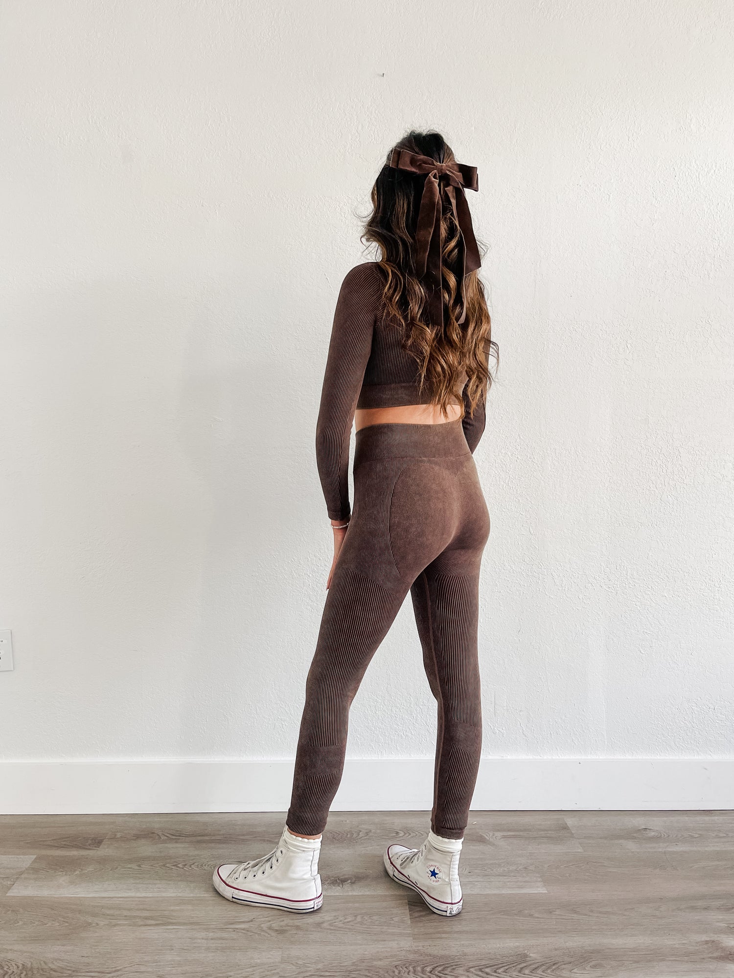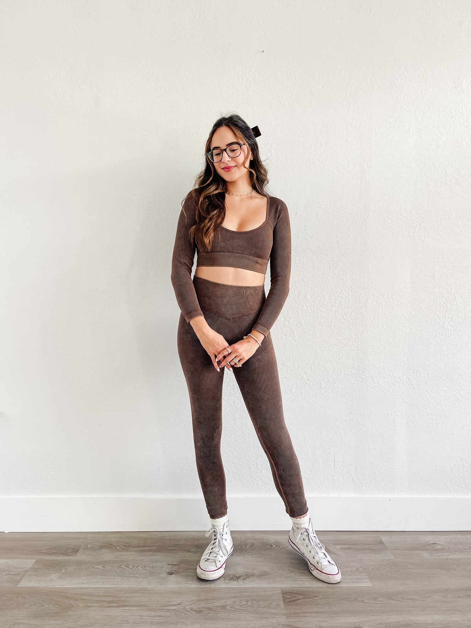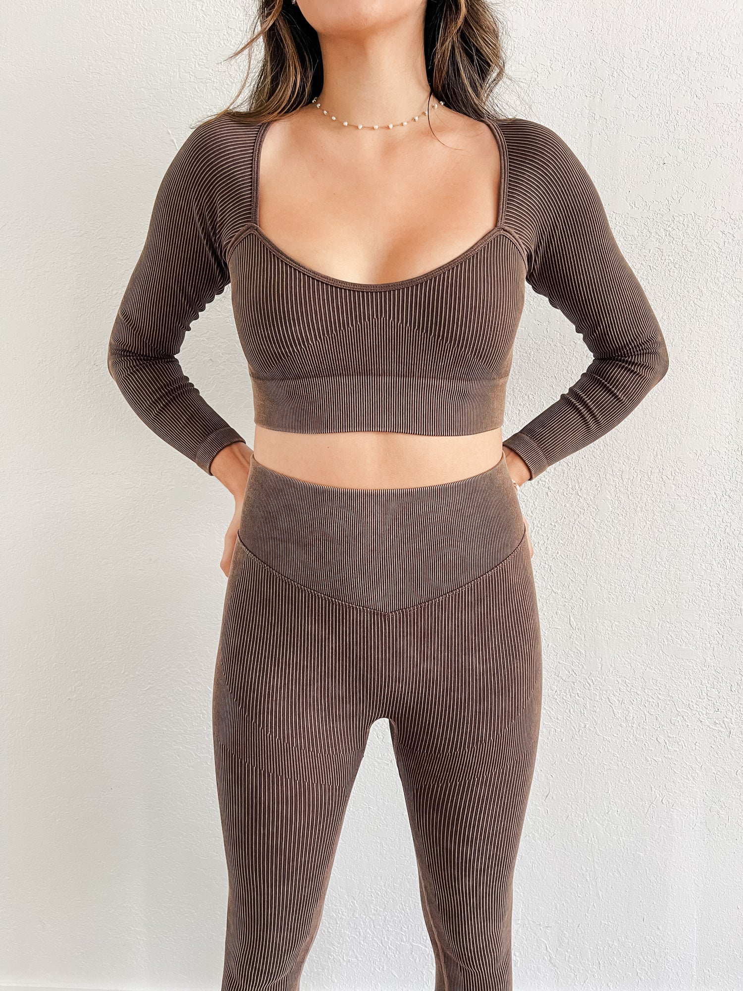 Set features mineral wash, seamless long sleeve crop top & legging set