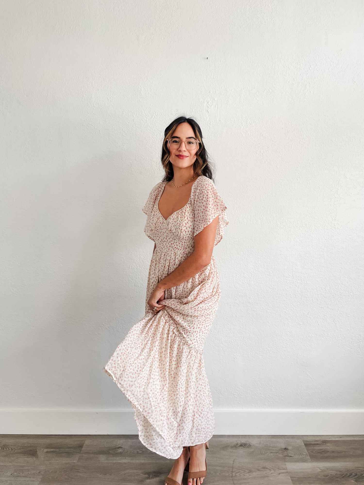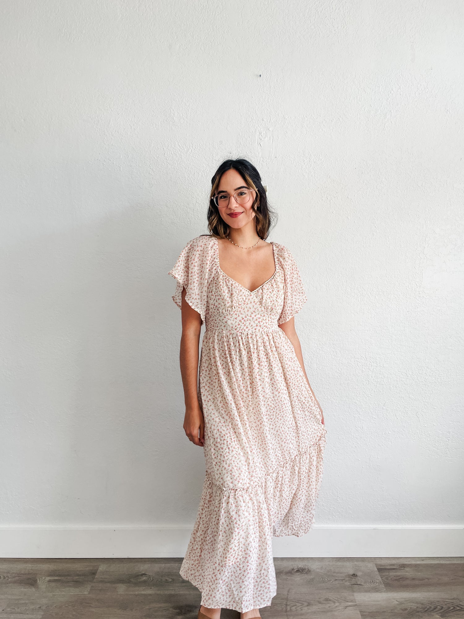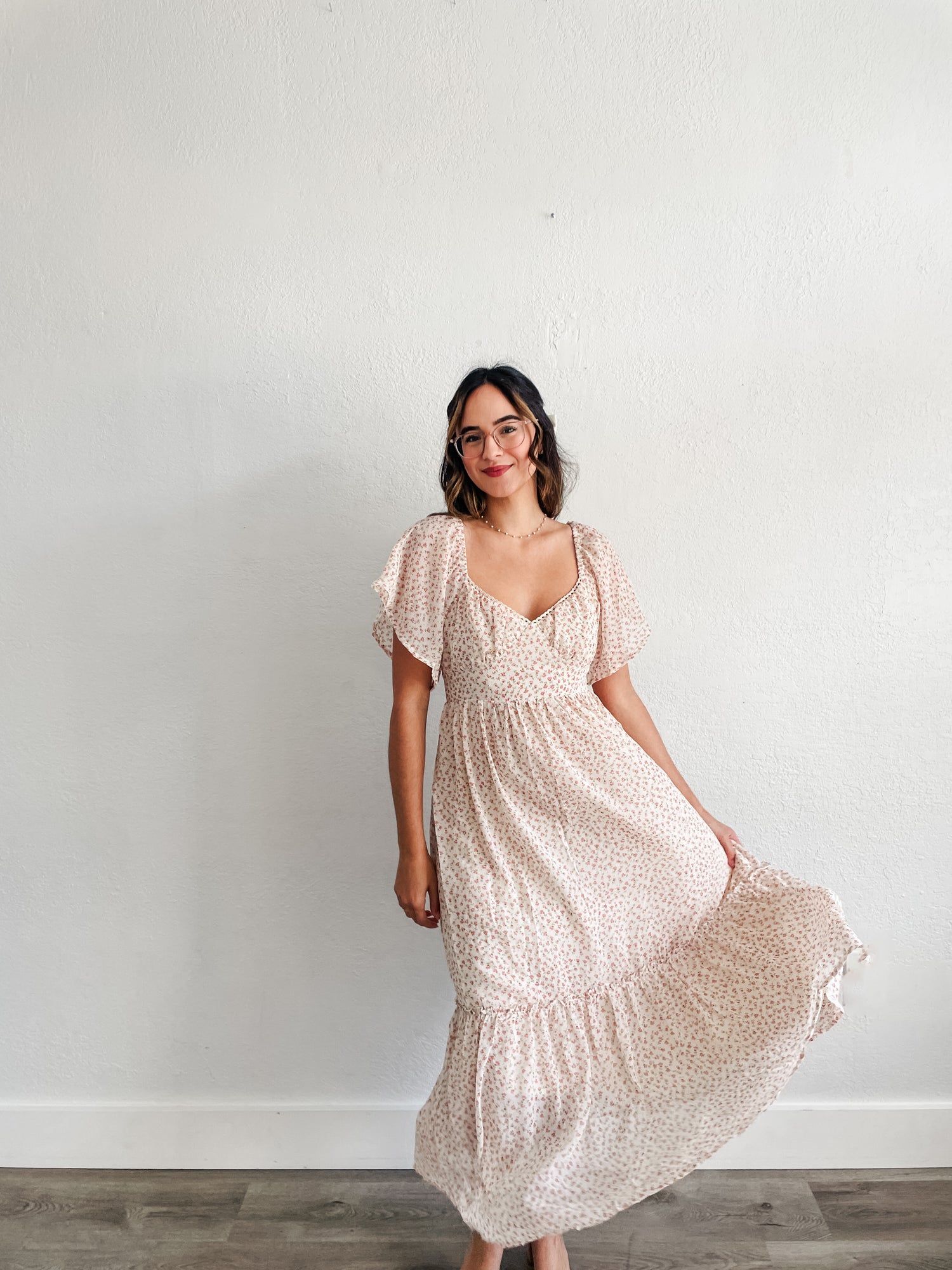 Dress features ditsy floral print, sweetheart neckline midi dress, full lining, back smocking and lace detail around the neckline.