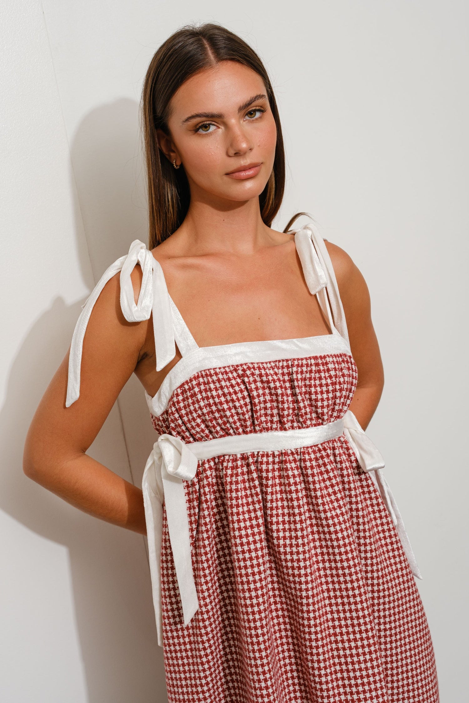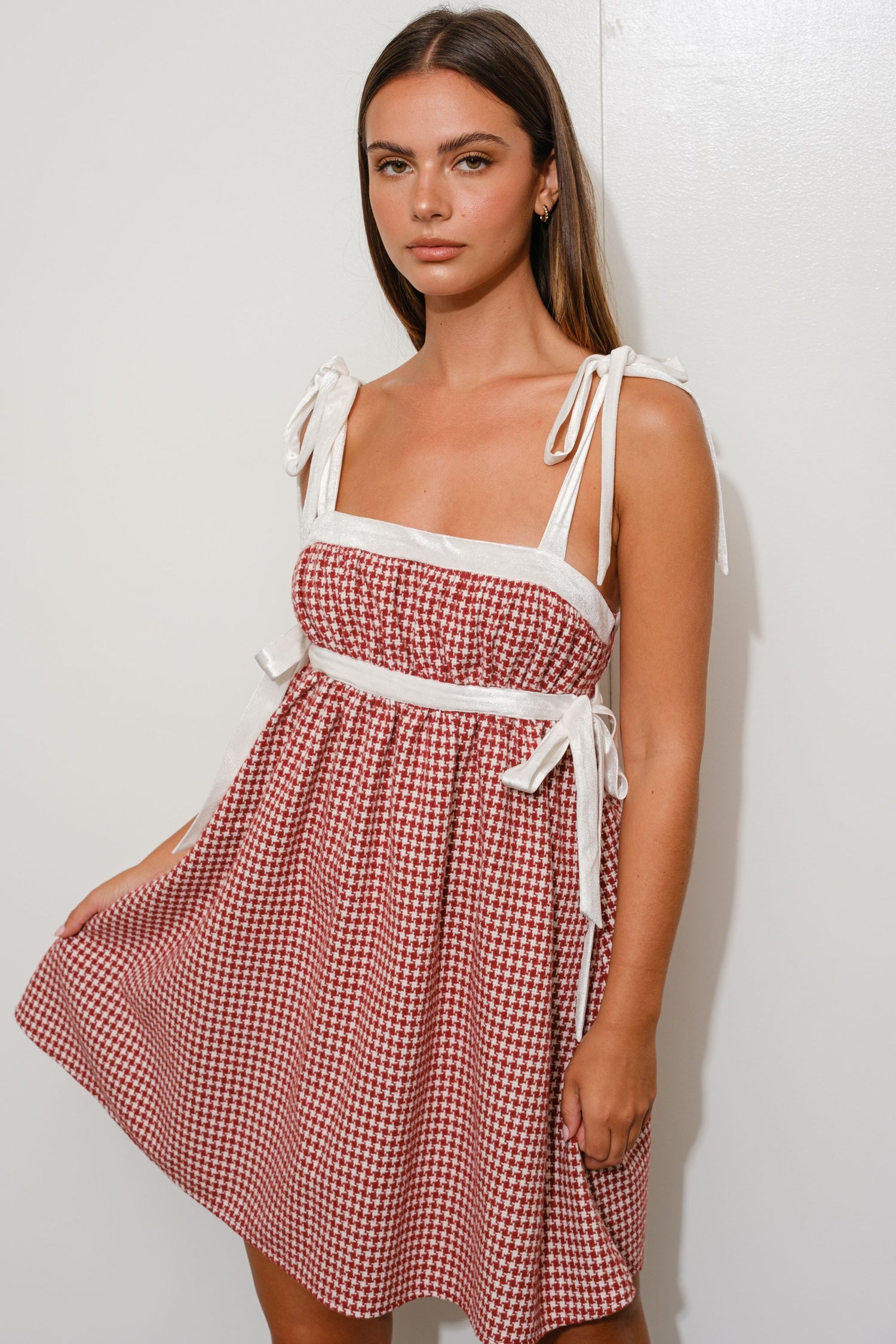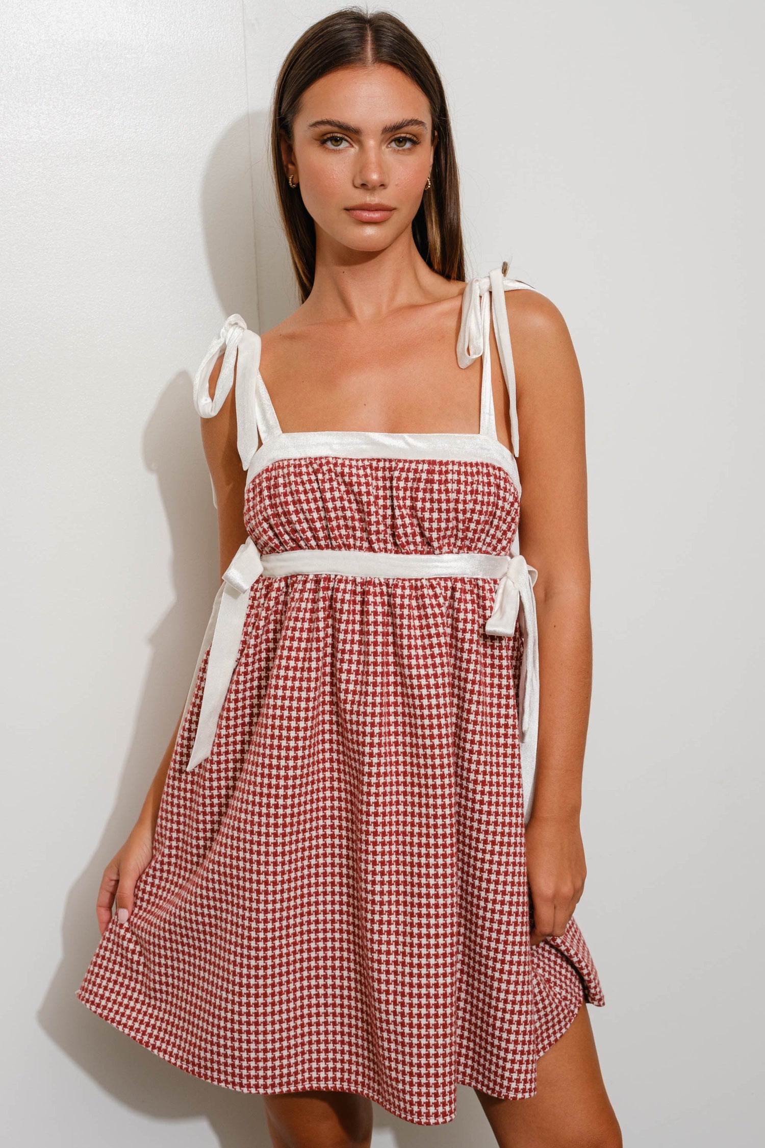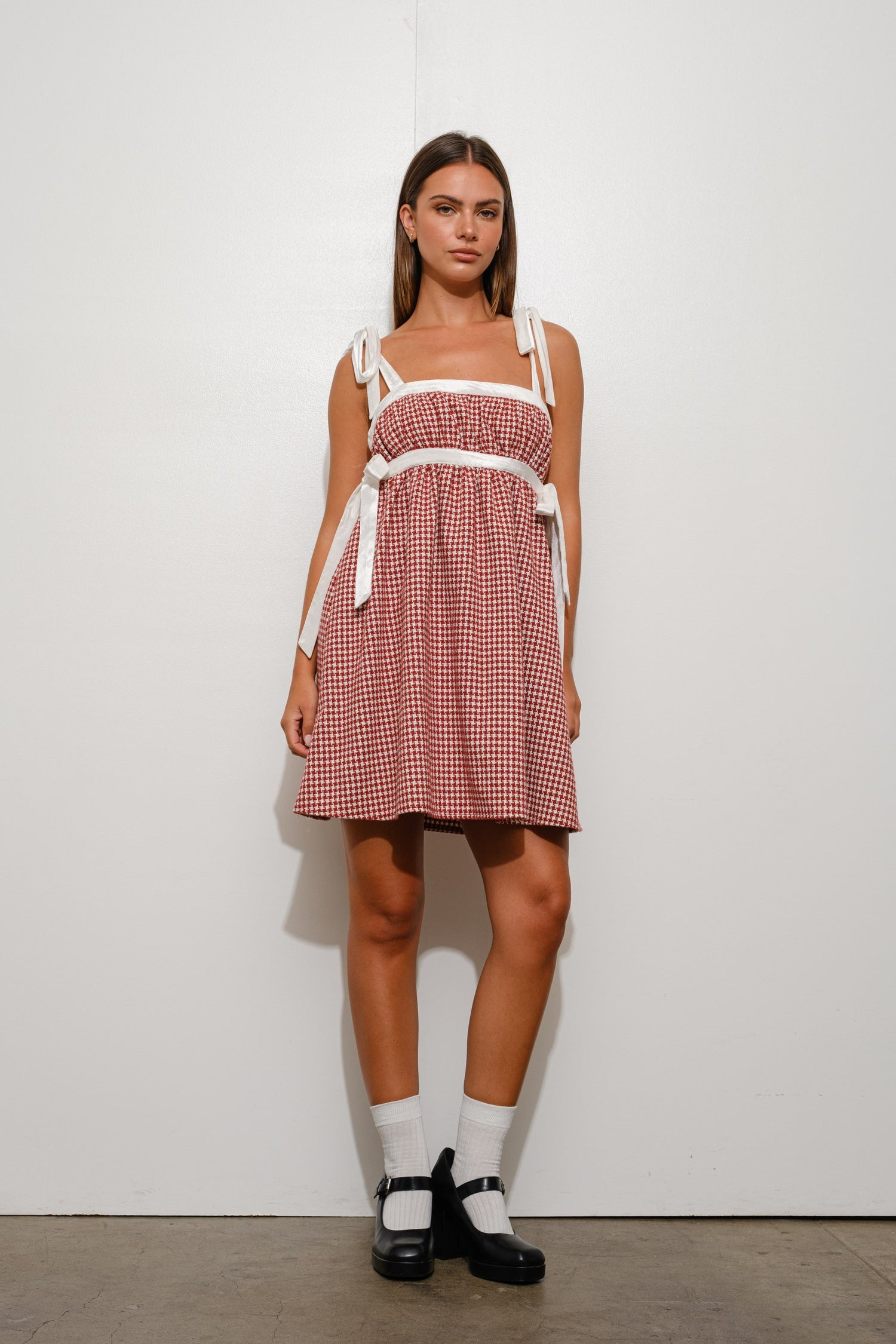Dress features houndstooth tweed material, contrast velvet straps, square neckline, bow detail, mini length, hidden back zipper. Lined.