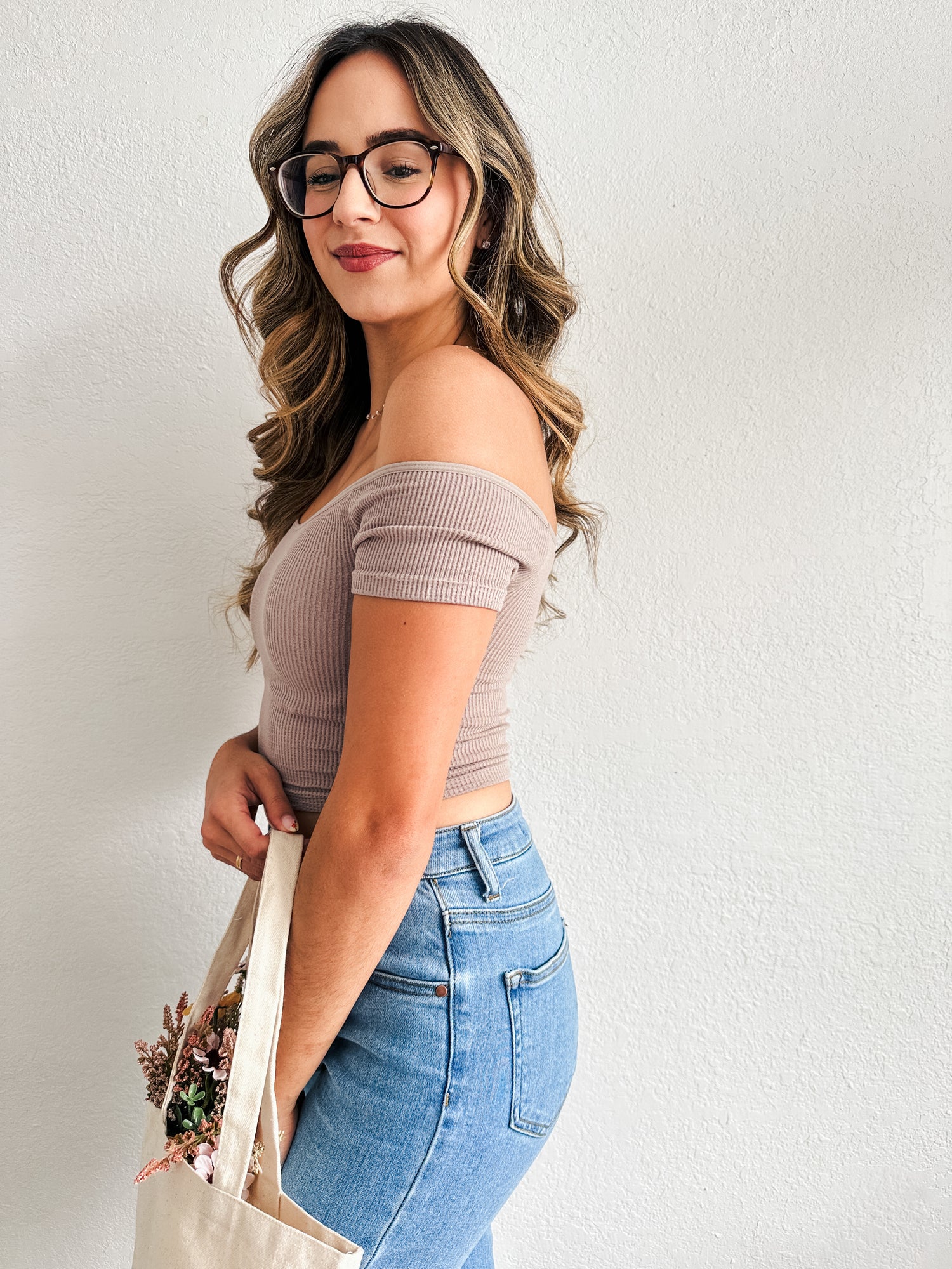 Top features knit material, stretchy, seamless off the shoulder and crop length.