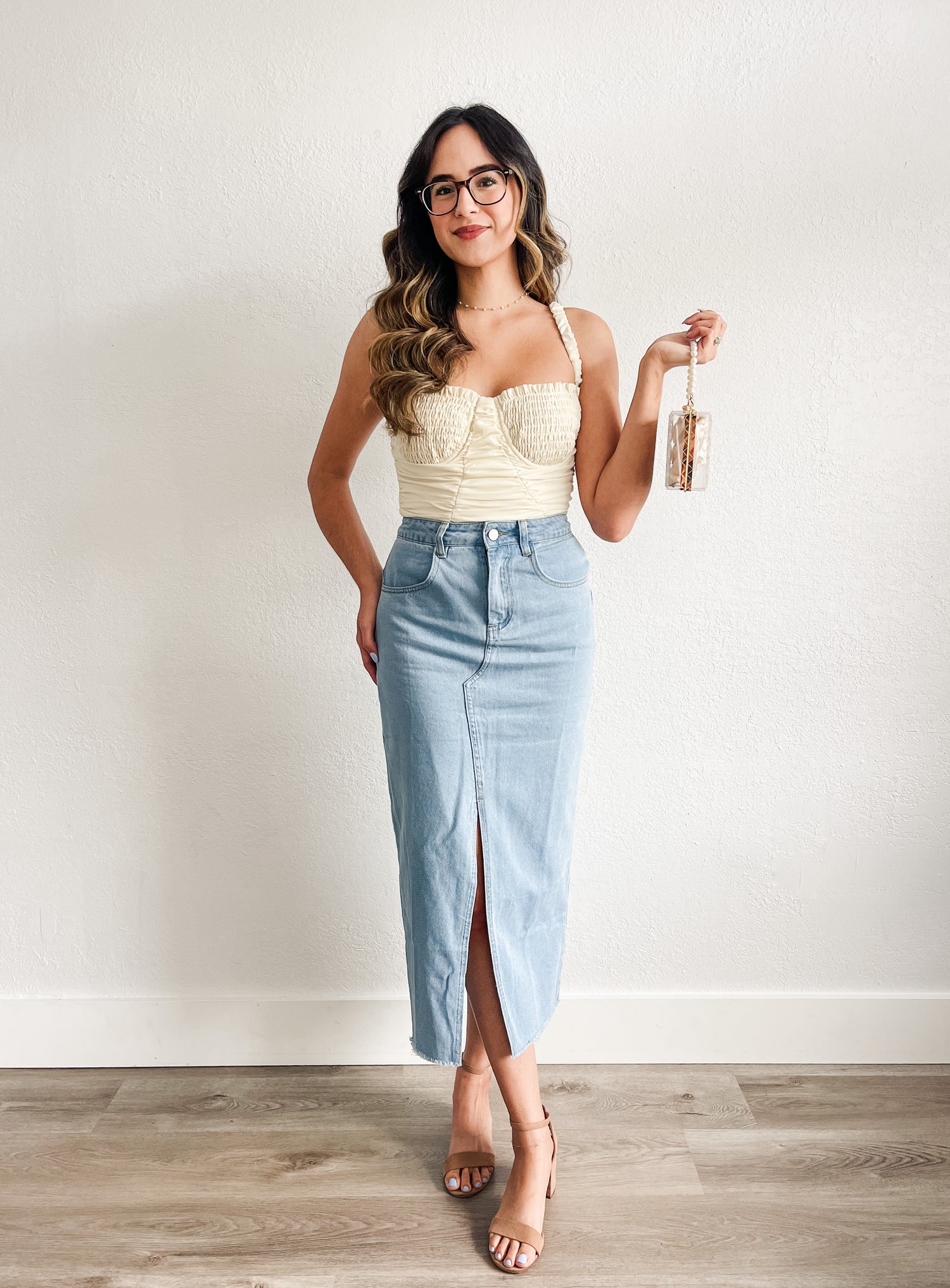 Top features gathered panels, bustier design, zipper back, crinkled straps and smocked bust.