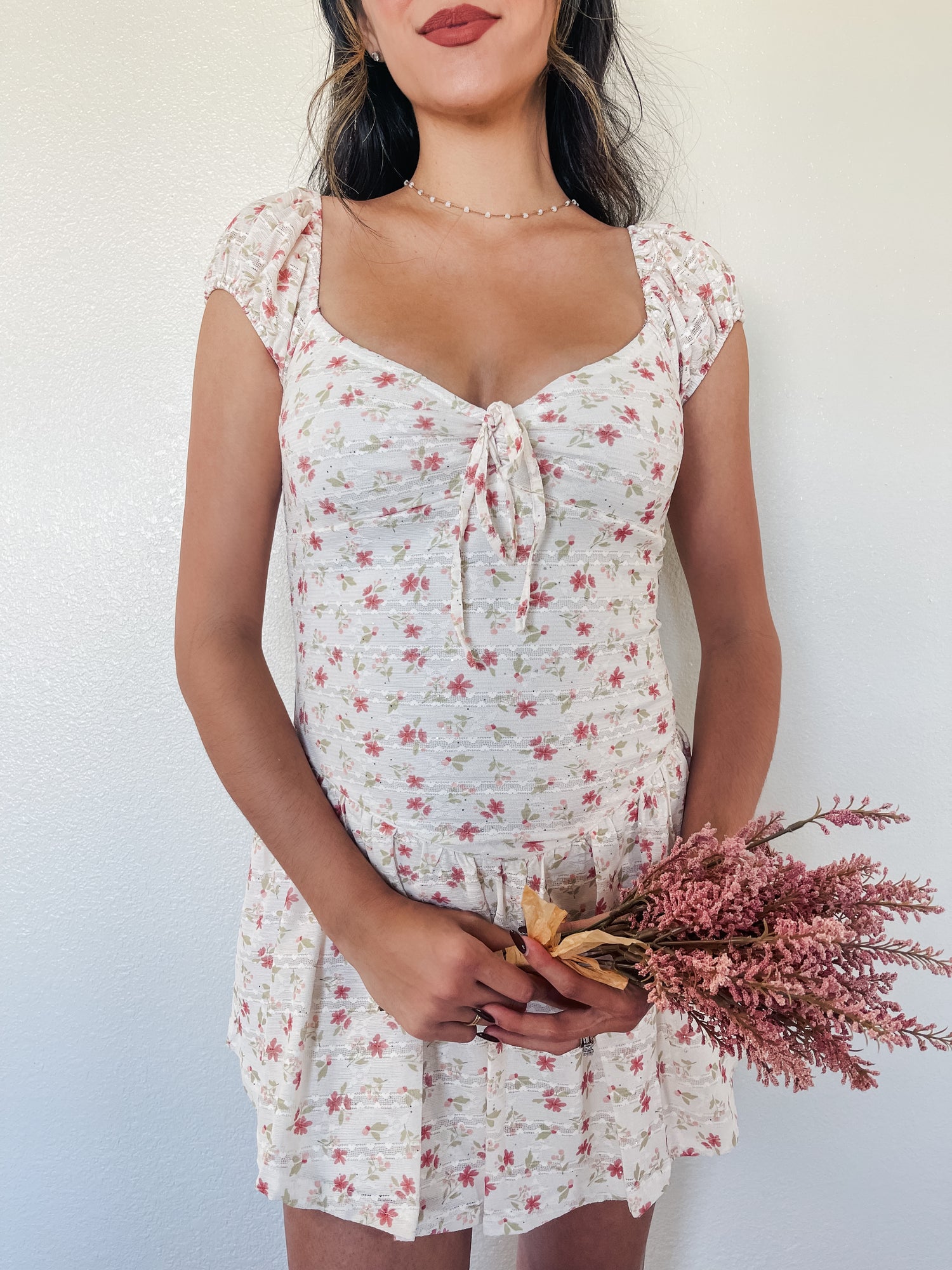Dress features ditsy floral print, lined, stretchy, ballet style dress, front tie detail, lace knit.