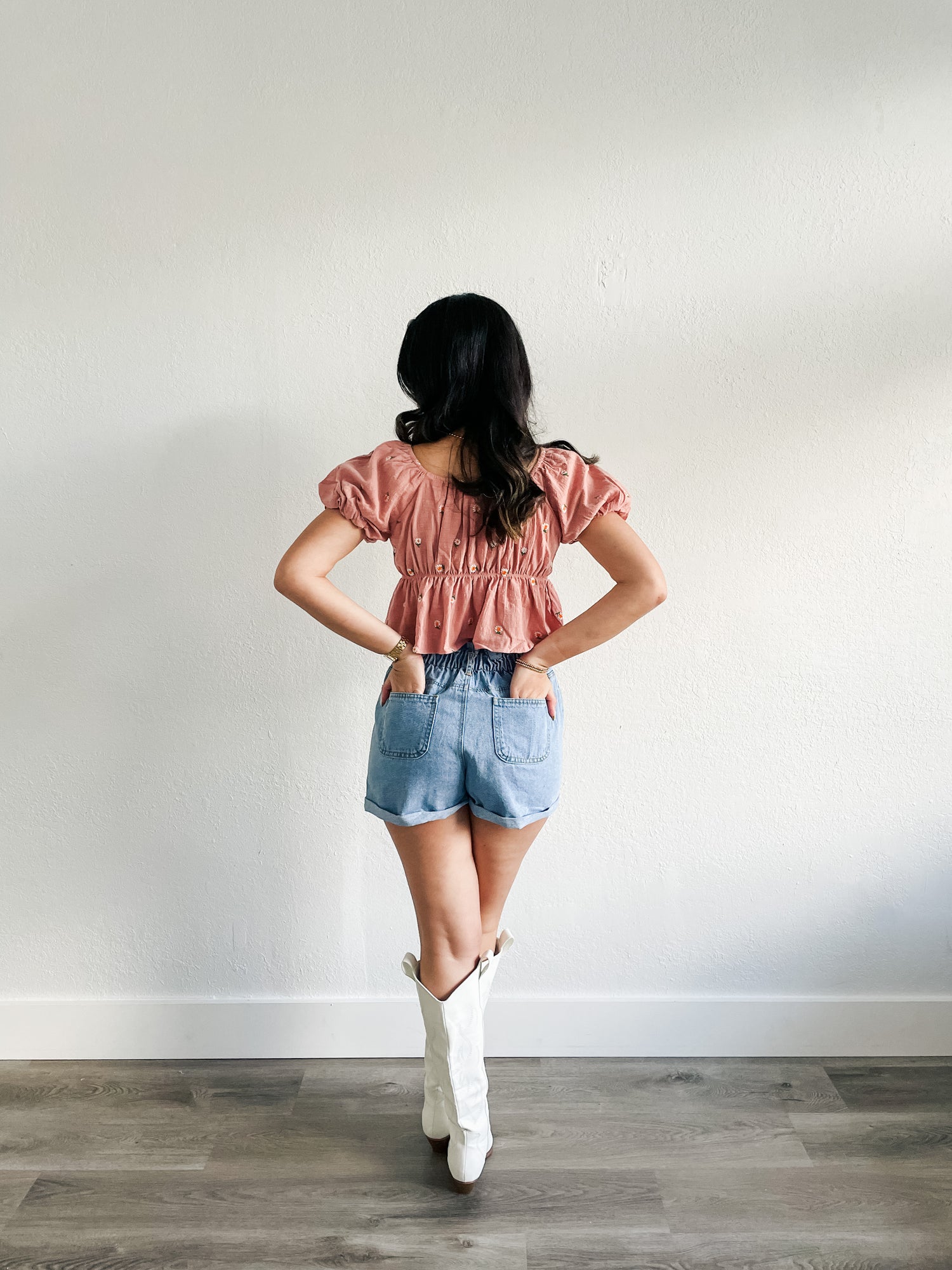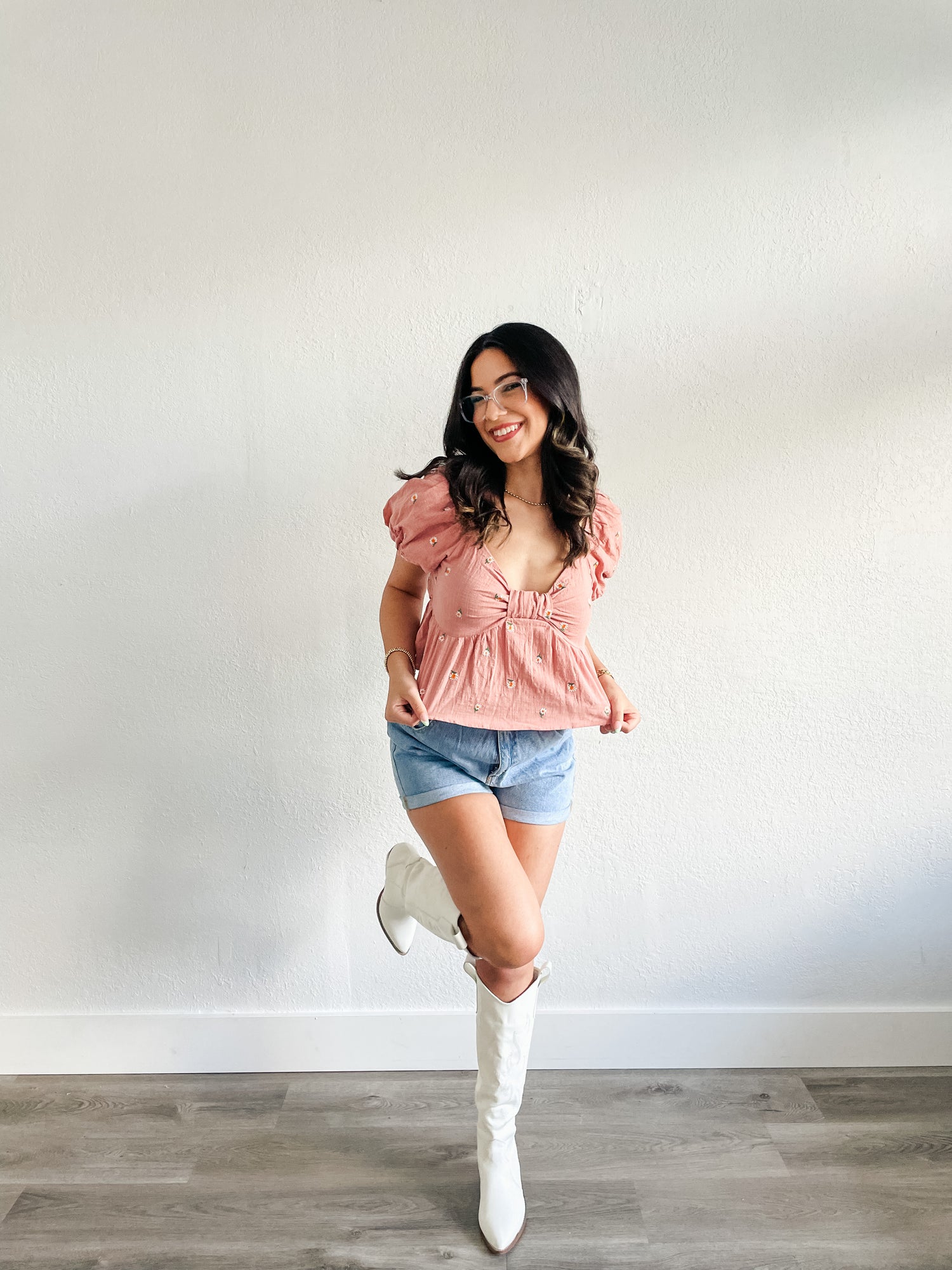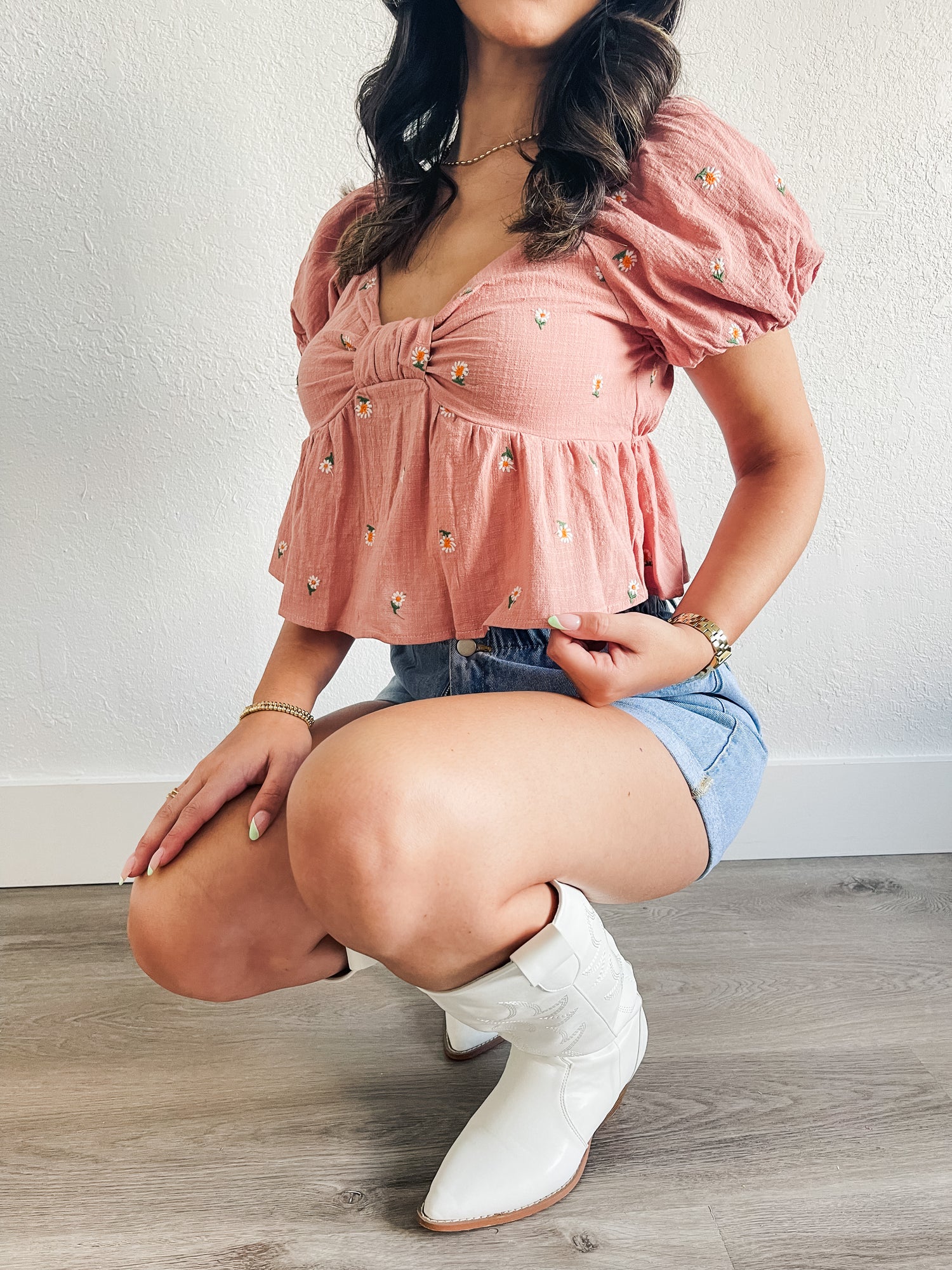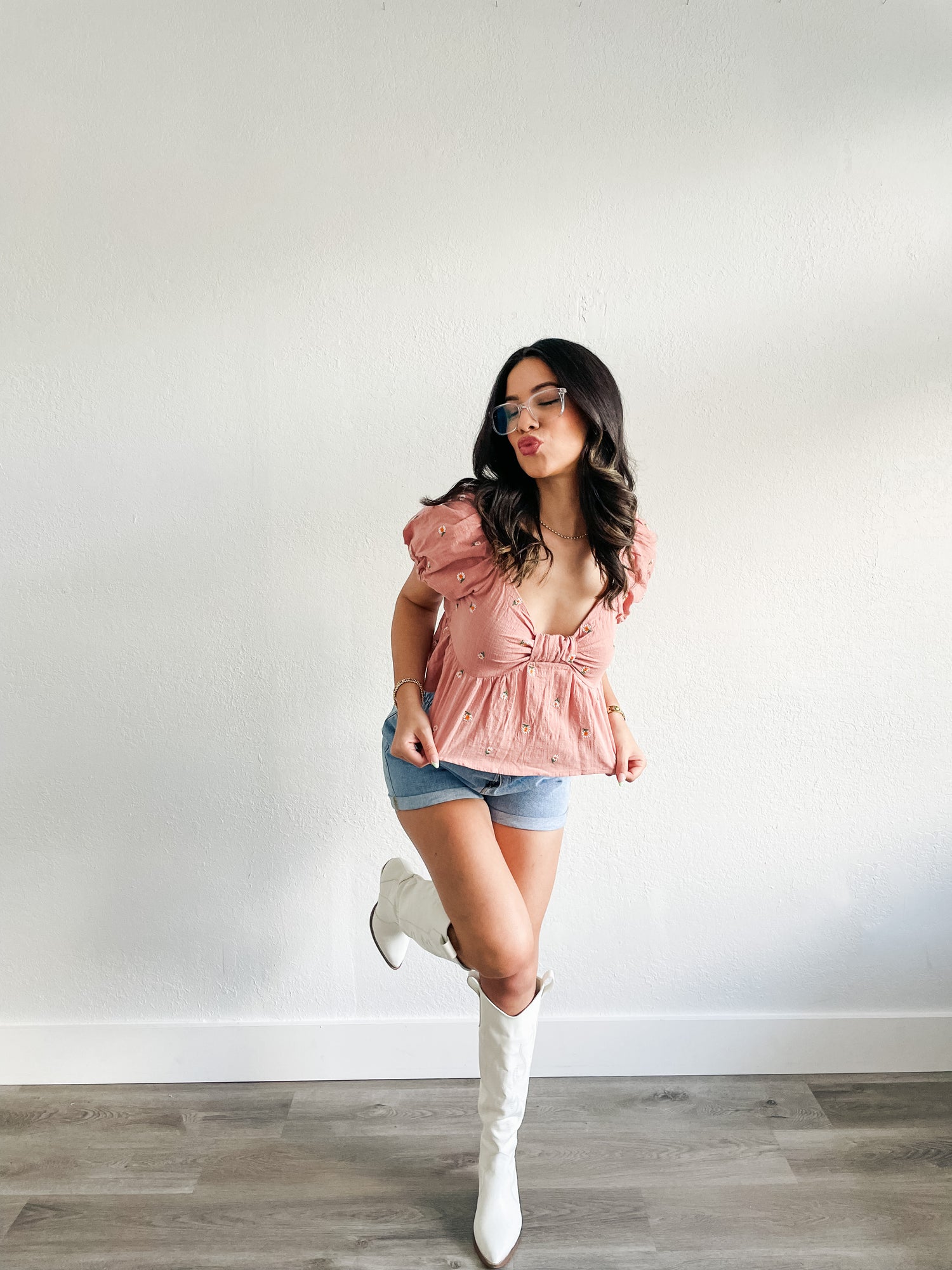 Top features short sleeve floral print bust bustier, ditsy floral print, bow-style bust detail, short bubble sleeve, babydoll silhouette, gathered back bodice and v-neckline.