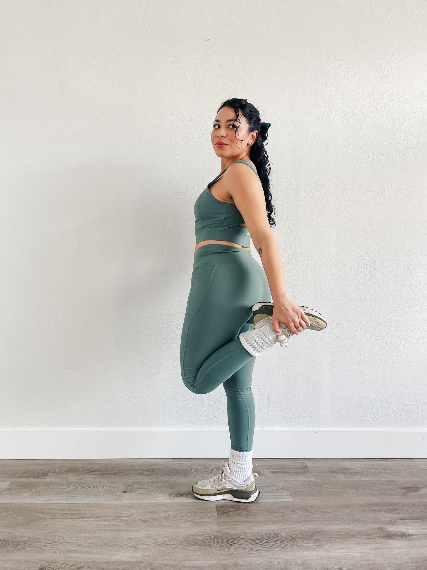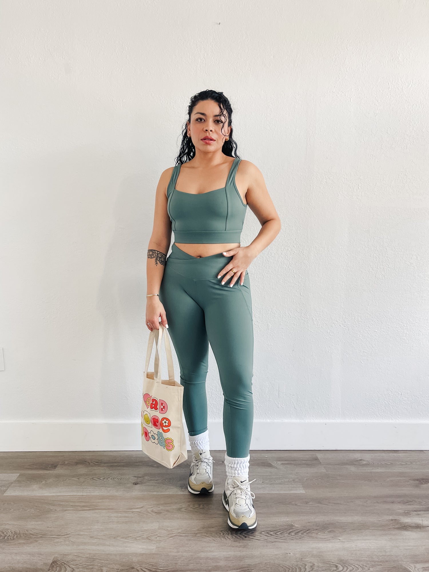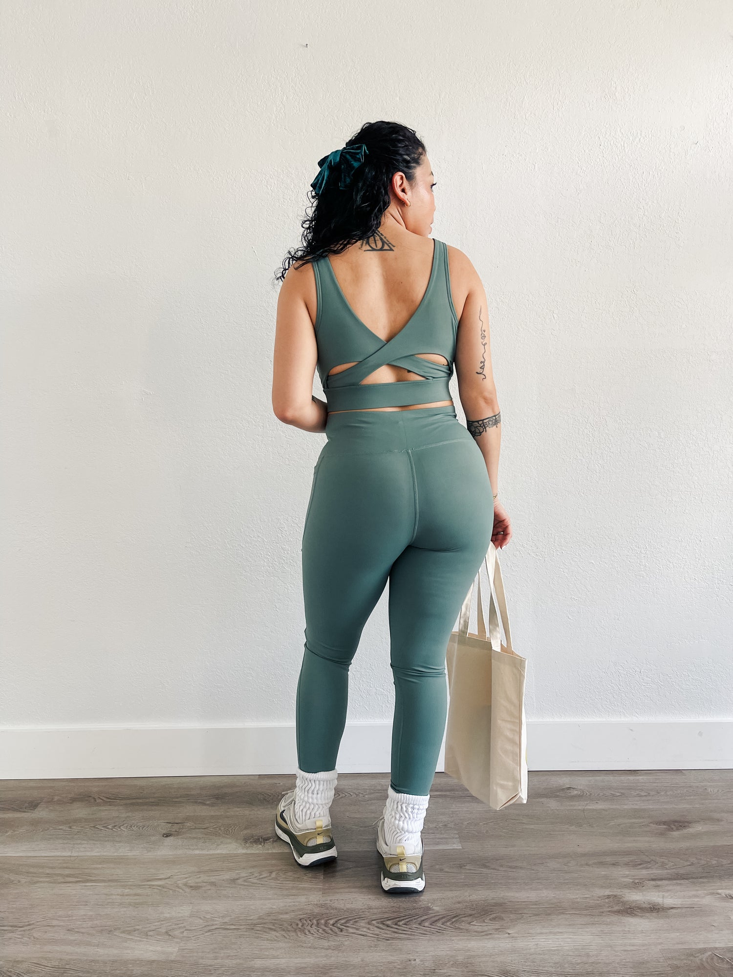 Set features supportive and compressive fit and a bold strappy back, high waisted leggings with side pockets