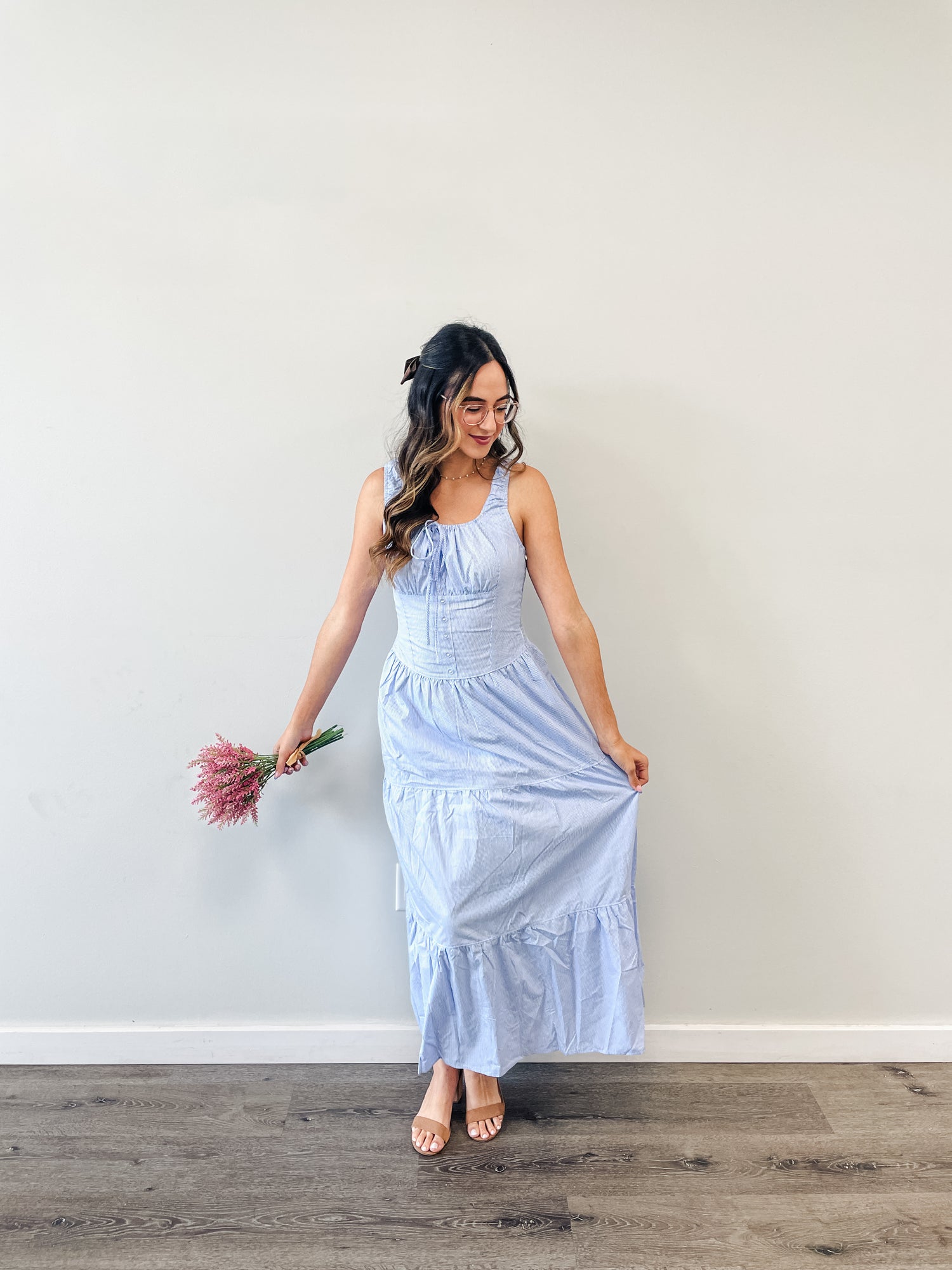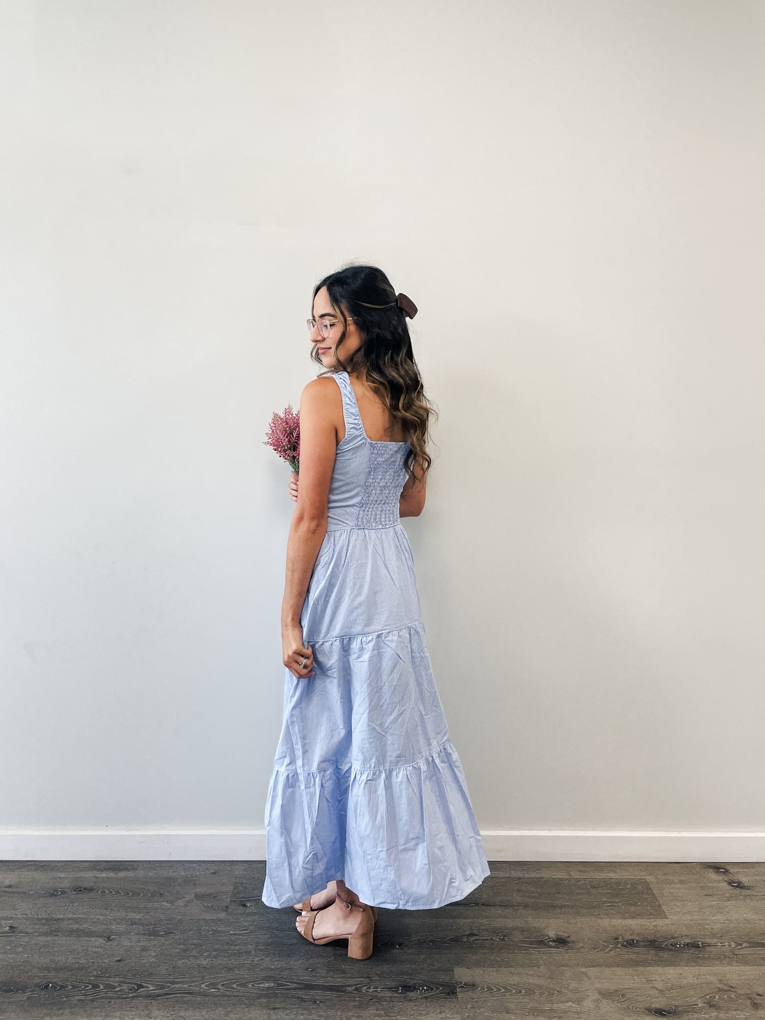 Dress features a maxi length, blue/white stripe print, u-neckline, cotton fabrication, adjustable self tie bow in front, thick straps, smocked back, button design, and tiered skirt.
