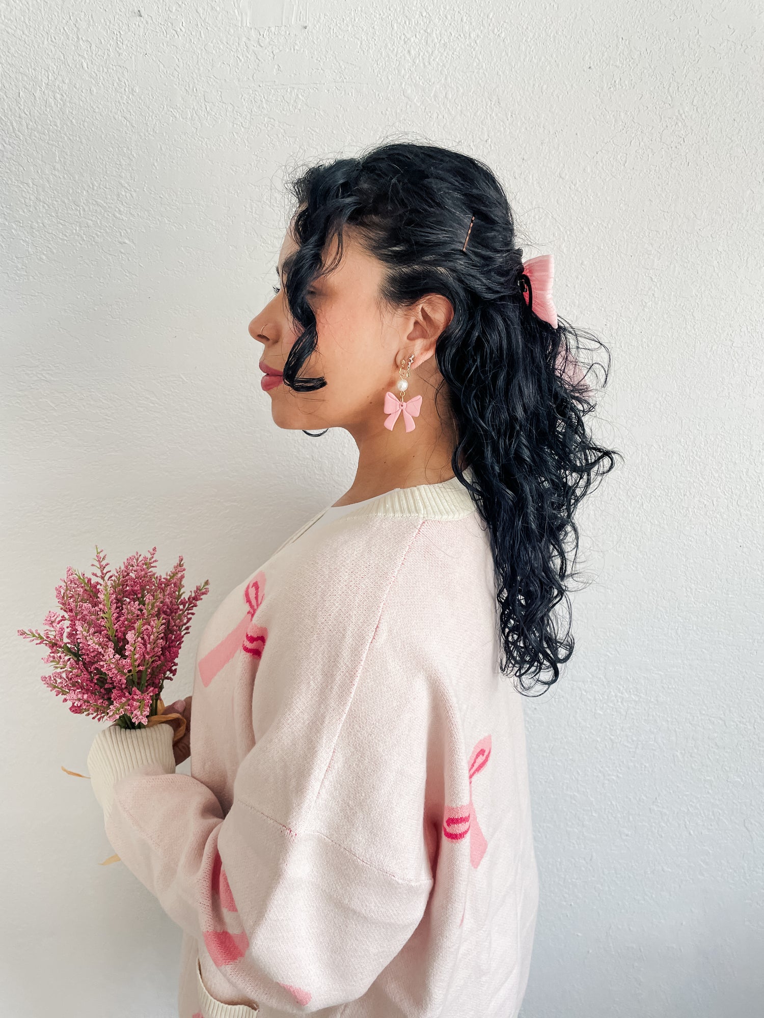 Cardigan features all over bow design, V-Neck, Button front, Front patch pocket and Oversized.