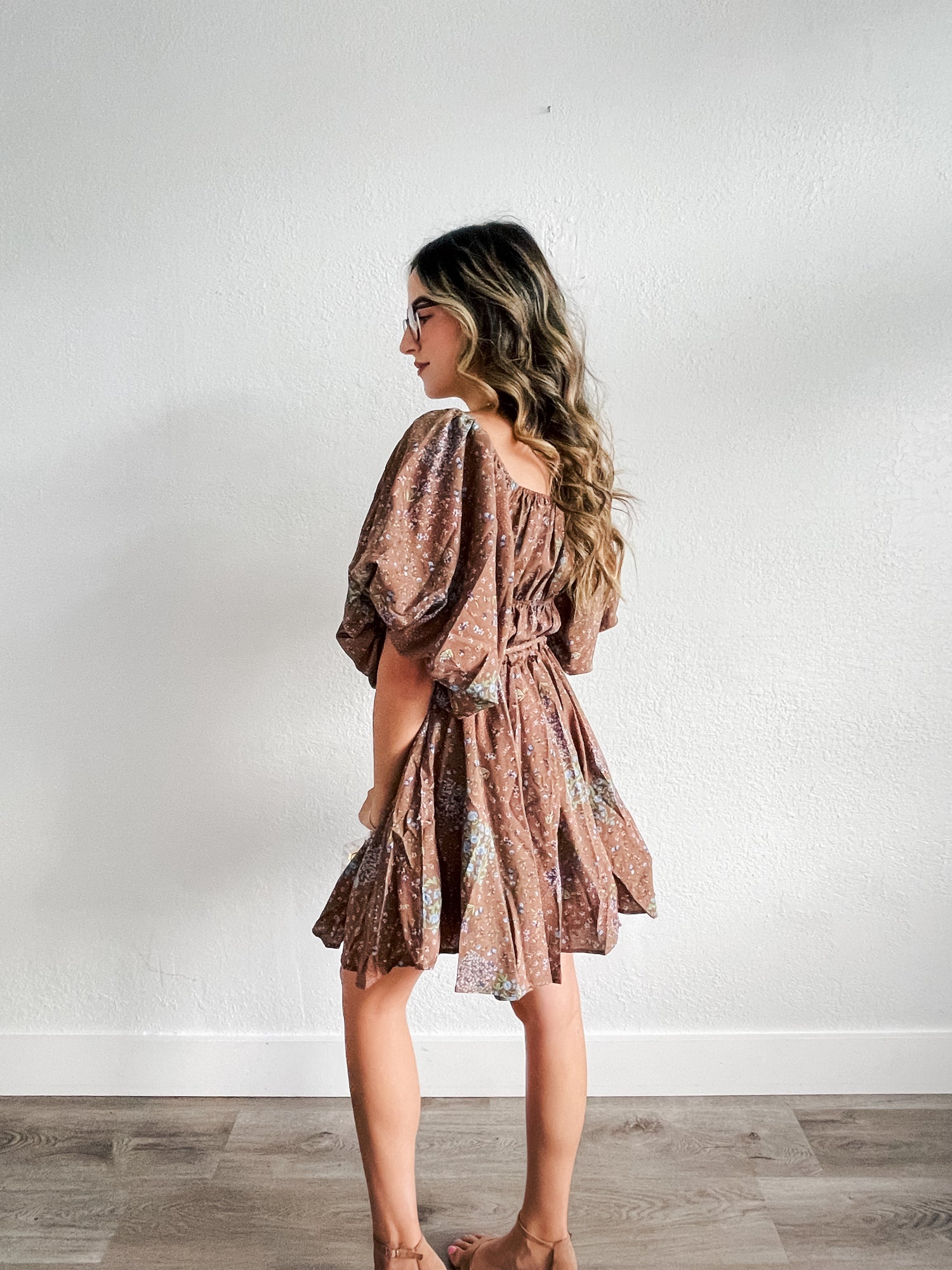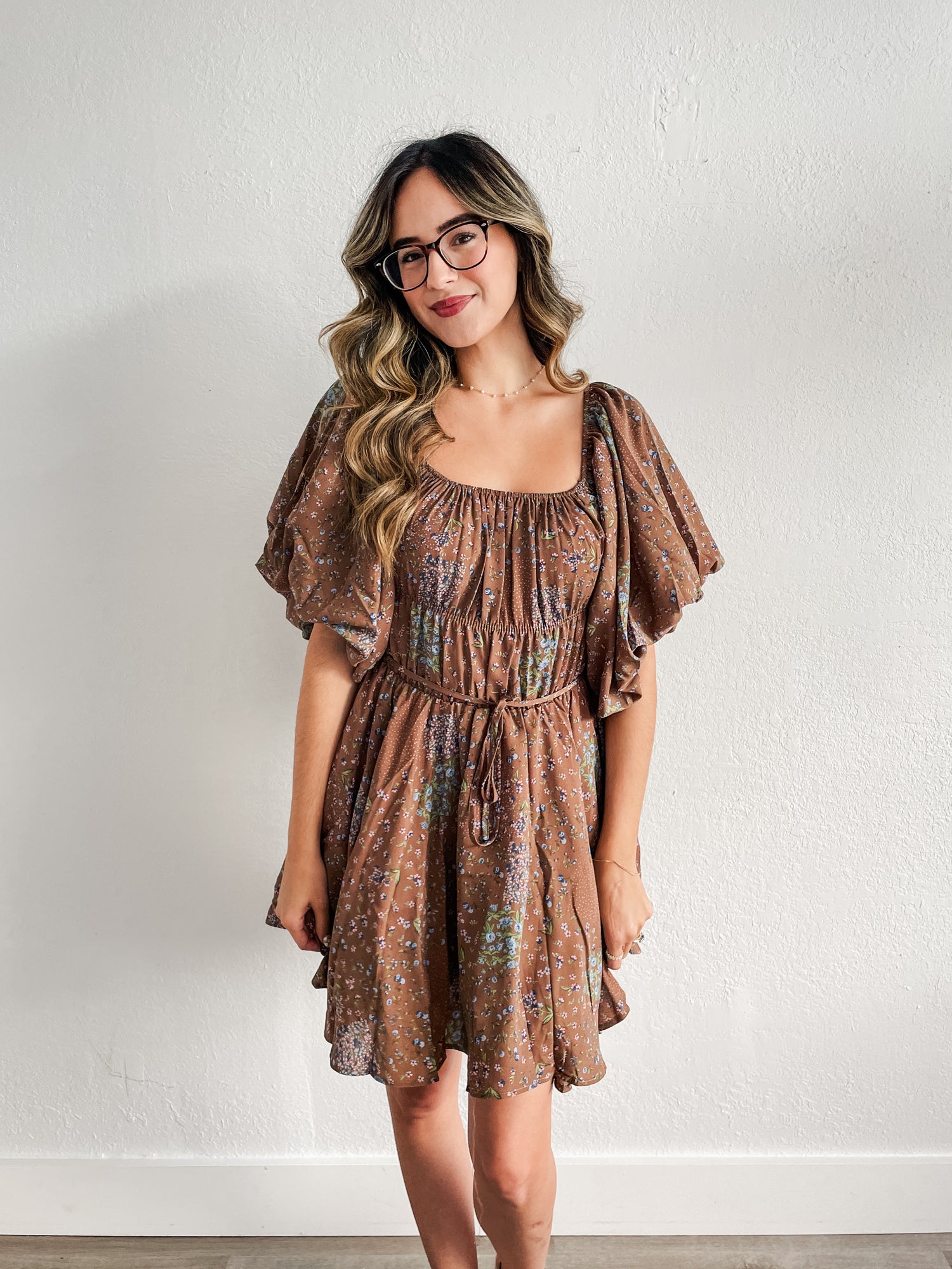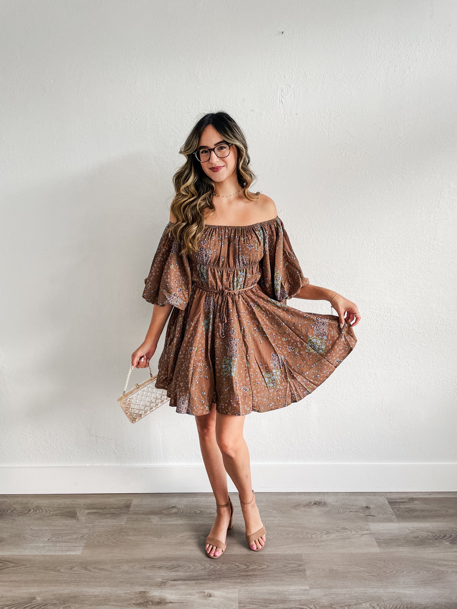 Dress features floral print with bubble sleeve, mini length, gathered tiered elastic waist with self tie, square neckline can be worn on or off the shoulder and lined with pleated tulle for extra flare.