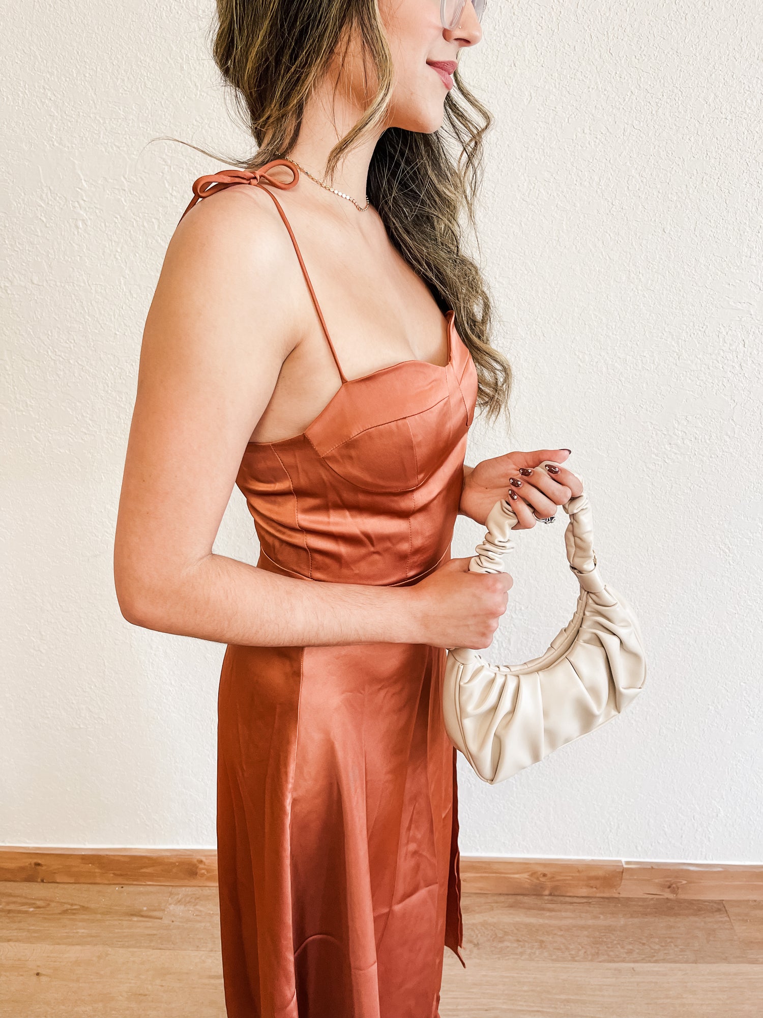 Dress features sweetheart neckline, self tie straps, hidden back zipper, upper back smocked detail, and thigh slit.