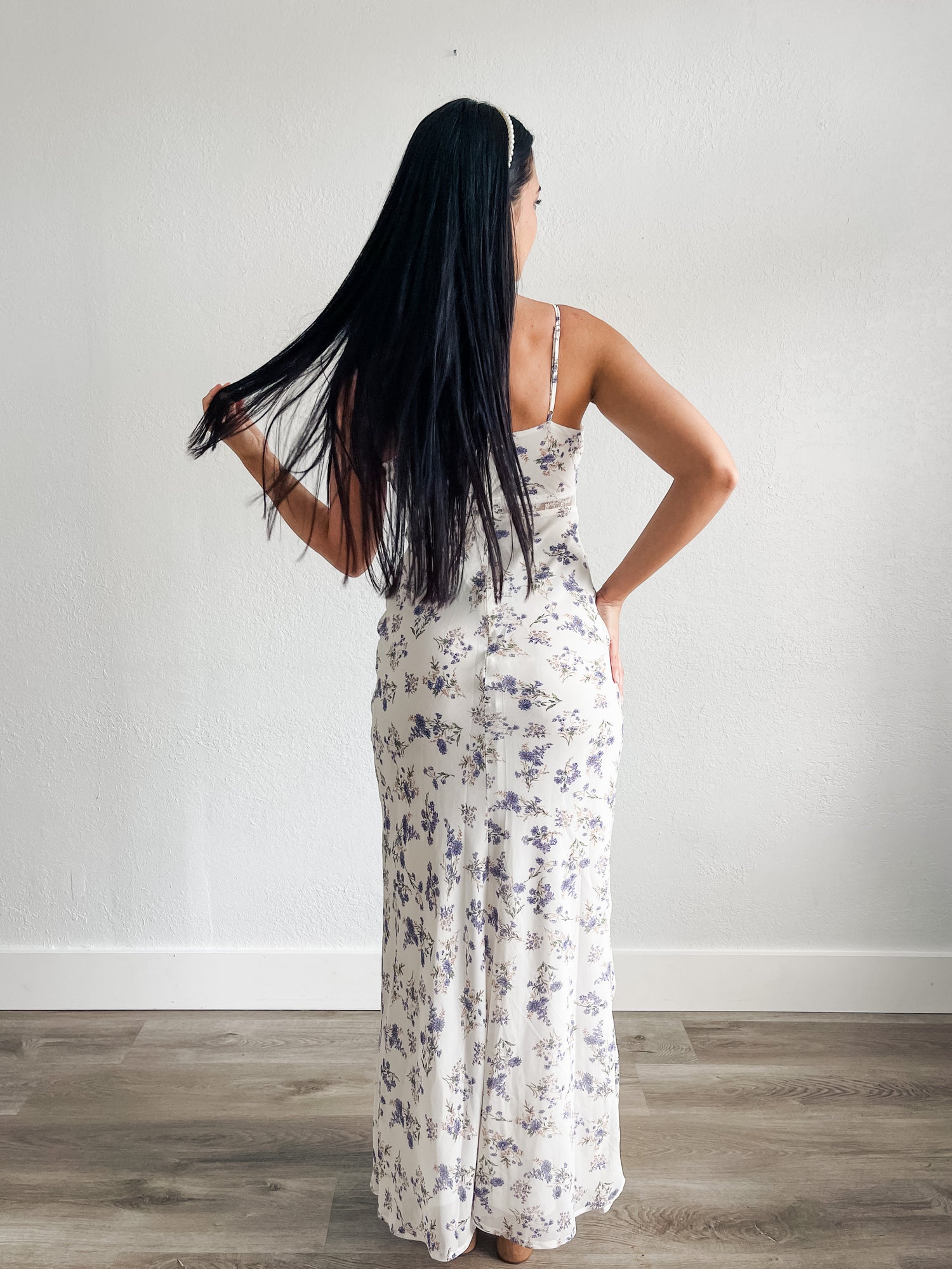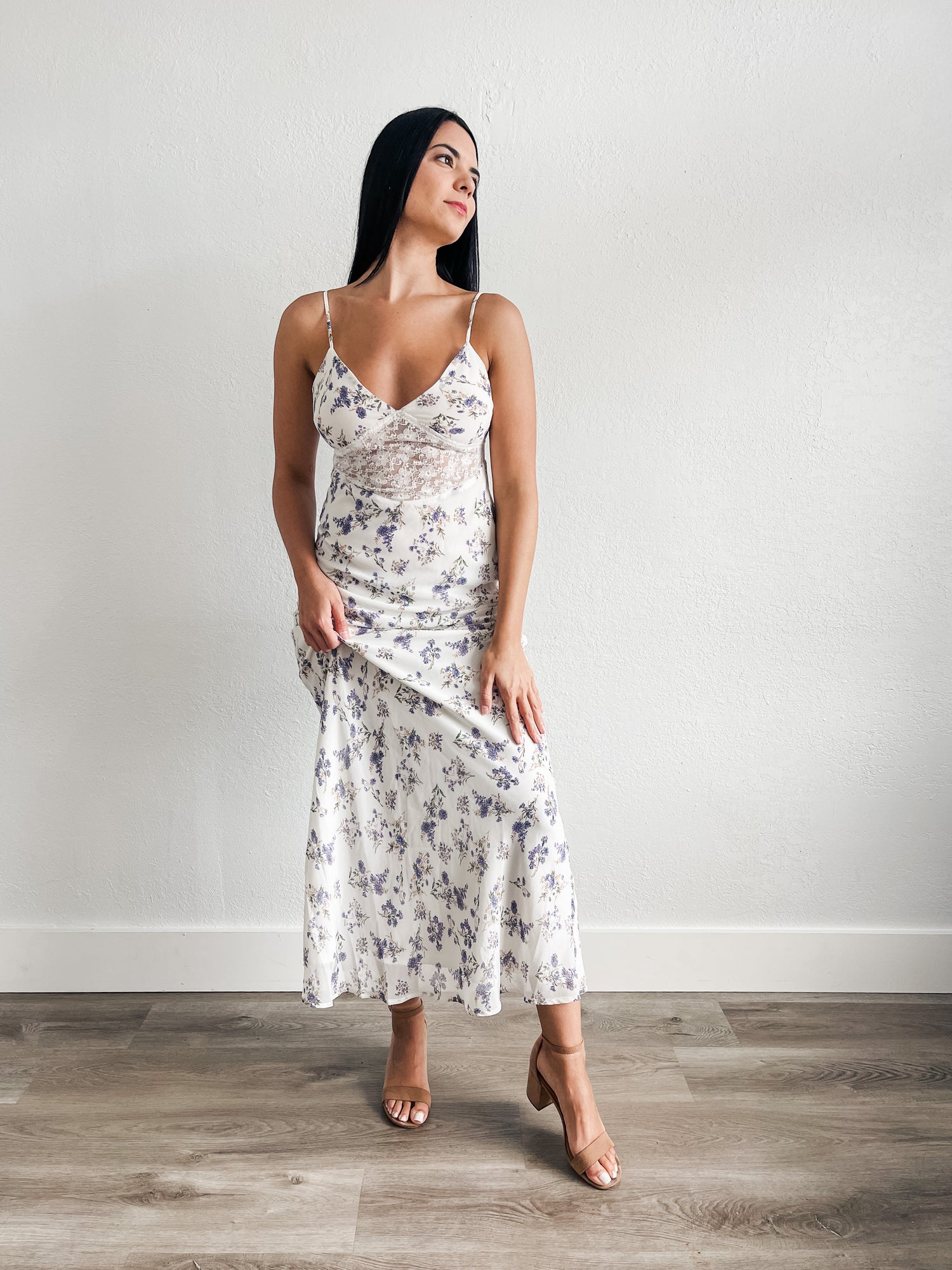 Dress features v-neckline, floral print, lace insert, maxi length, back zipper and lined.