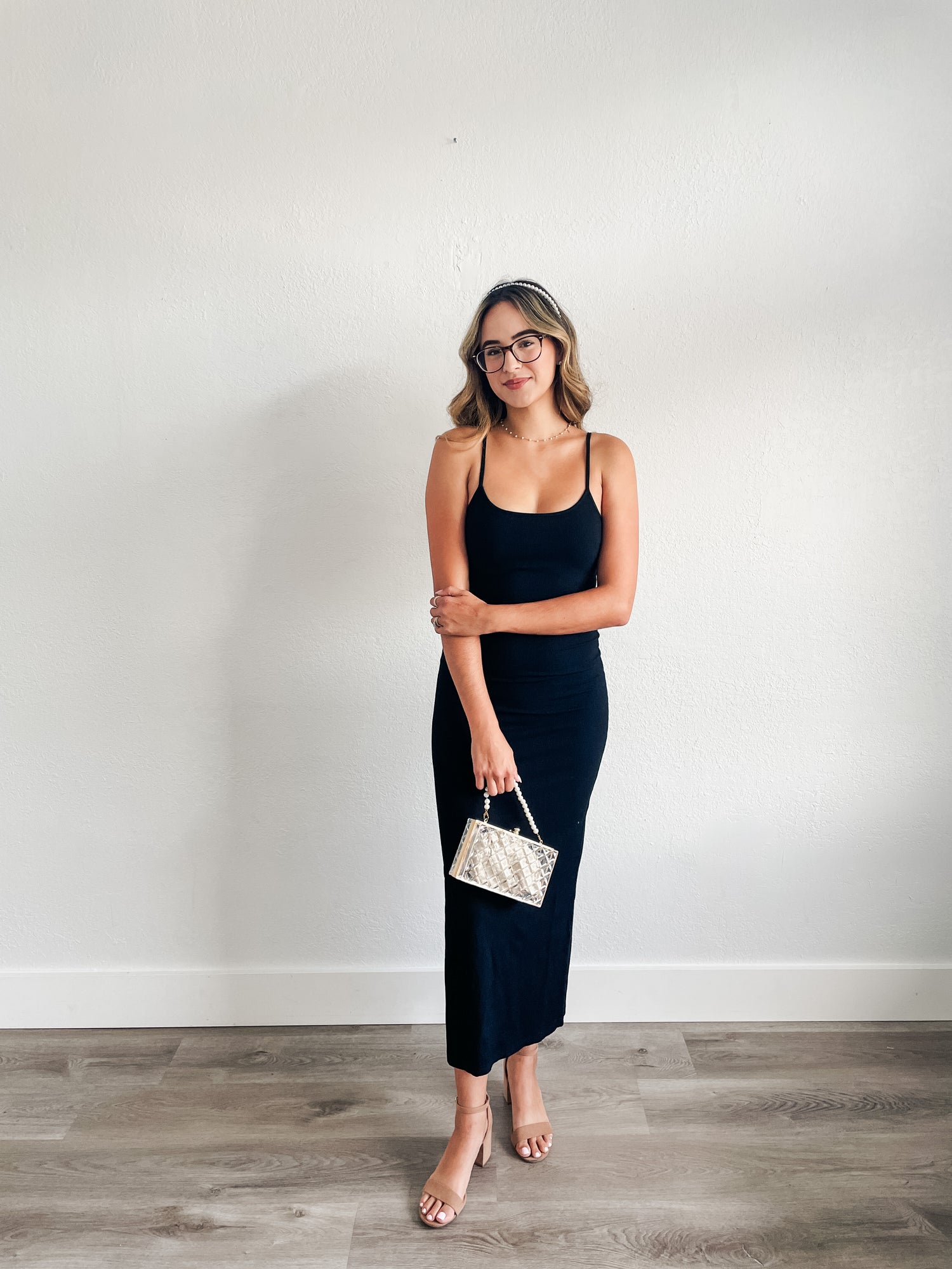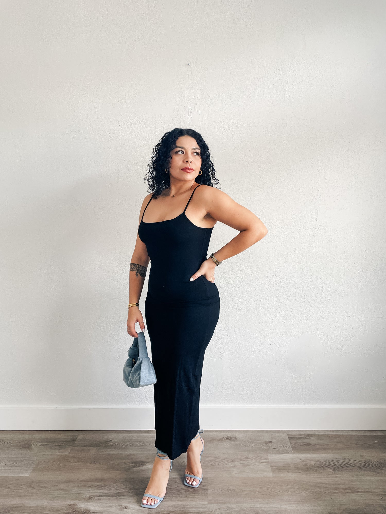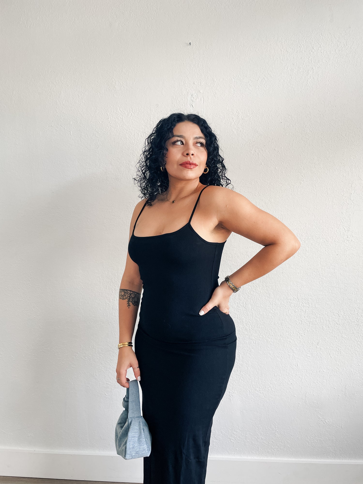 Dress features medium weight ribbed knit maxi dress, figure hugging fit, straight neck and adjustable straps.
