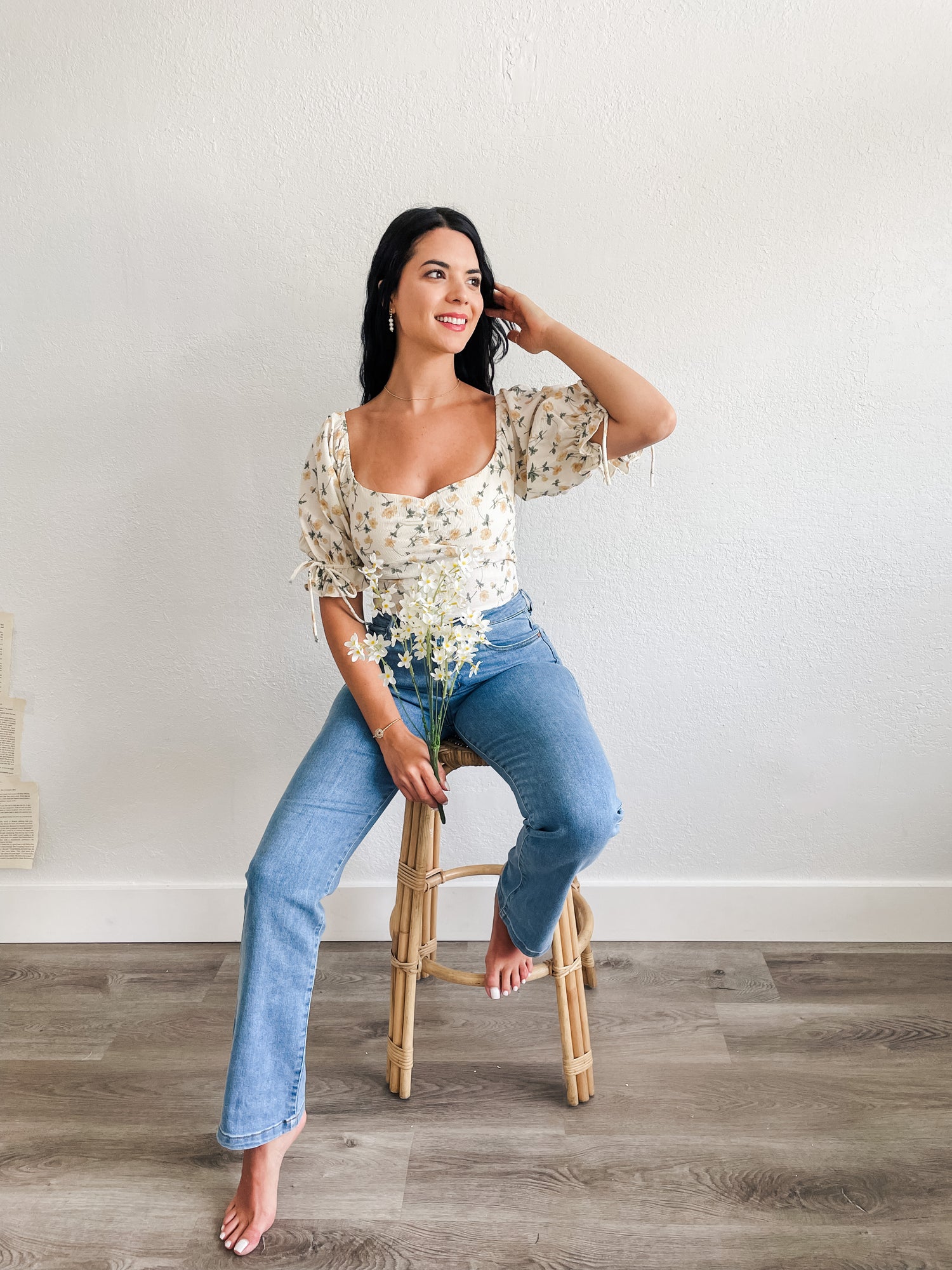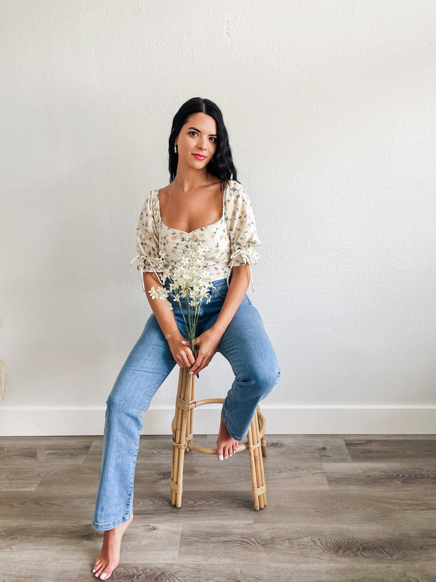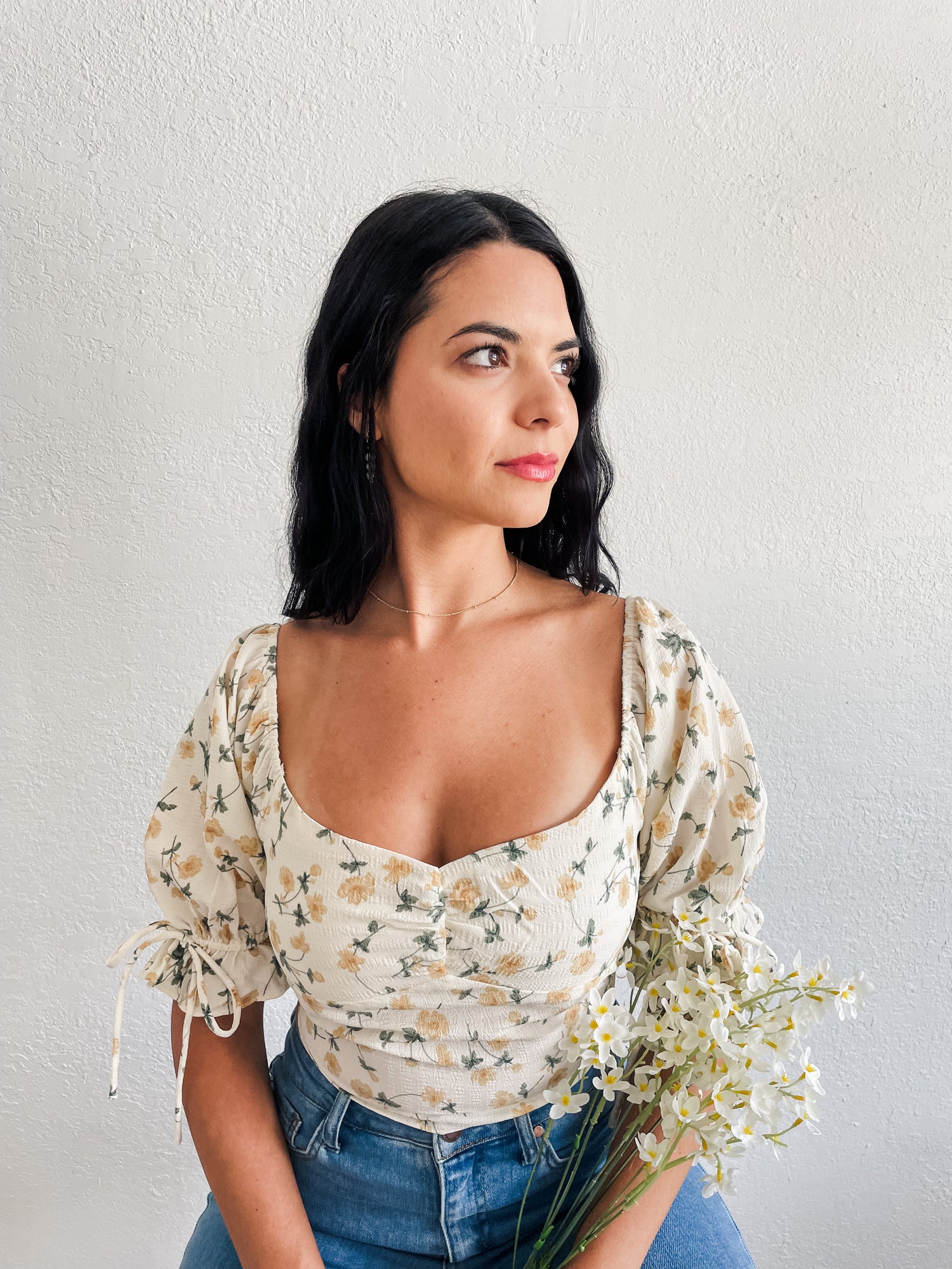 Top features floral print, crop length, puff sleeves, tie string detail, sweetheart neckline and smocked back.