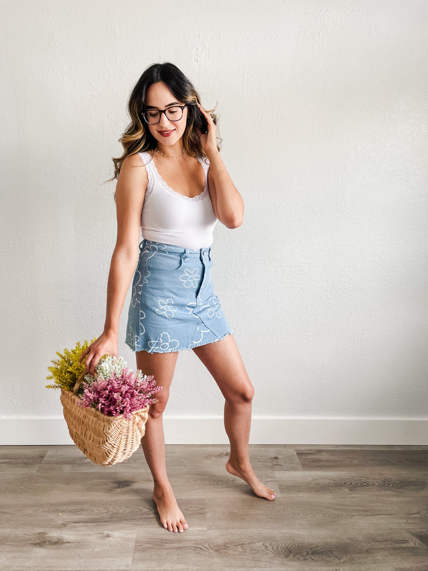 Skirt features floral design, unfinished hems, front and back pockets, and denim material.