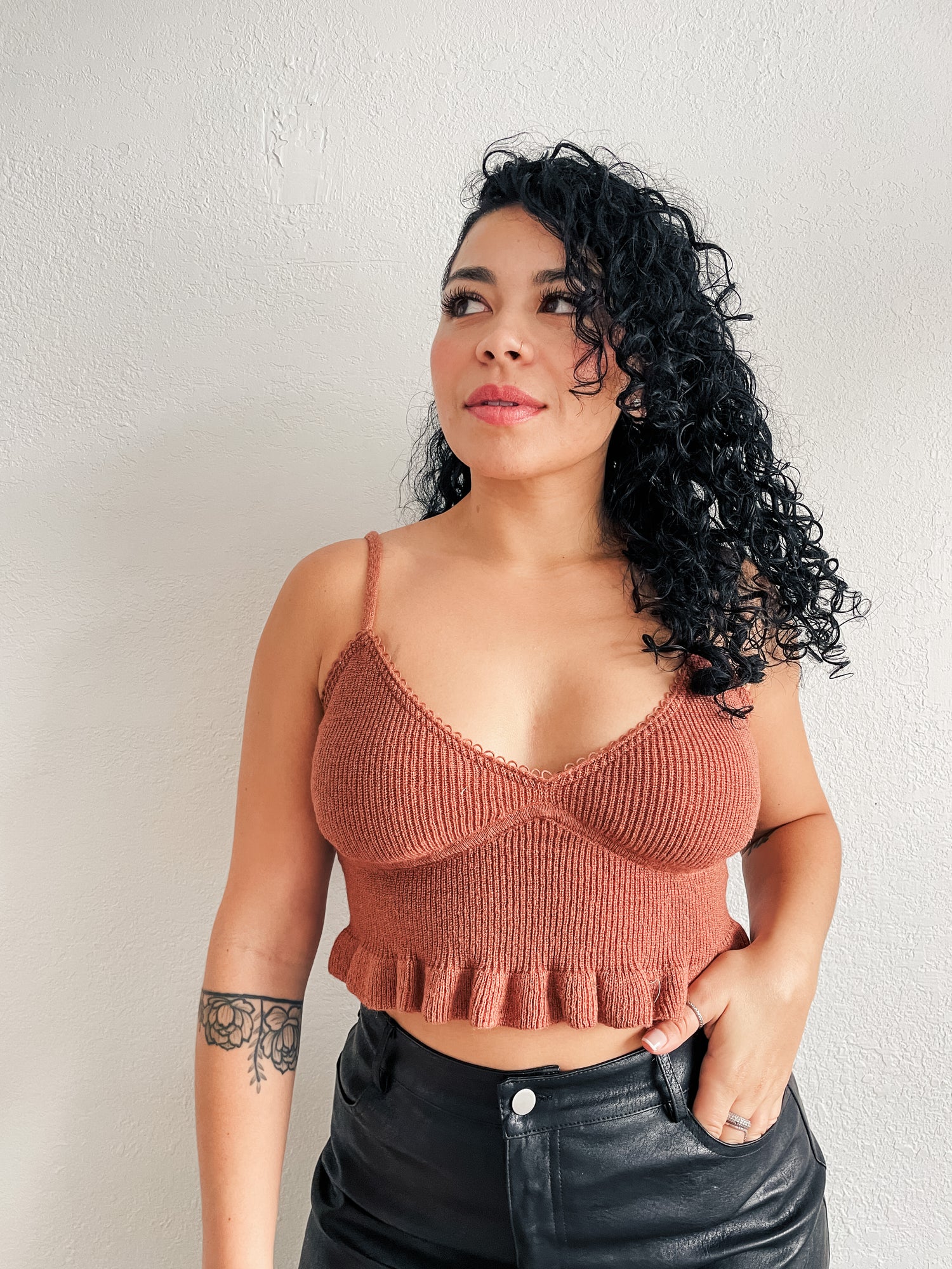 Top features seamed under bust, ruffled hem, scalloped edge trim on neckline and adjustable straps.