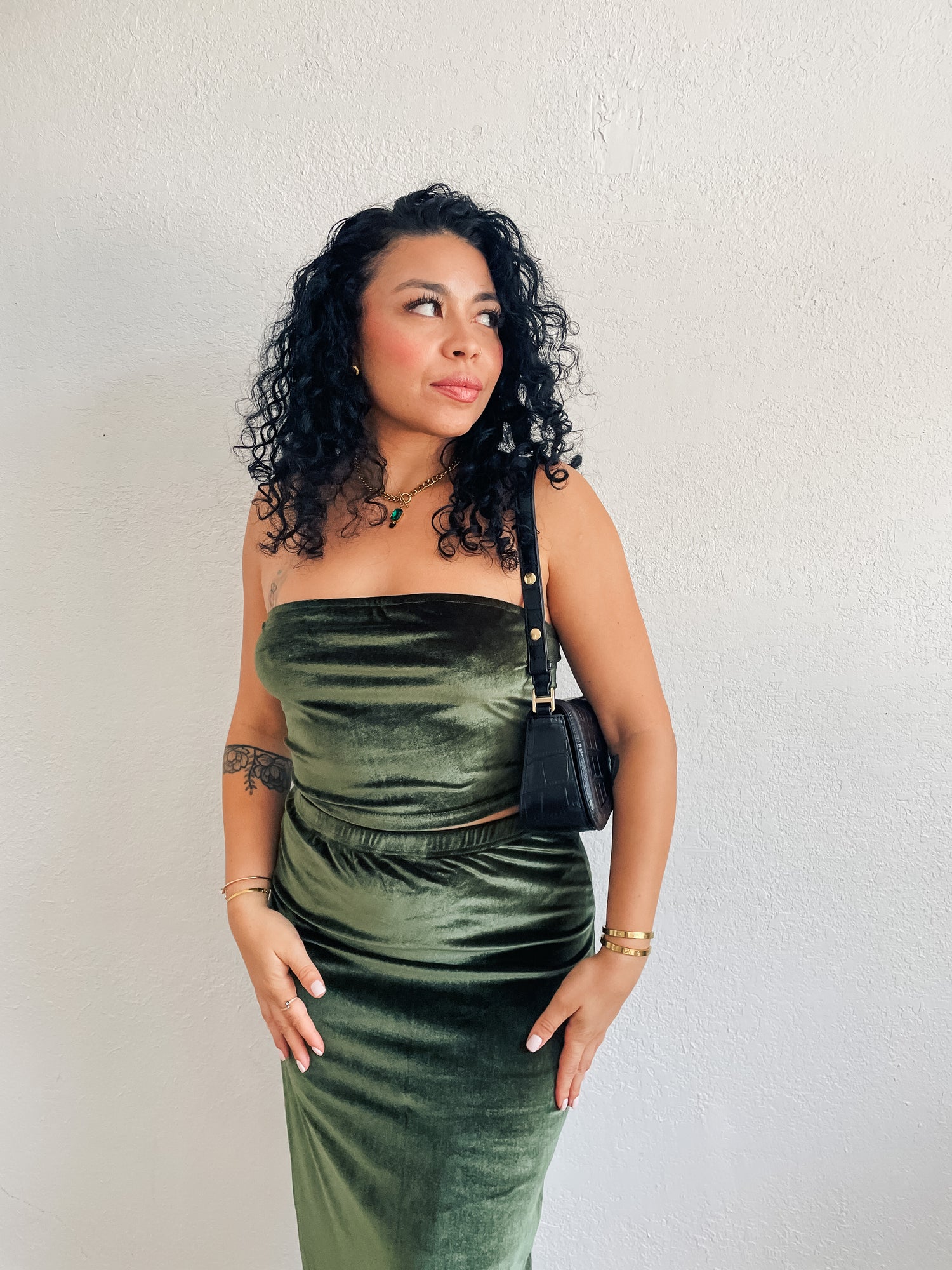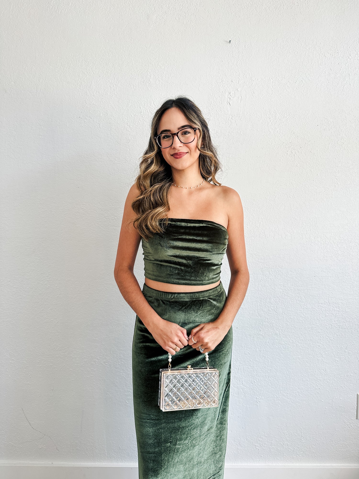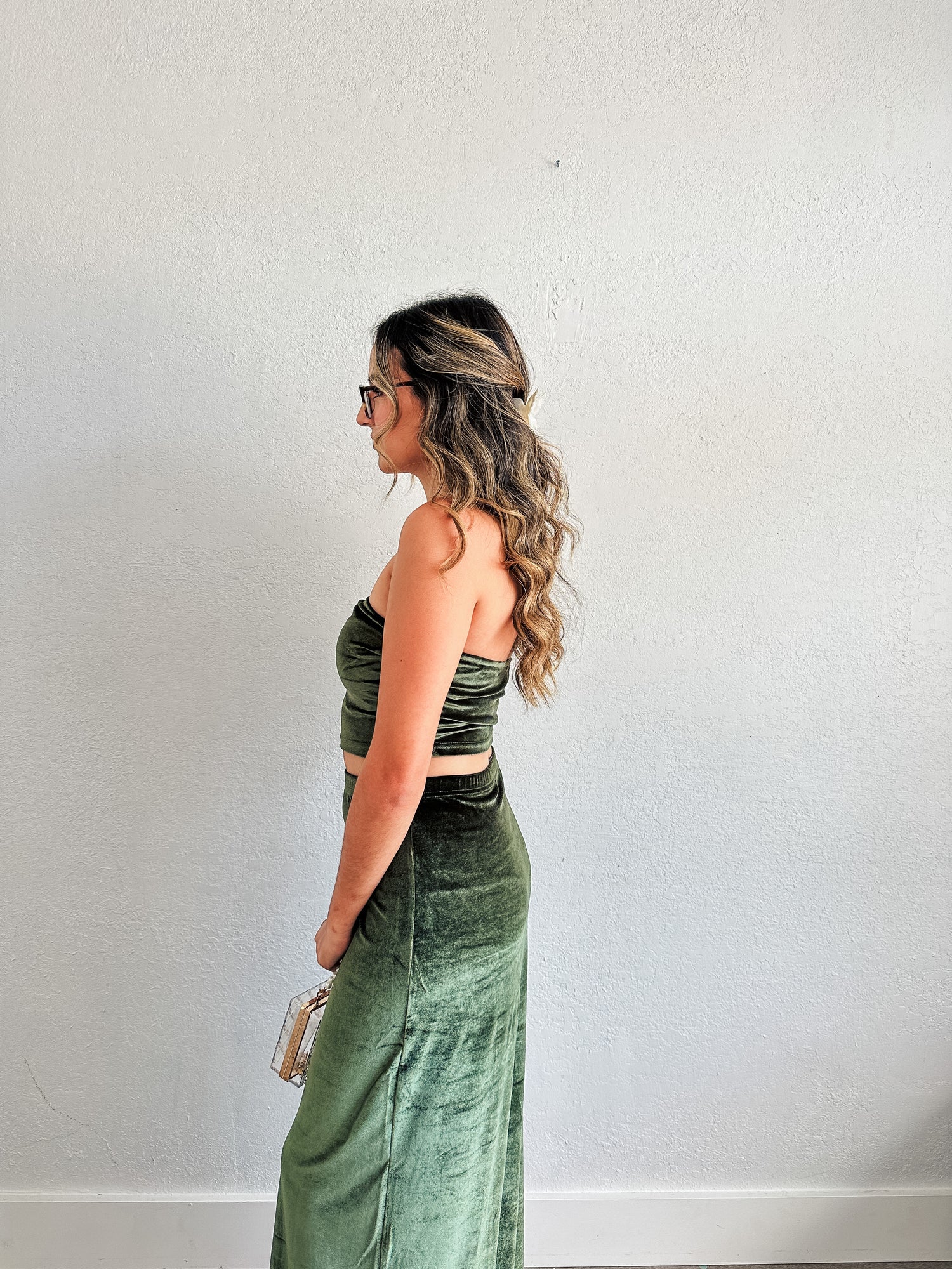 Set features plush velvet fabric, cropped strapless top and long maxi skirt with elasticized waist. Not lined.