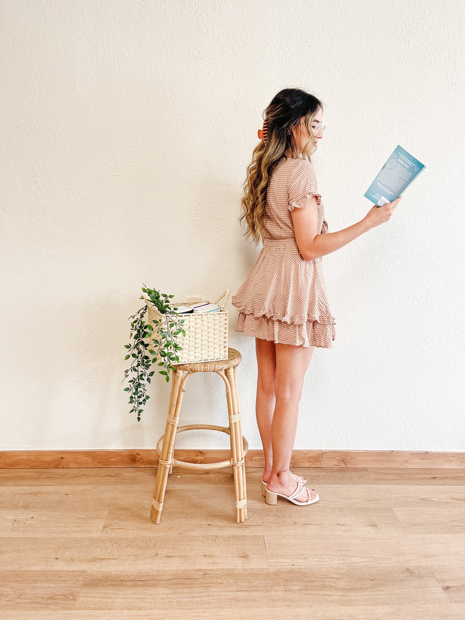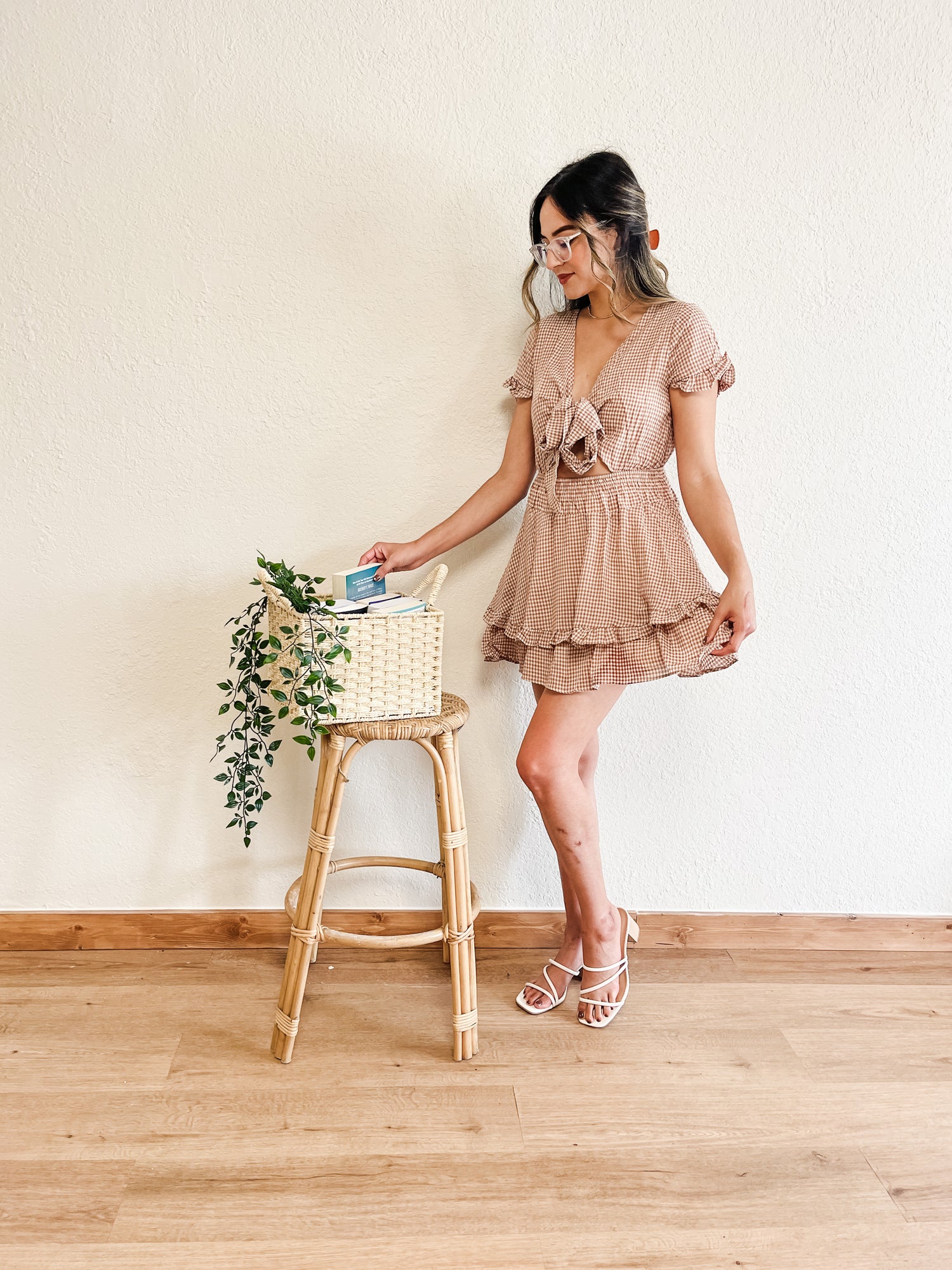 Dress features plaid short sleeve ruffle tier with front open cutout tie detail. Smocked waistband.