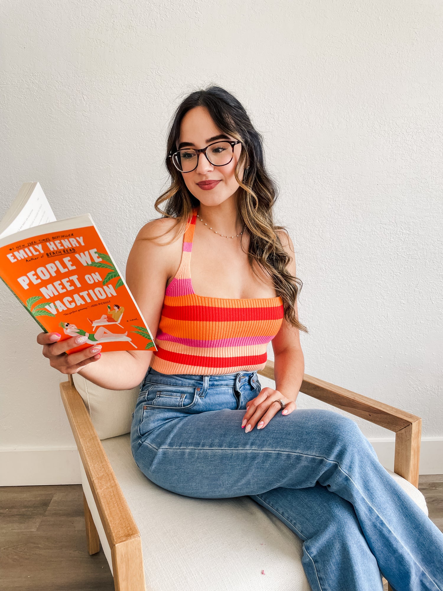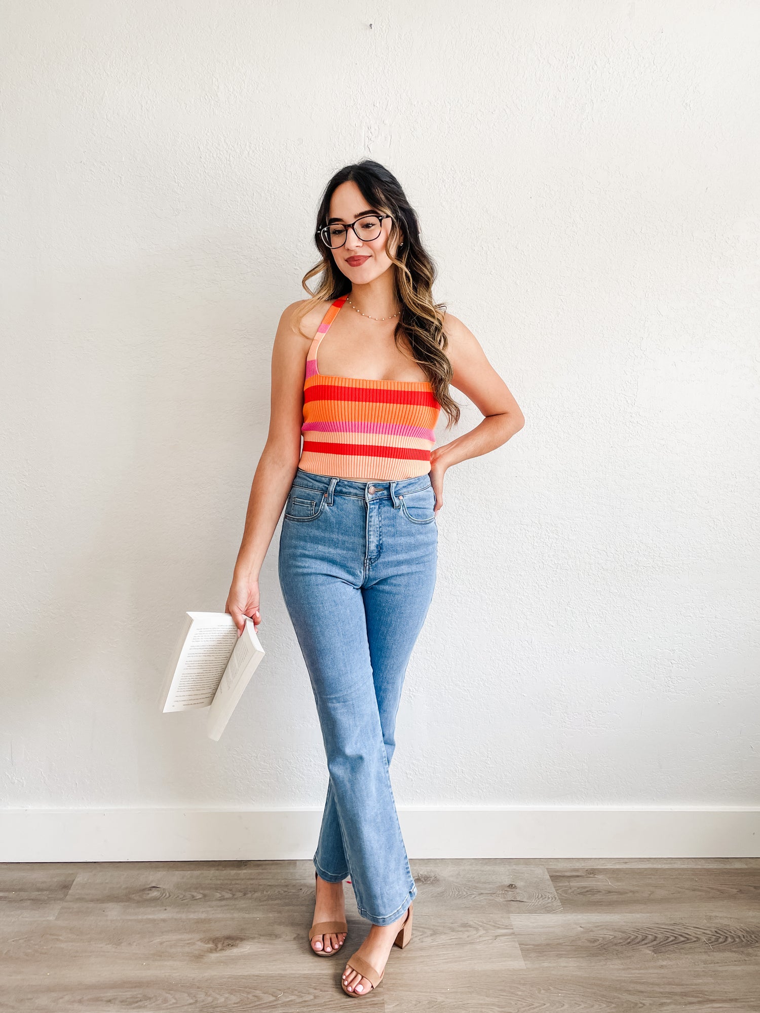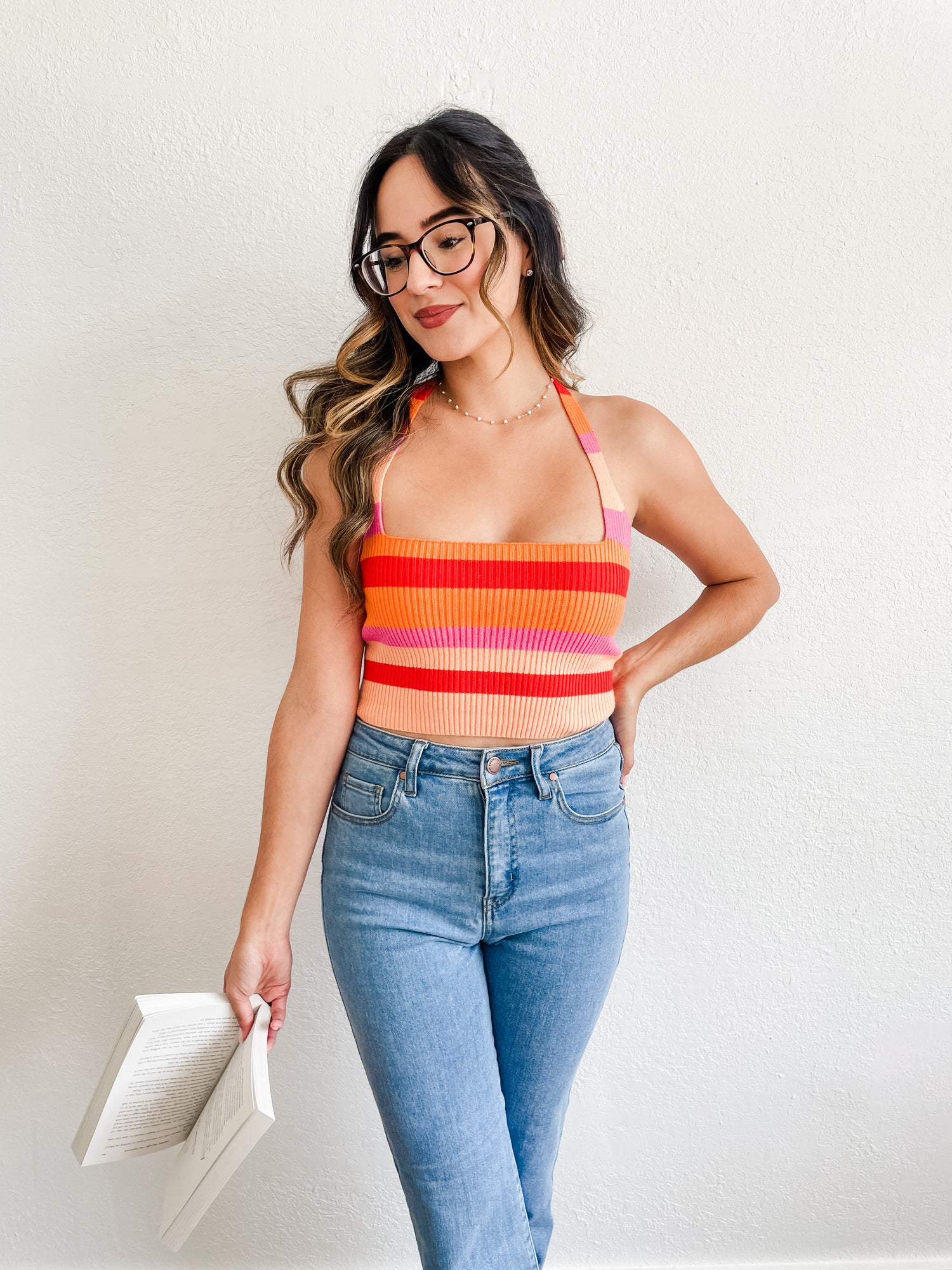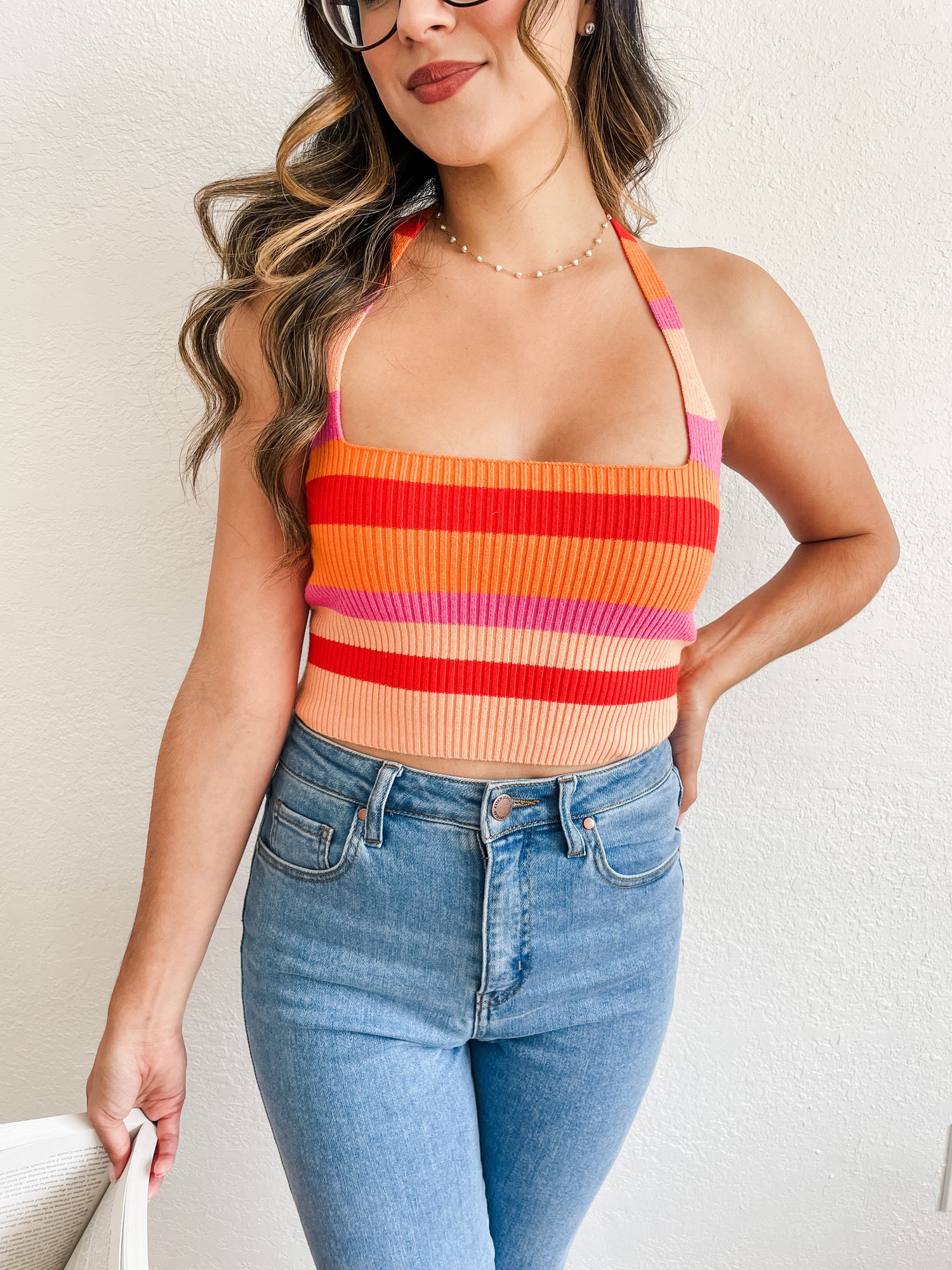 Top features striped colorblock design, square neckline, tie back halter and crop top length.