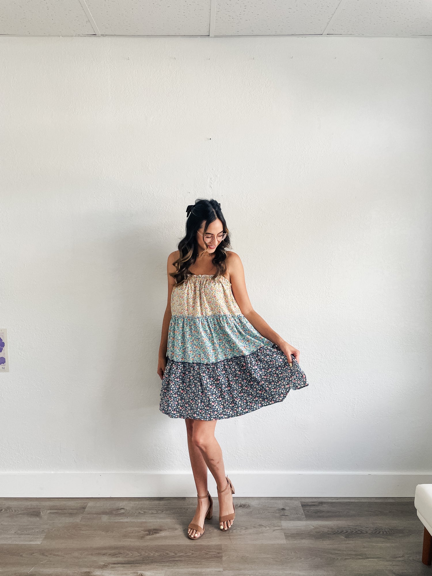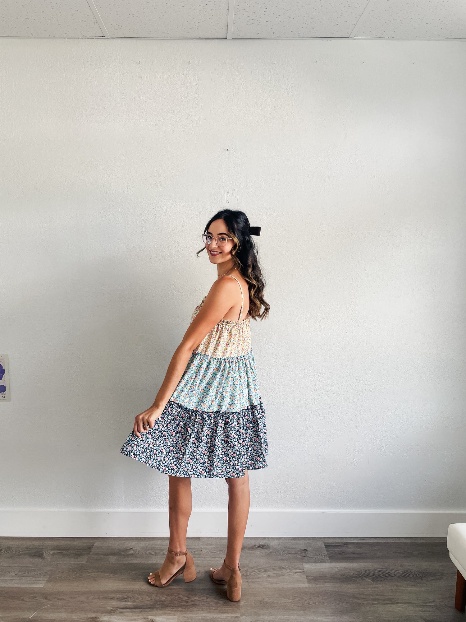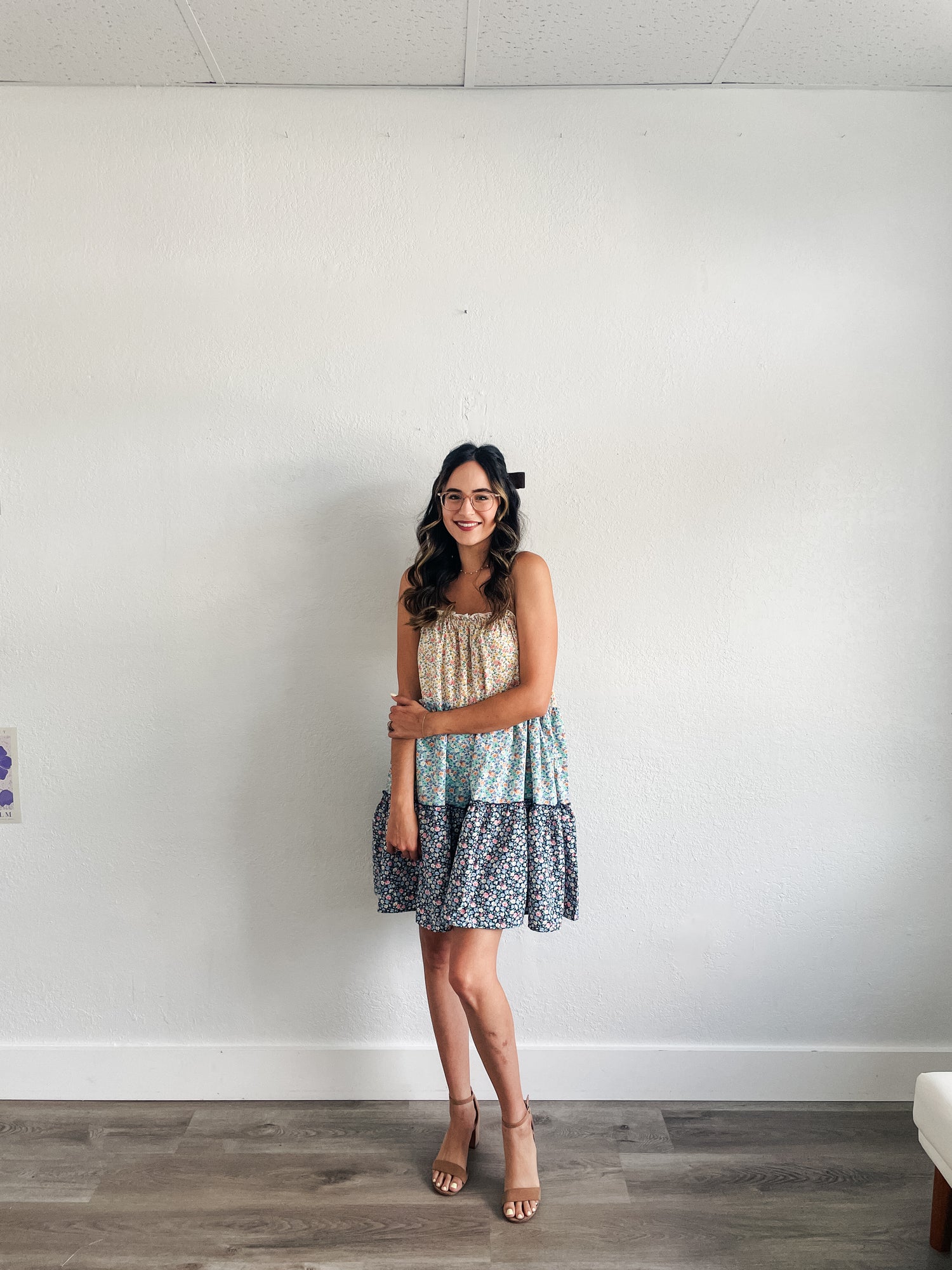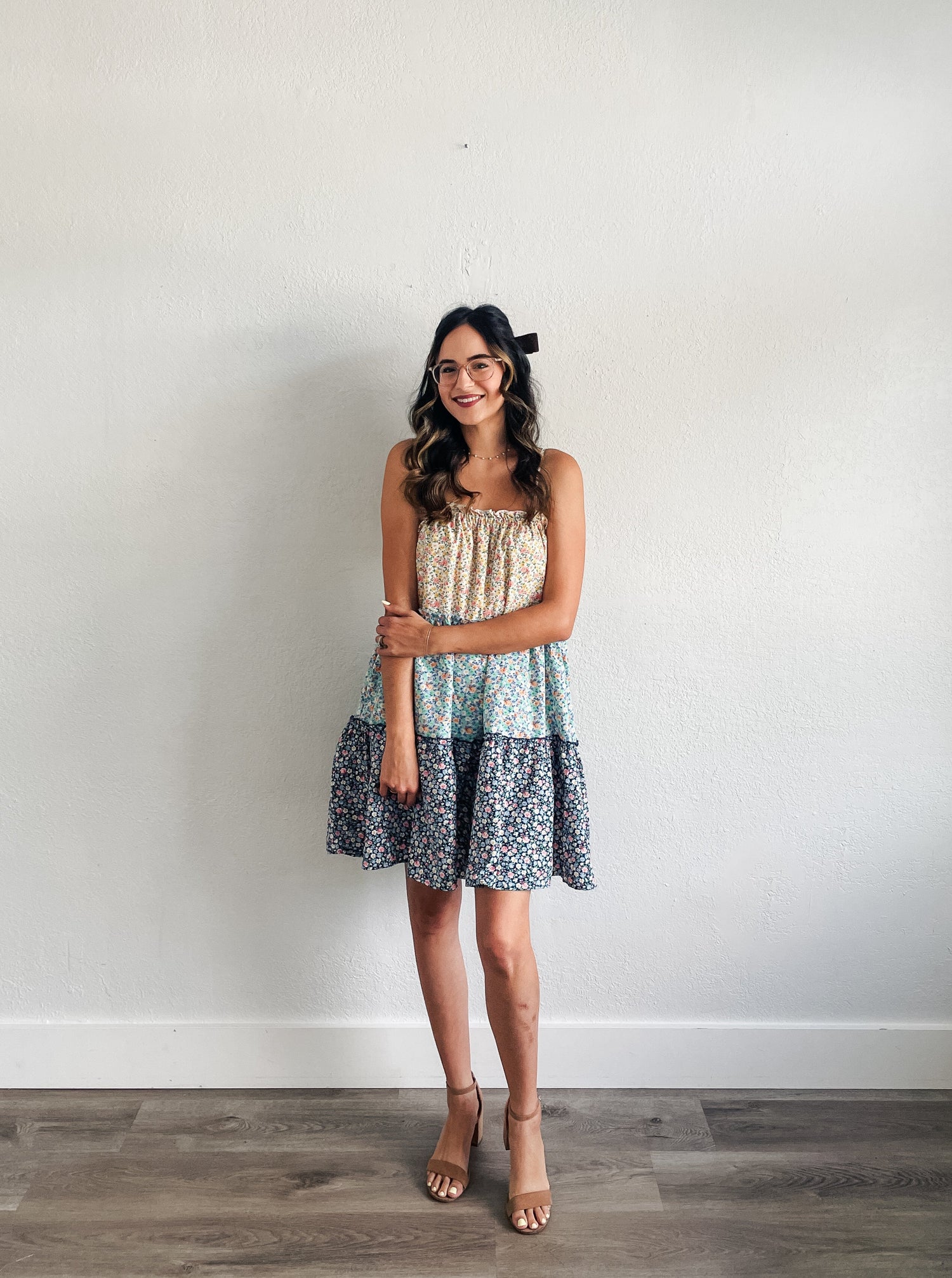 Dress features a floral print, adjustable shoulder straps, elastic neck and back, side pockets, tiered design and lined.