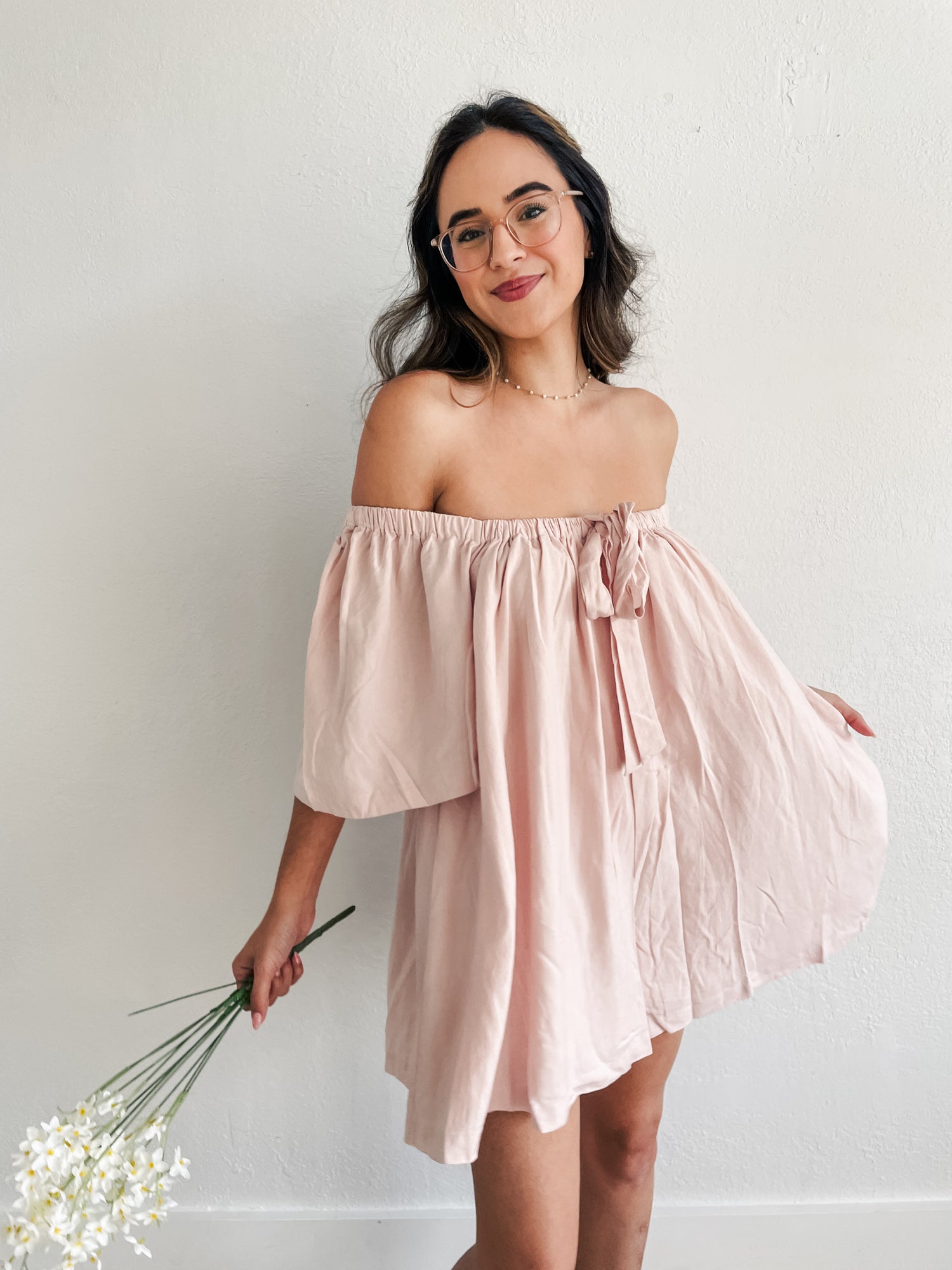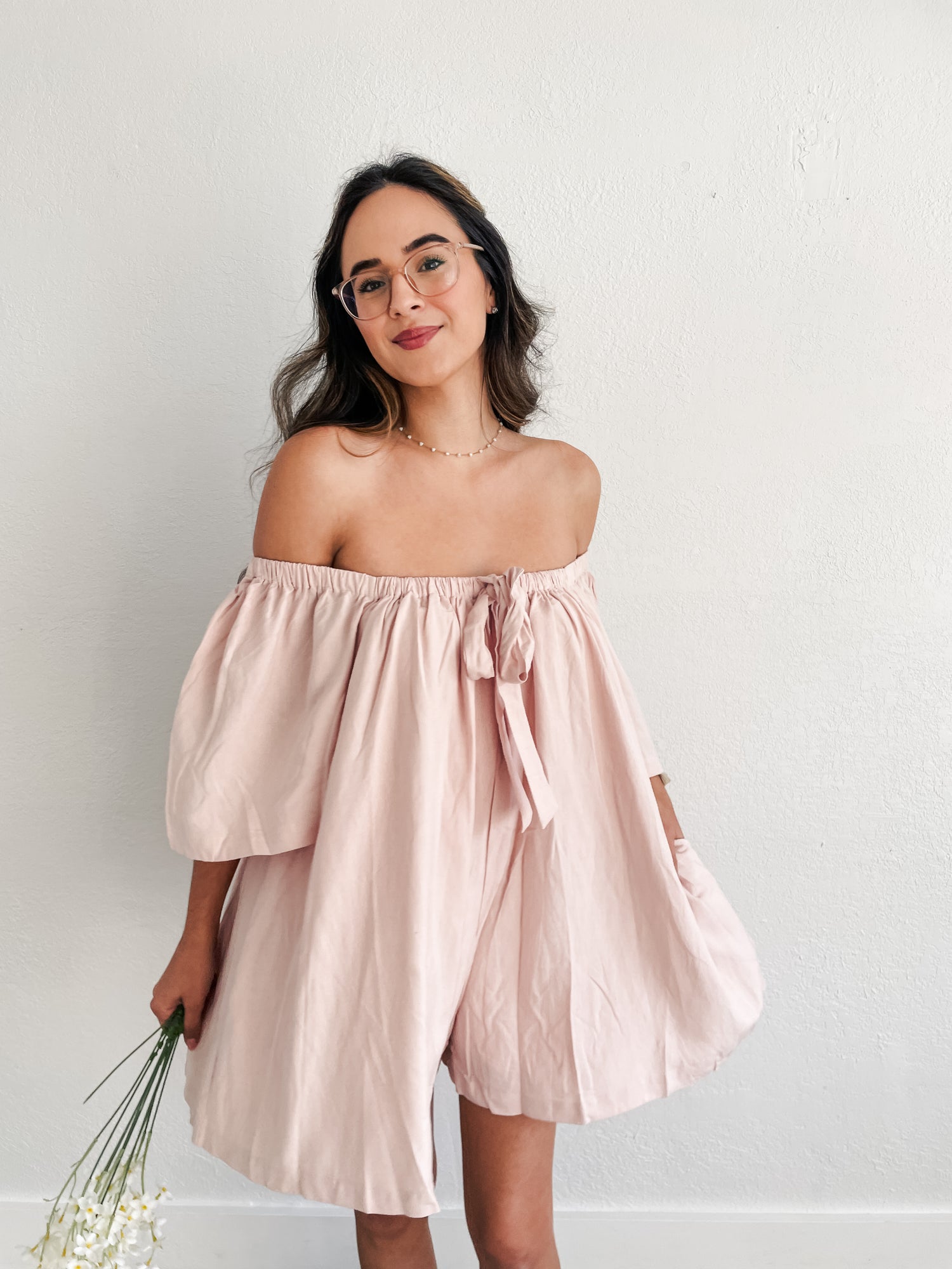 Romper features solid linen mix, short sleeve romper with front bow tie detail. Back invisible zipper.
