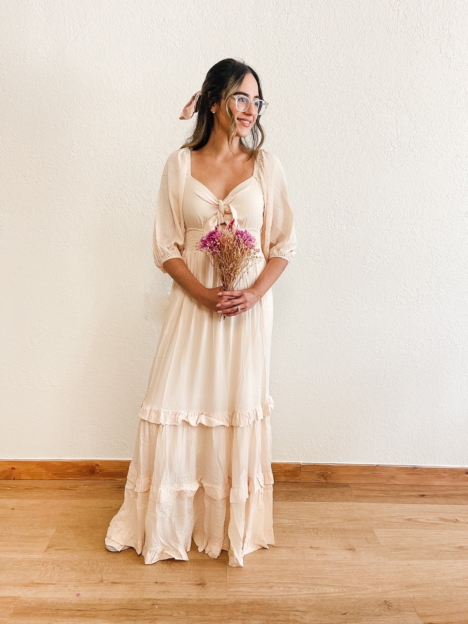 Dress features 3/4 puff sleeves, v-neck neckline with self-tie, mini ruffle tier detail and smocked waistline. Dress is lined.