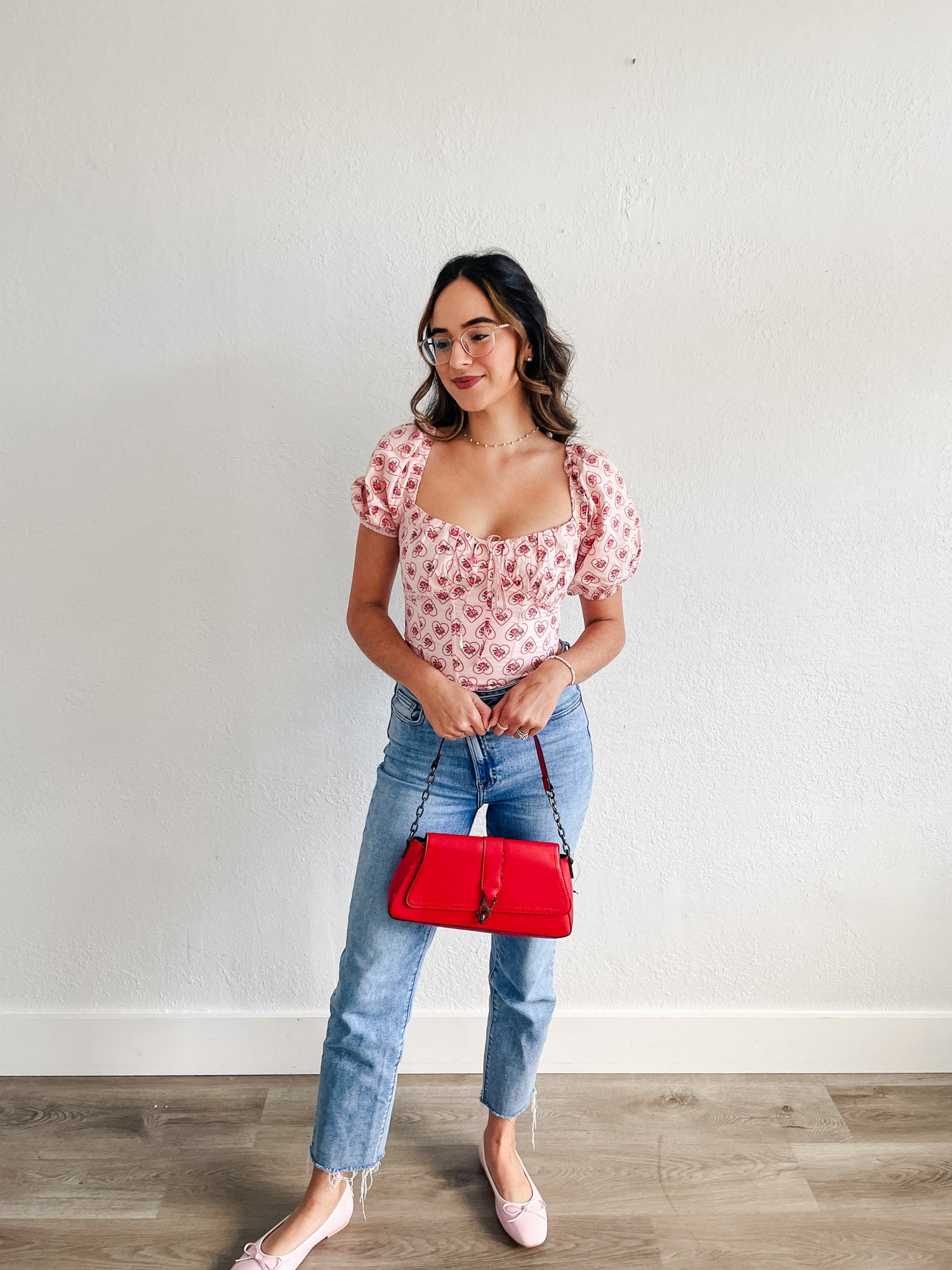 Top features hearts and roses print, puff sleeves, corset boning, tie detail, cropped length, zipper closure and lined bodice.