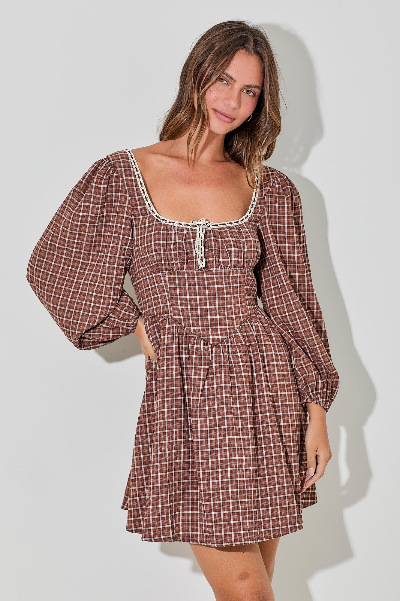 Dress features square neckline, bubble long sleeves, corset style bodice, collar lining, front tie detail.