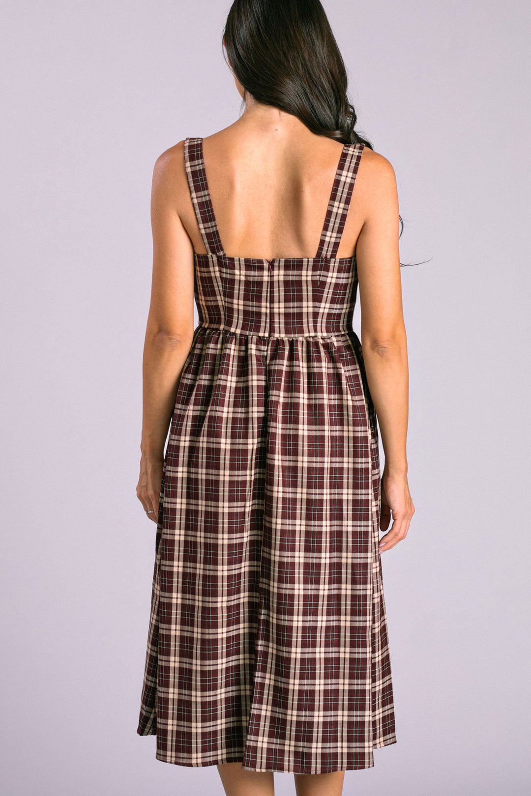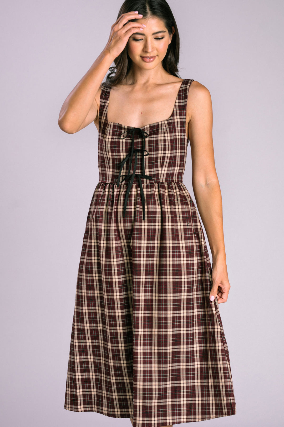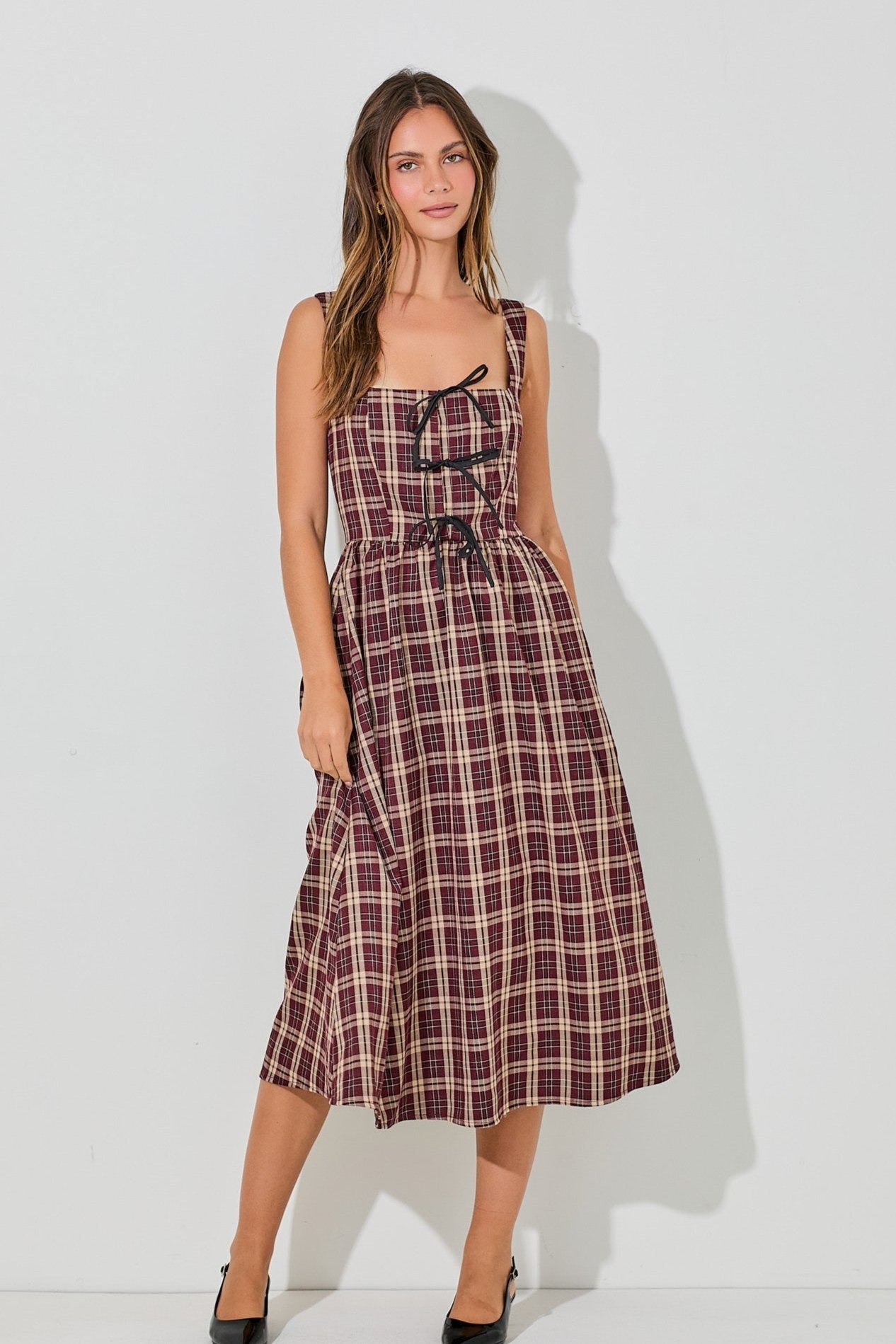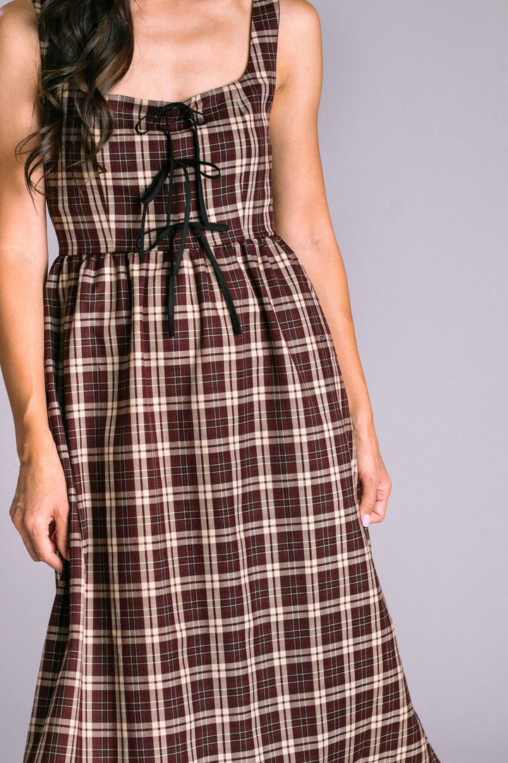 Dress features square neckline, playful bow detail, adjustable straps, hidden pockets, plaid pattern, midi length. Lined bust, unlined skirt.