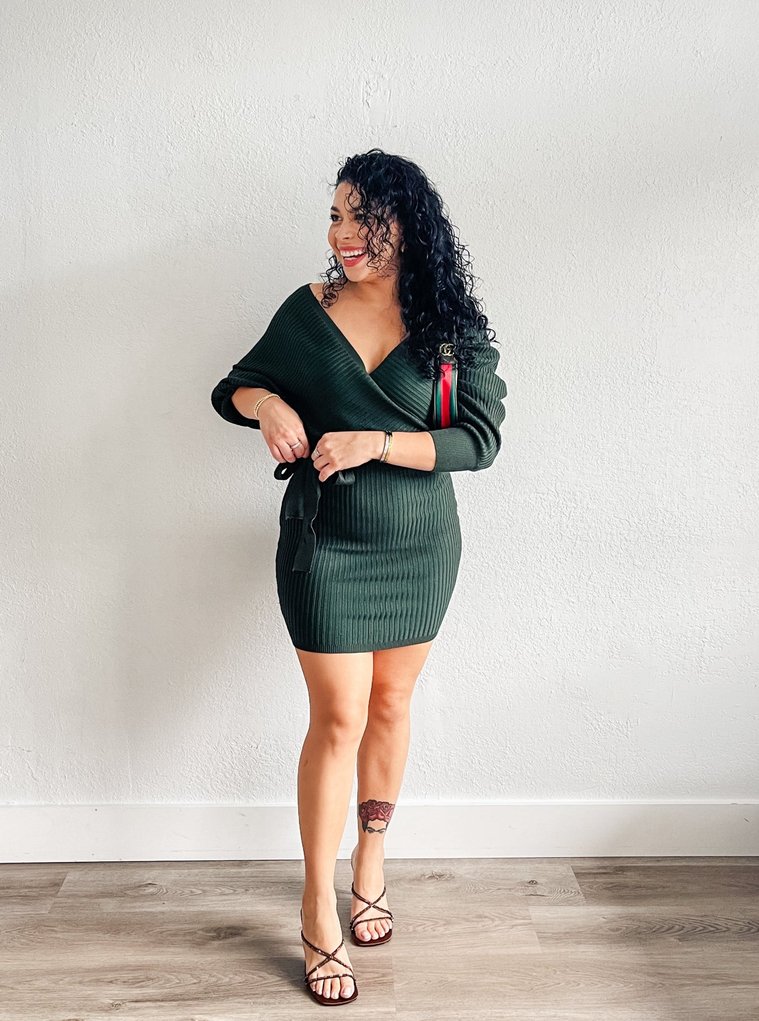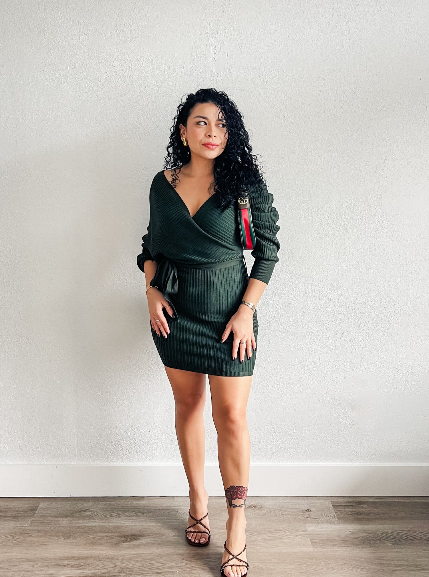 Dress features Off Shoulder, Relaxed Fit, Adjustable Removable Self Tie Belt, Front Surplice Wrap Detail, All Over Ribbed Body and Mini Length Bodice.