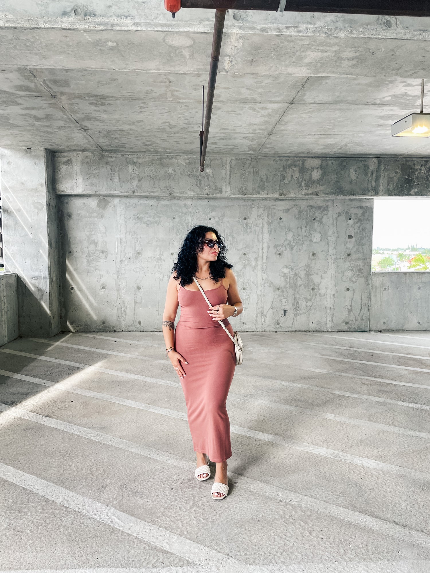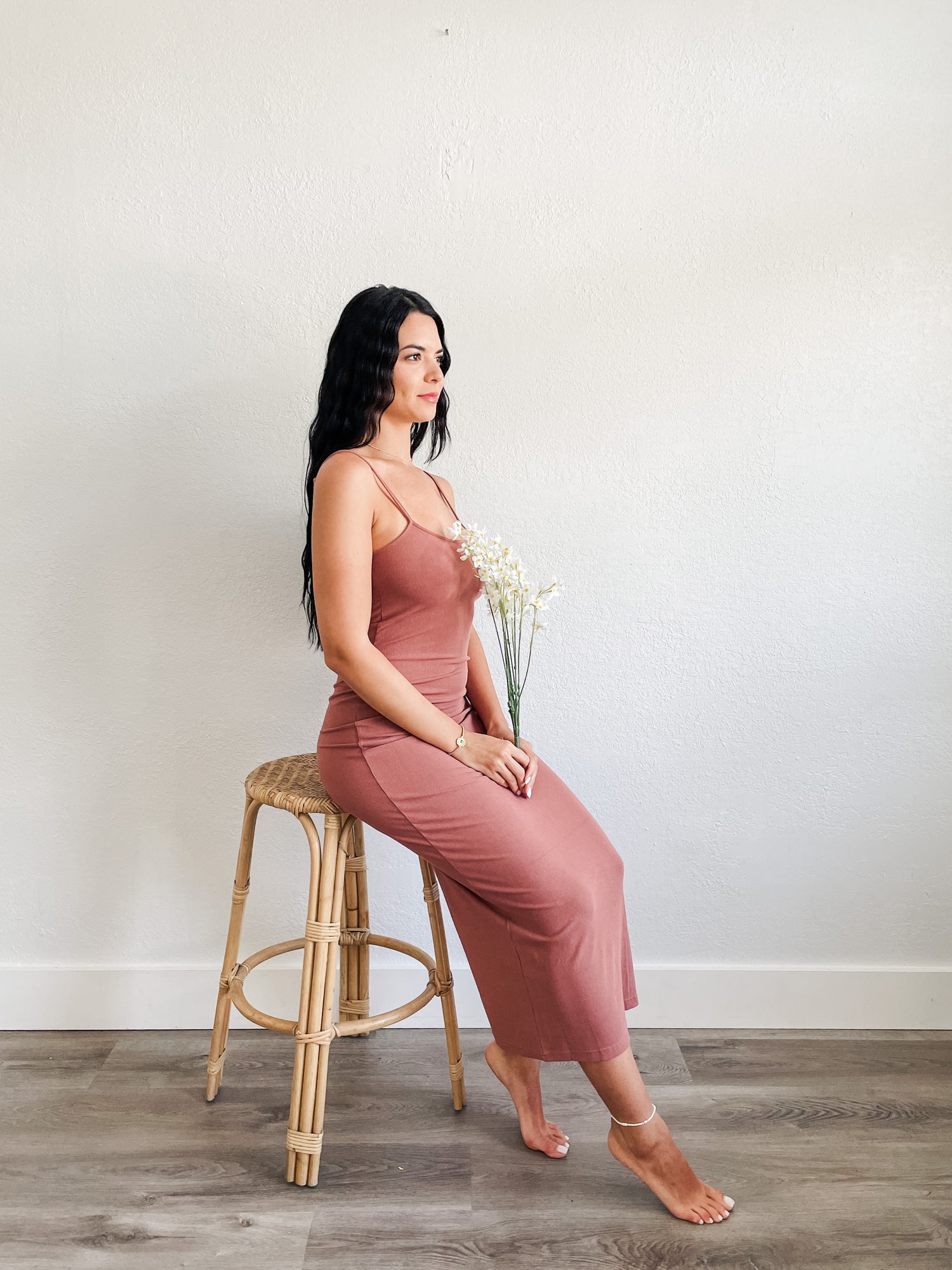 Dress features medium weight ribbed knit maxi dress, figure hugging fit, straight neck and adjustable straps.