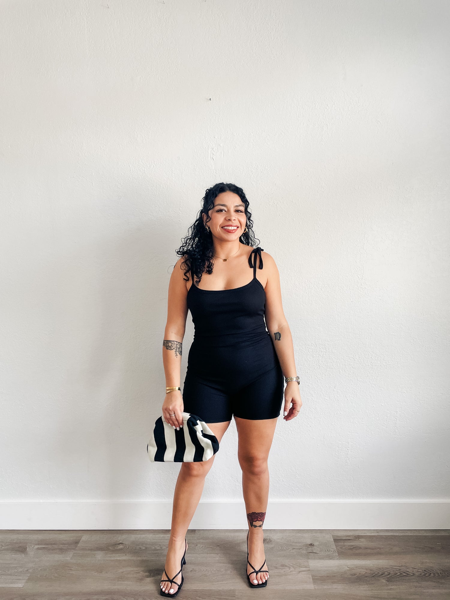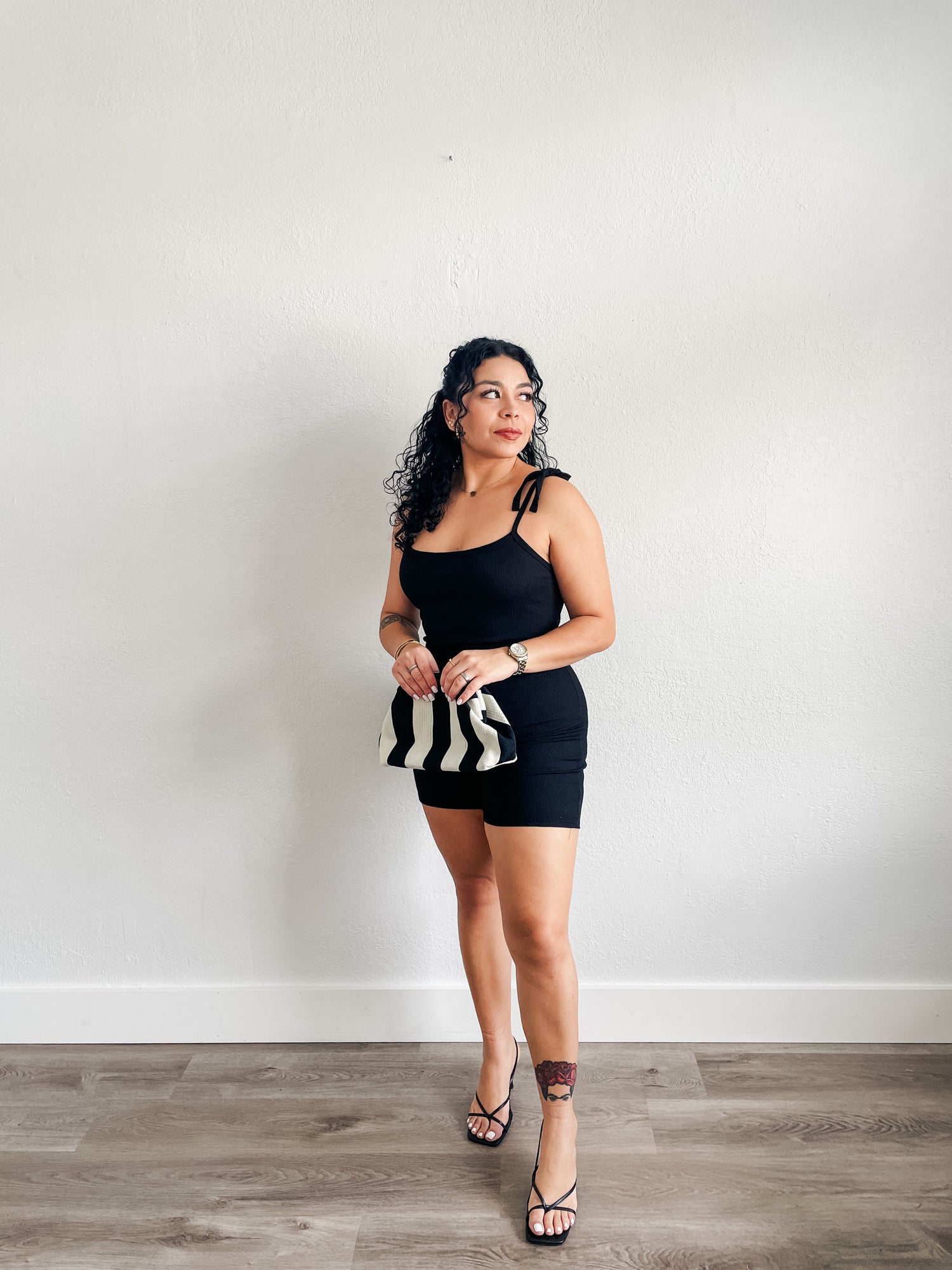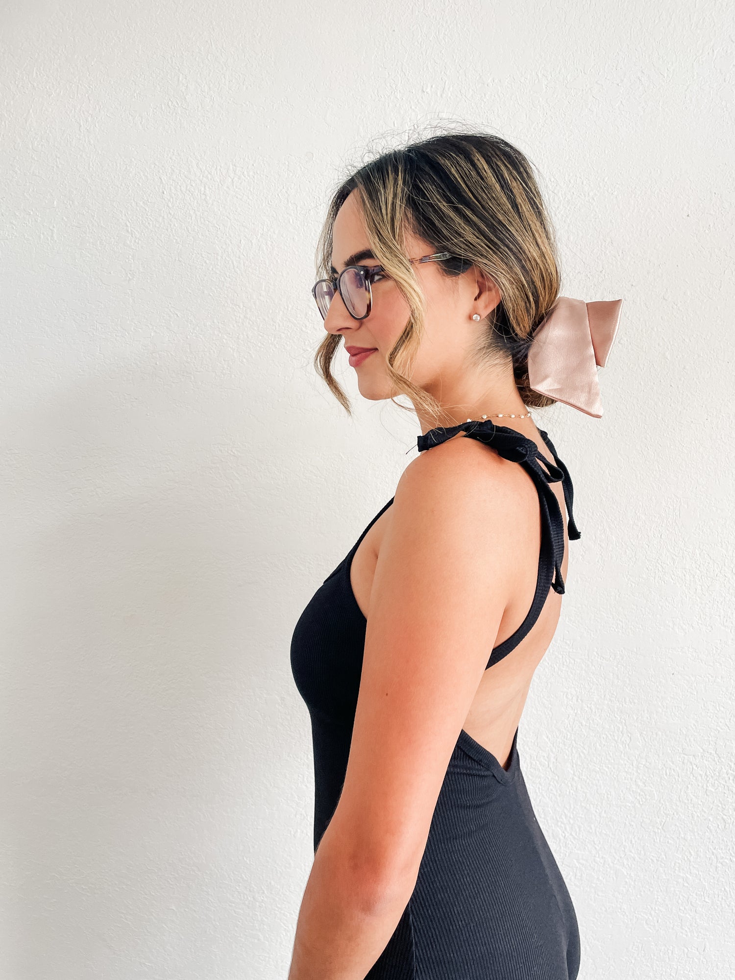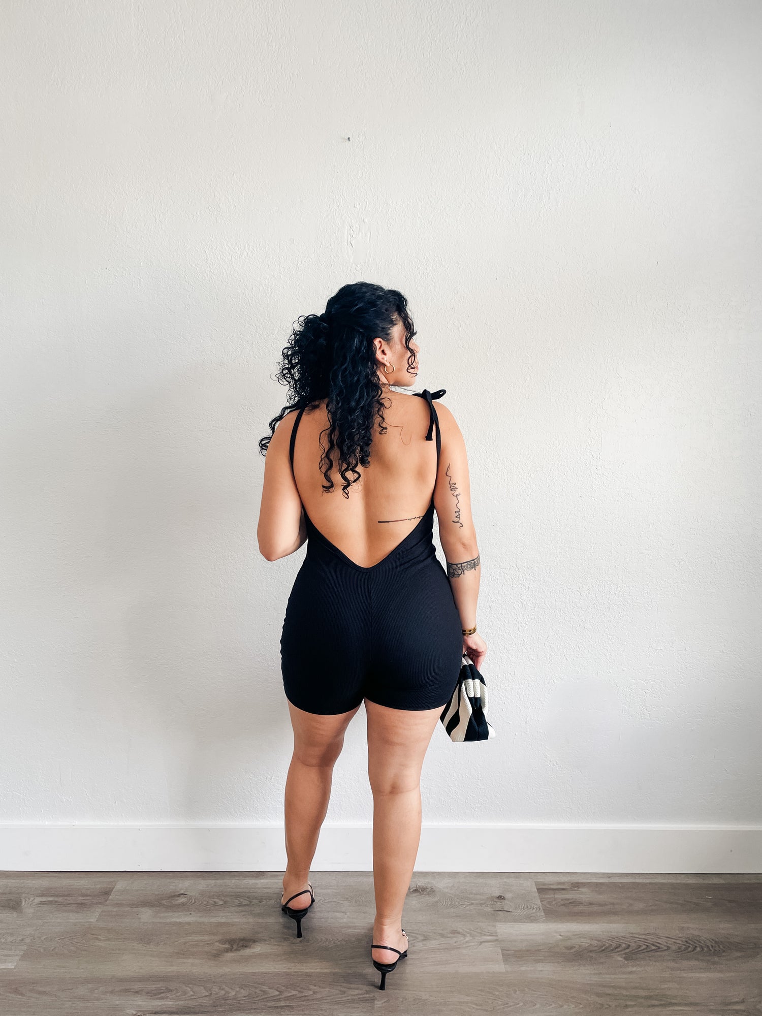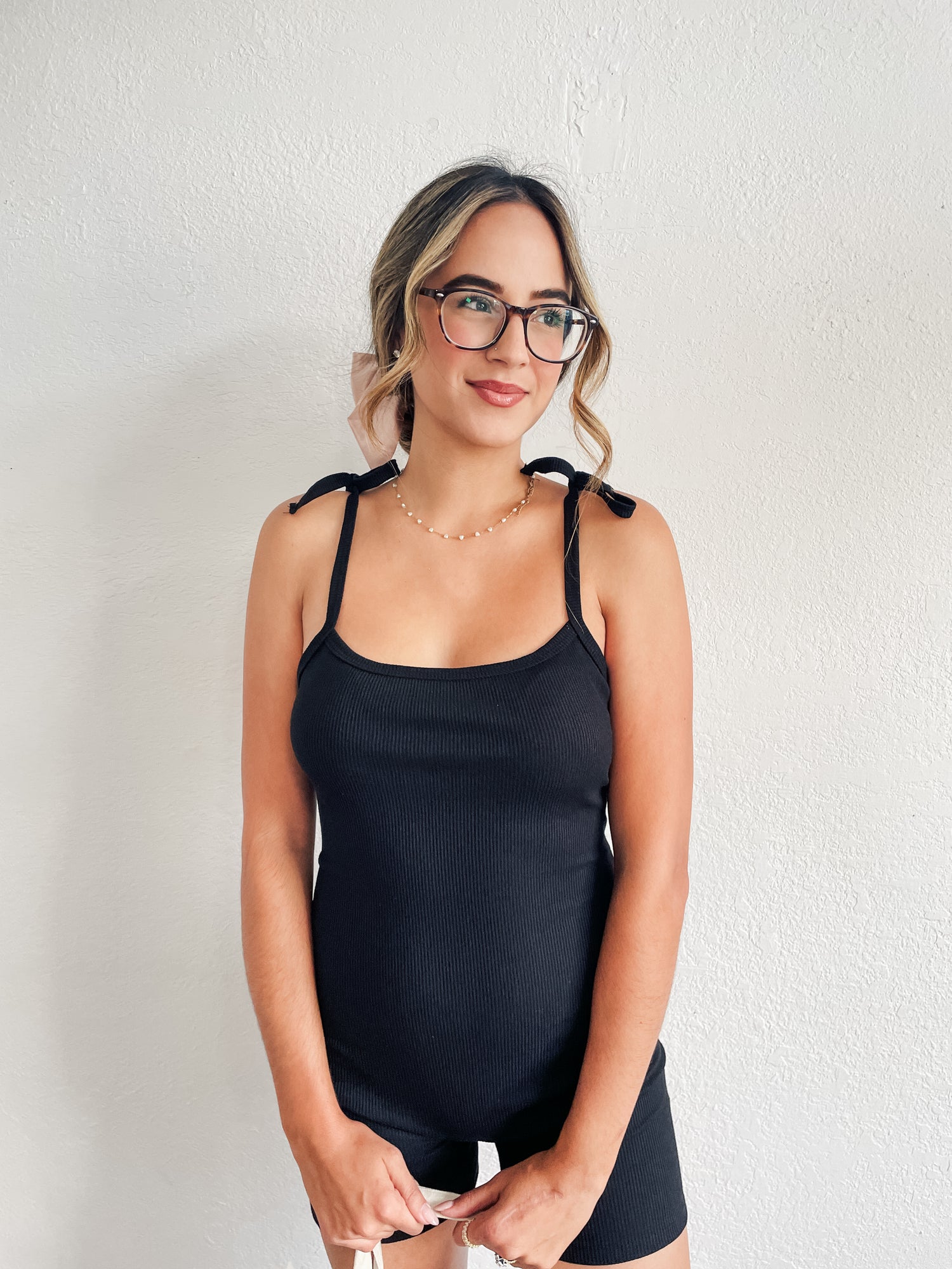 Romper features open v- back, ribbed material, square neckline and strap bow detail.