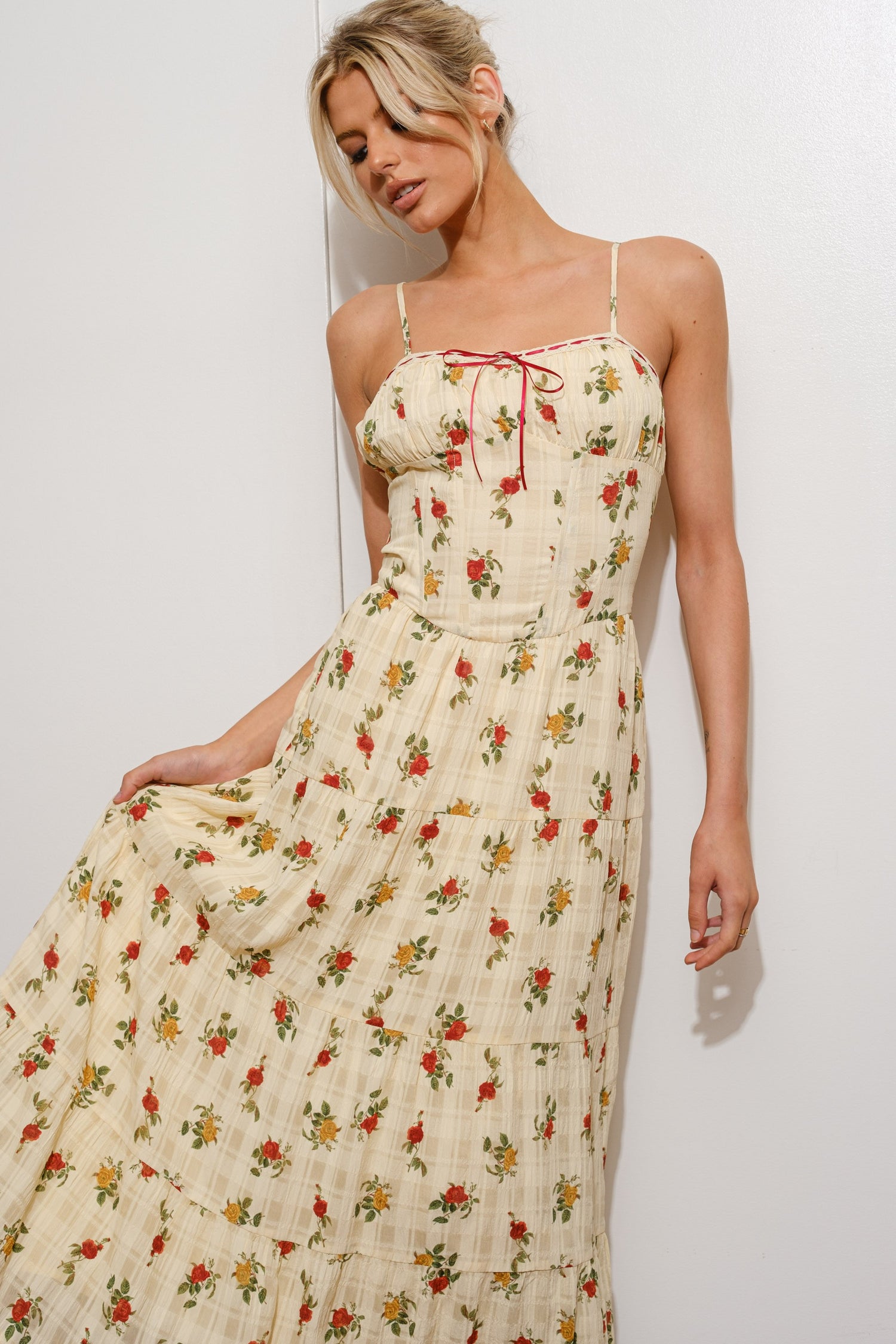 Dress features plaid and floral combo print, lace and satin ribbon trim detail, adjustable spaghetti straps, bustier design, tiered layers and fully lined.