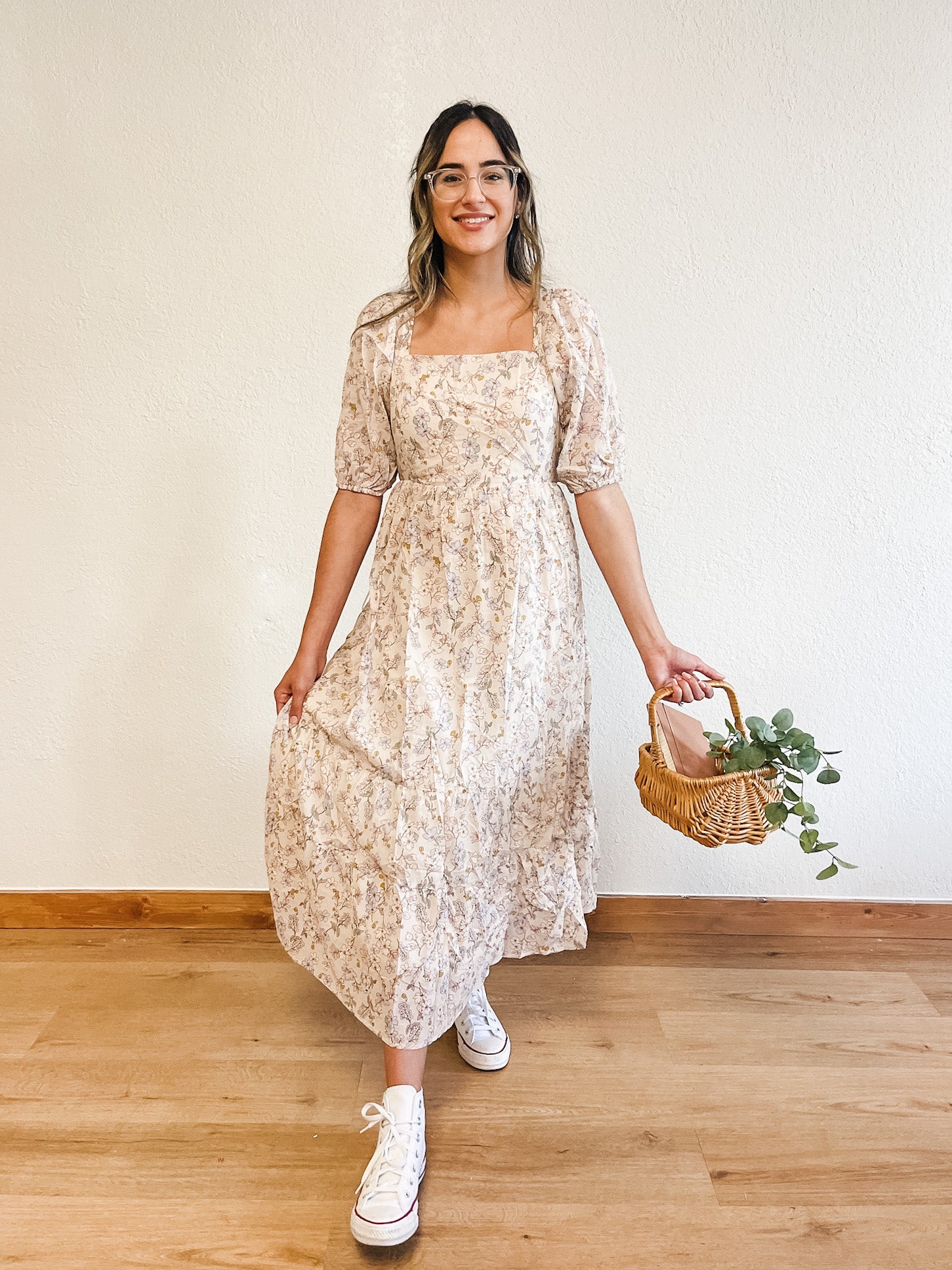 Dress features midi length made with floral printed breezy cotton voile fabric. It has a square neckline, 1/2 puff sleeves, and elastic bands on the back waist, and sleeve openings. The tie closure on the back neckline keeps the sleeve on. Fully lined.