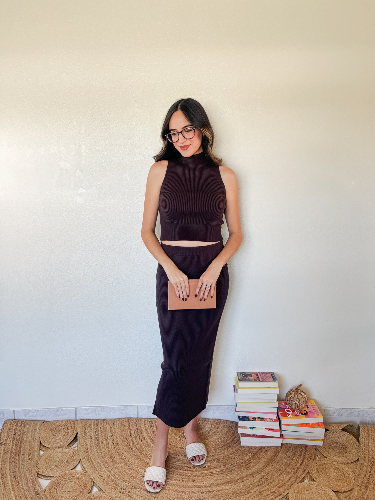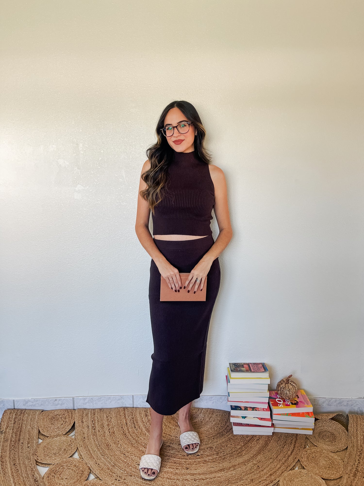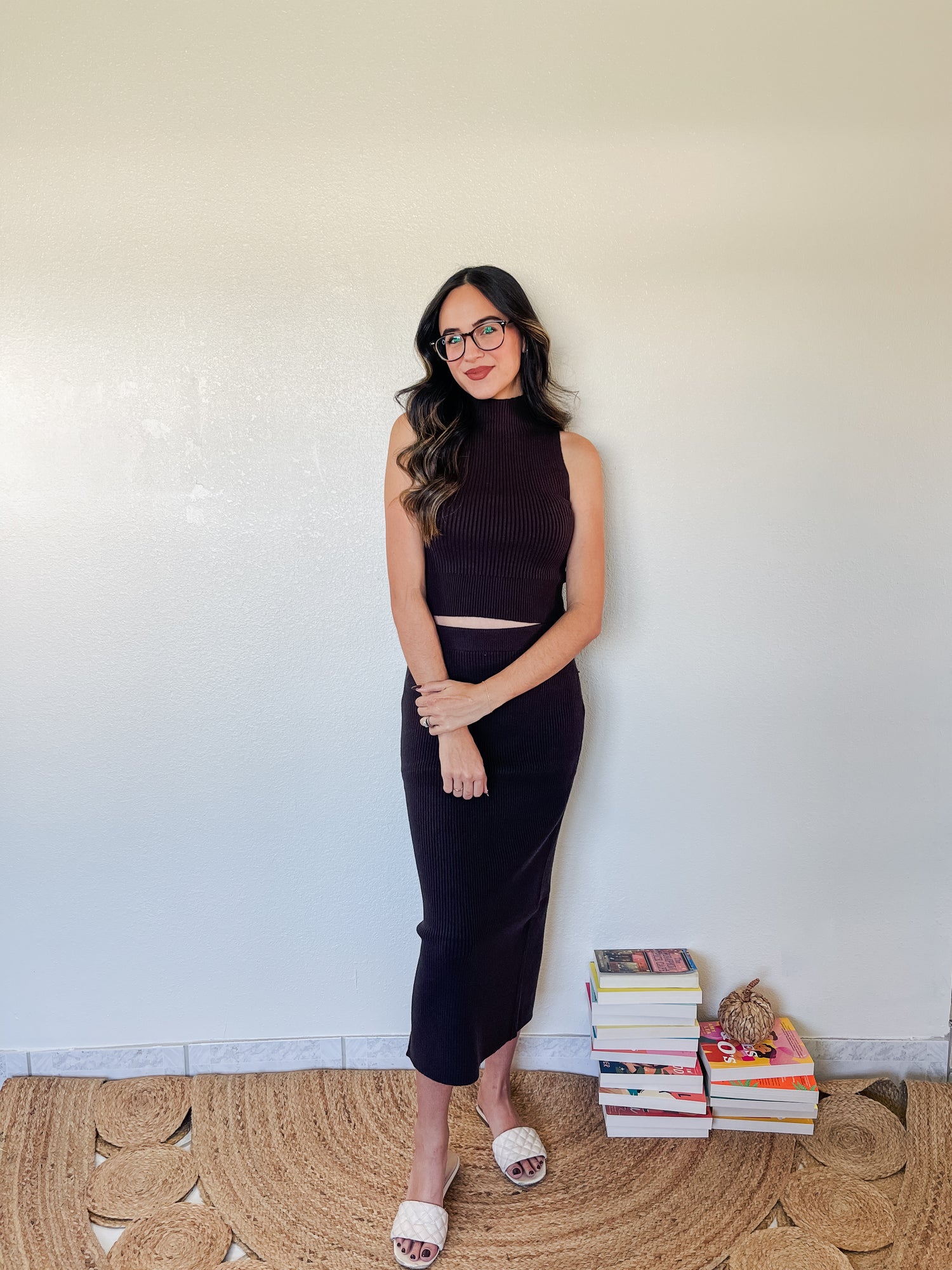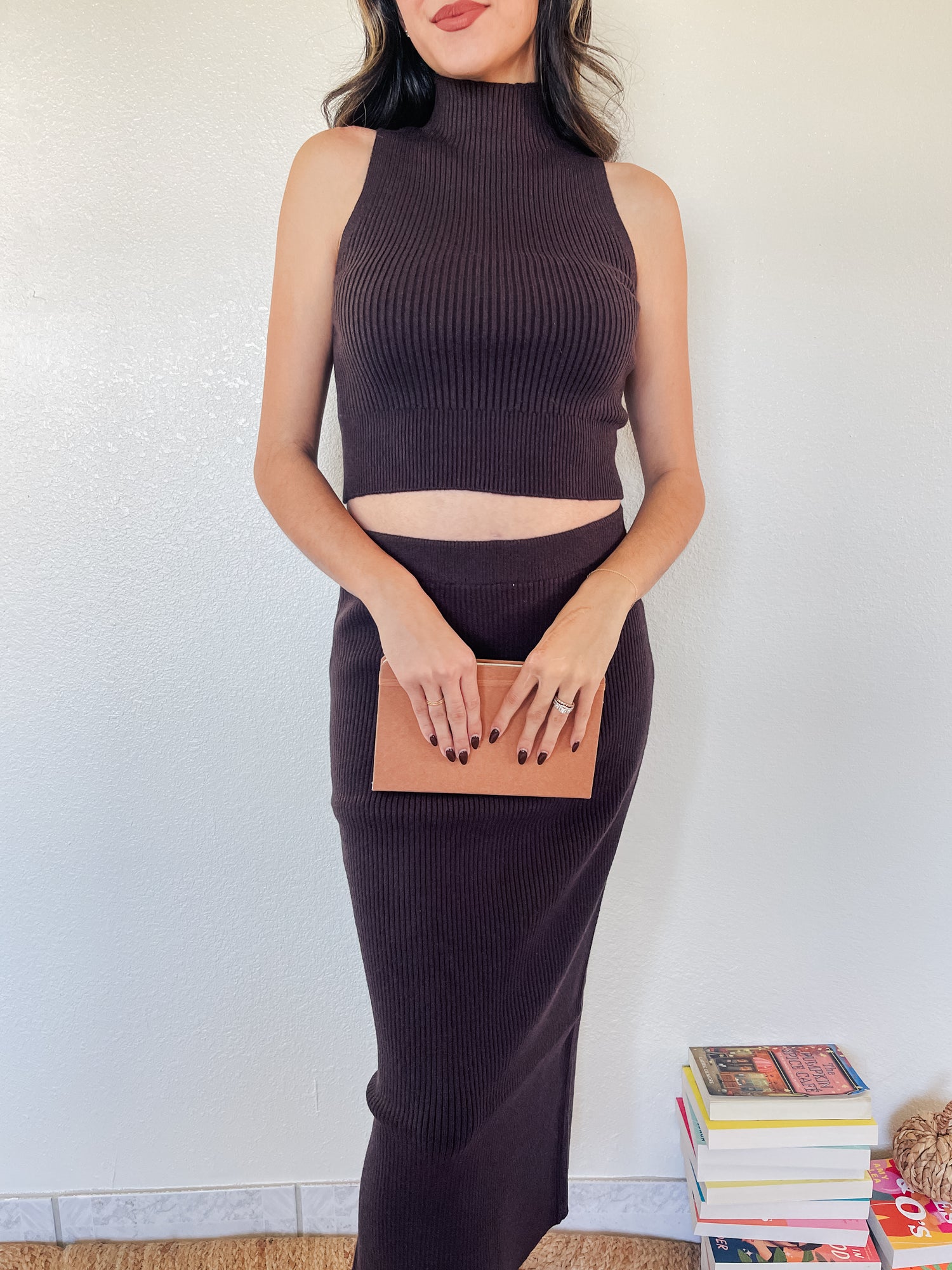Set features a sleeveless cropped top, high neck, ribbed material paired with matching high waist skirt with center back slit.
