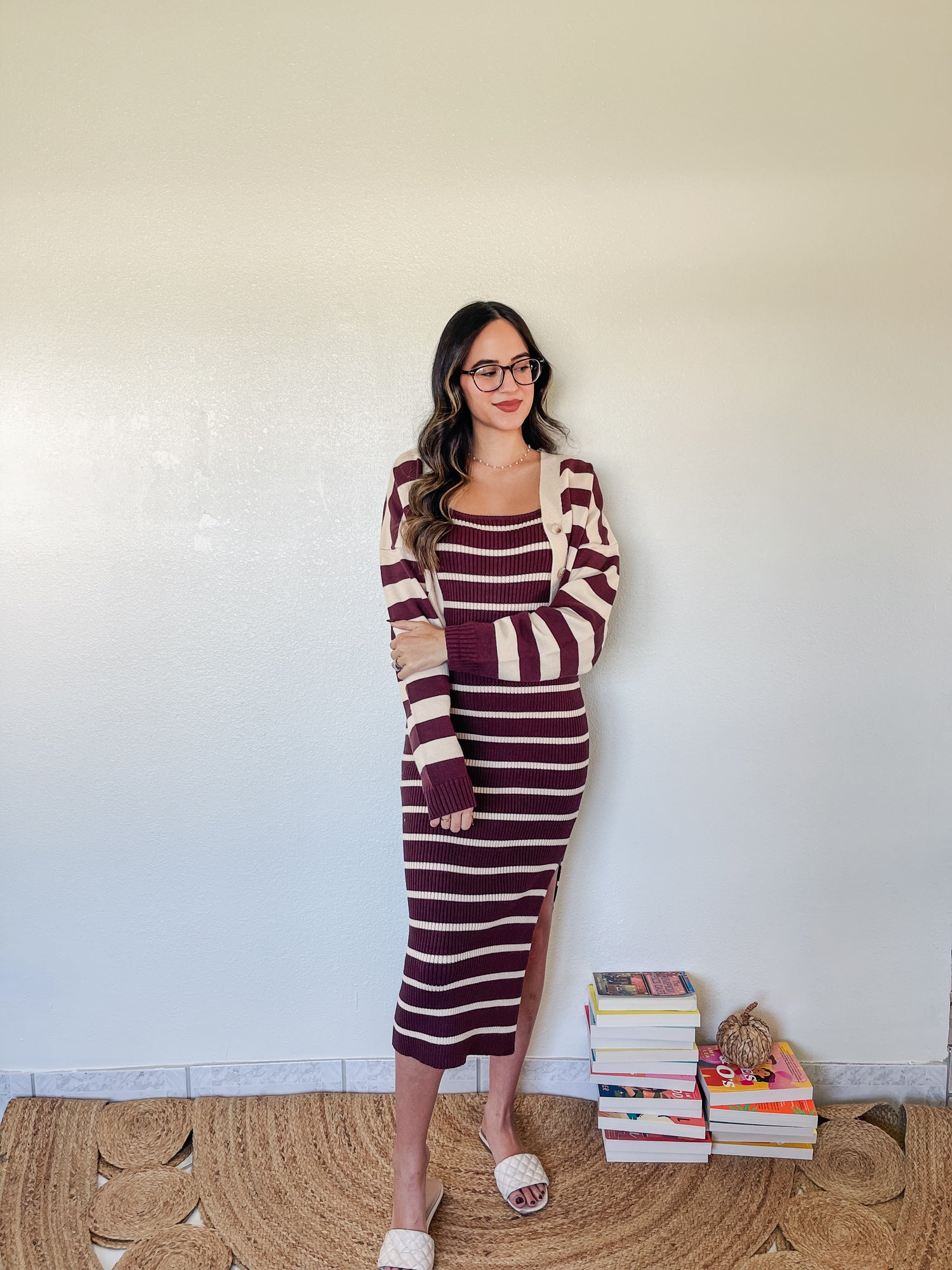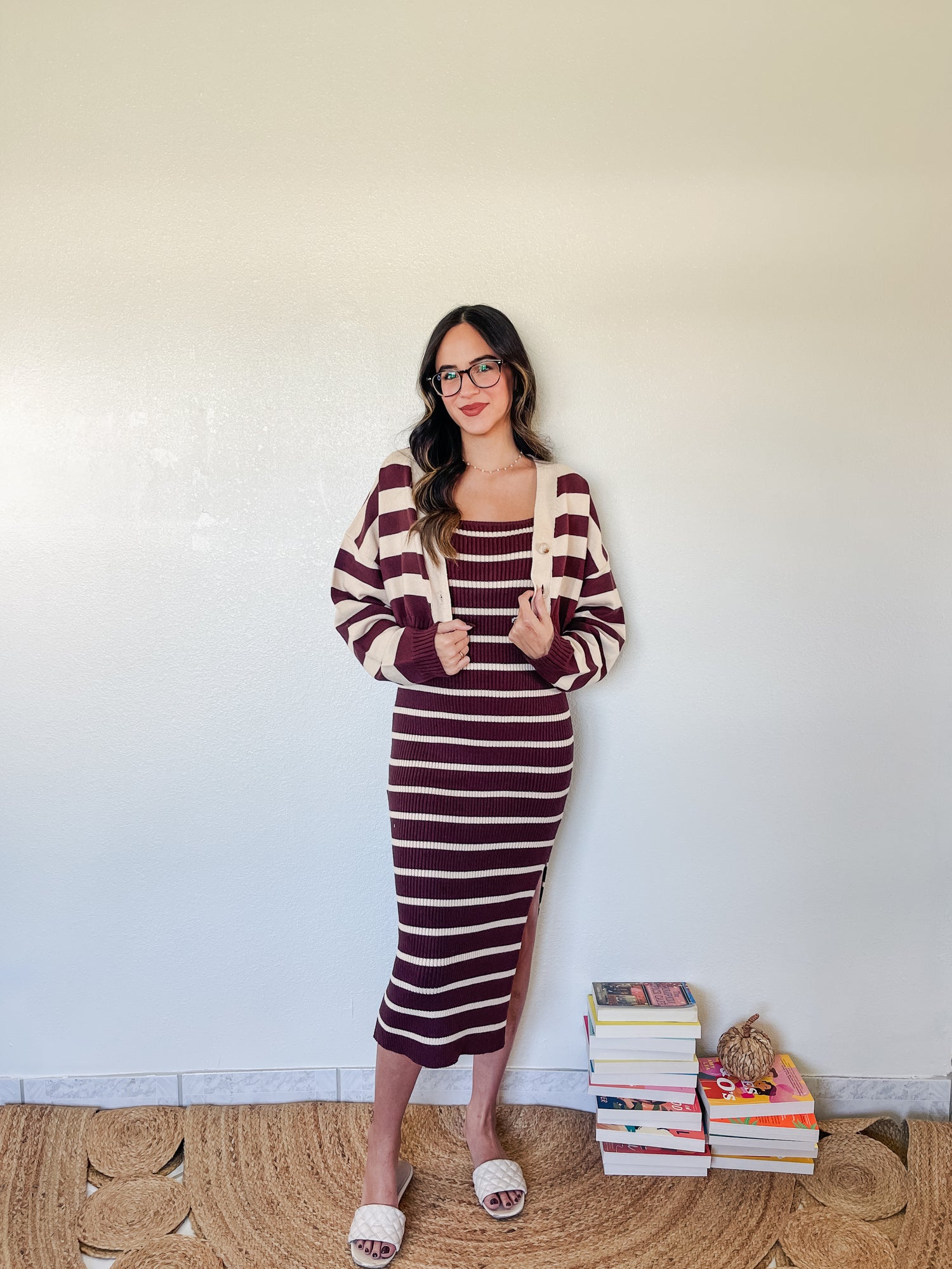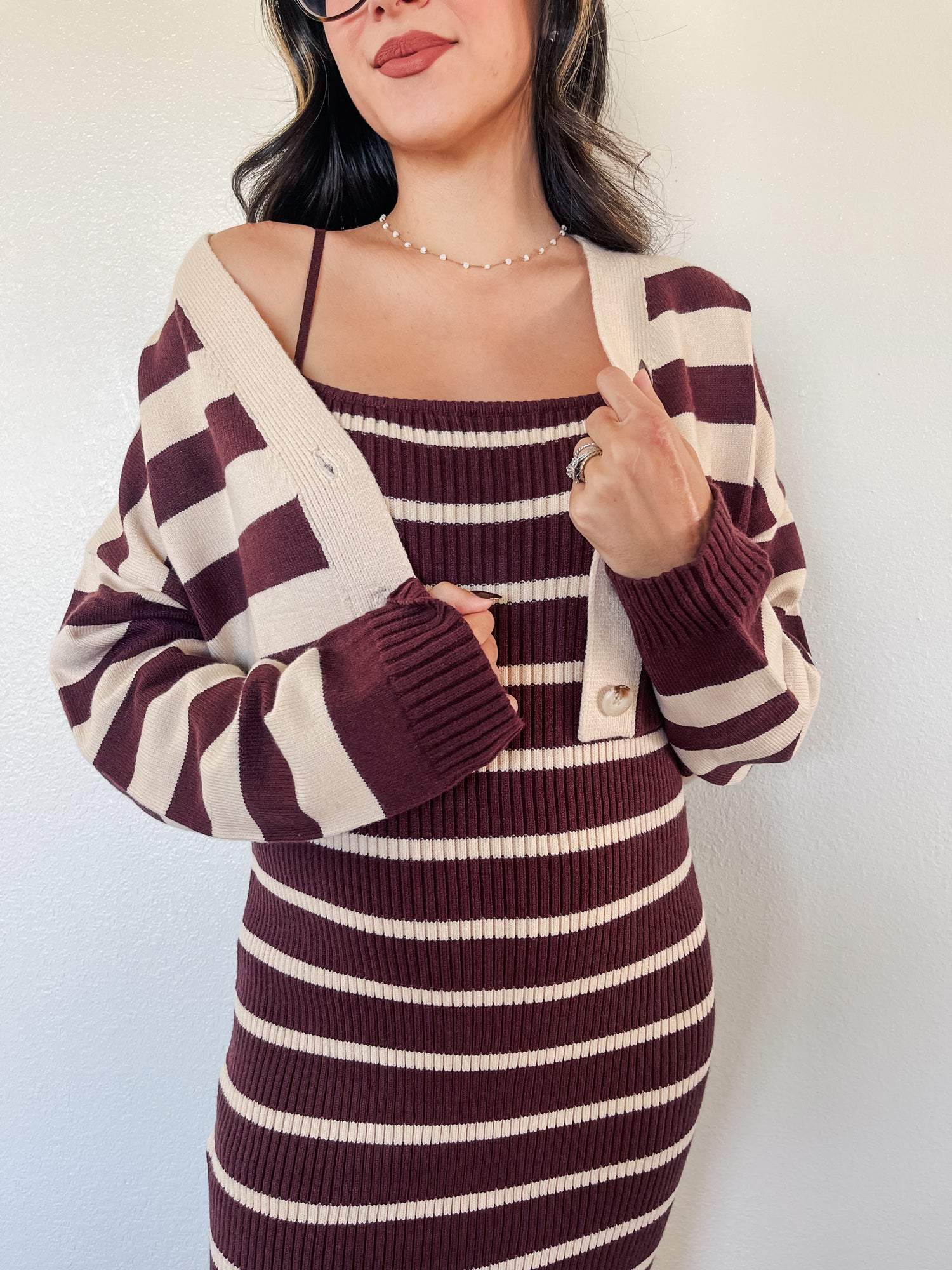 Set features knit sweater thick stripe crop button down cardigan and matching thin stripe spaghetti strap bodycon midi dress with side slit detail set.