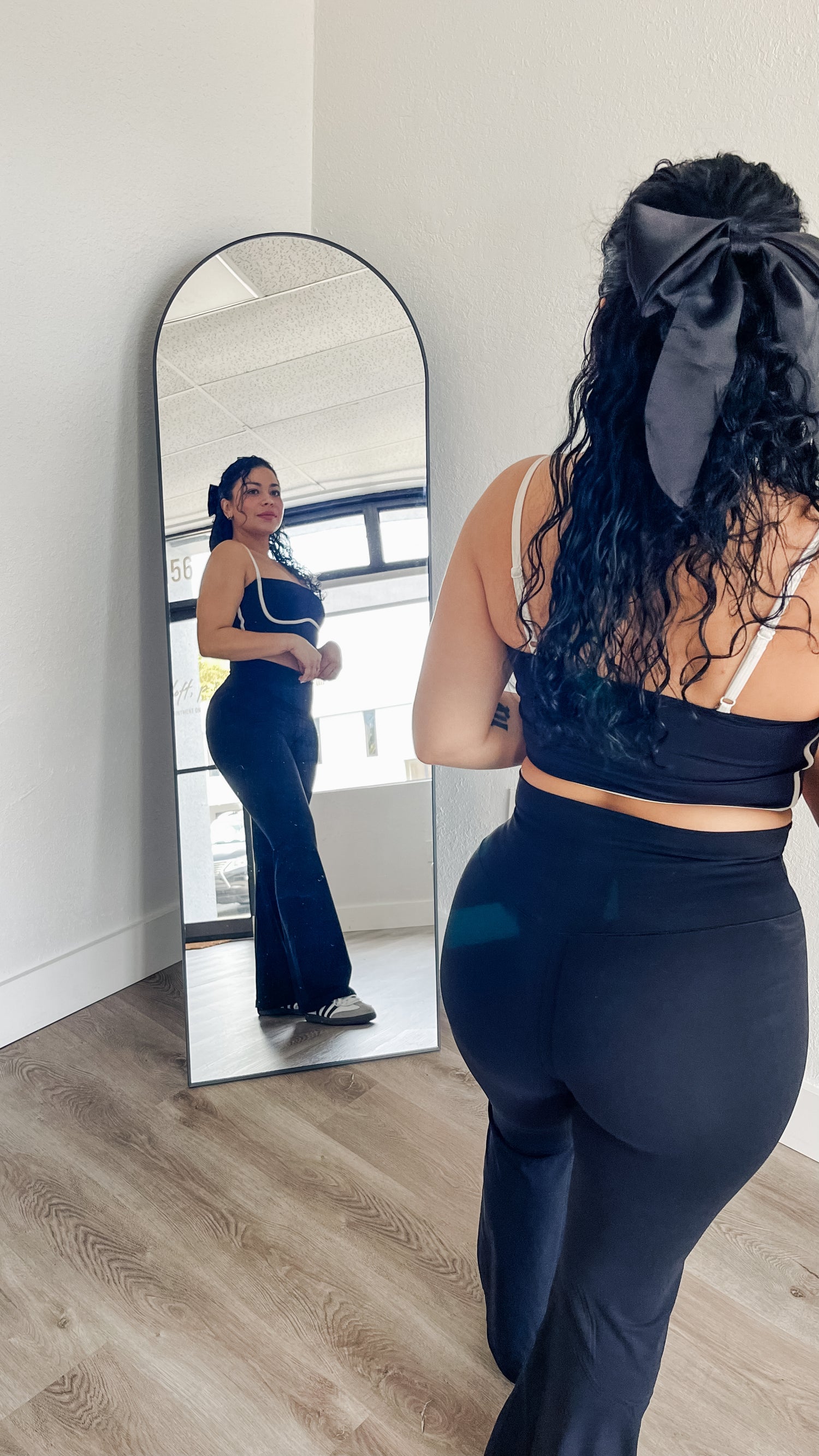 Bottoms feature butter-soft, second-skin flare leggings with crossover waist detail.