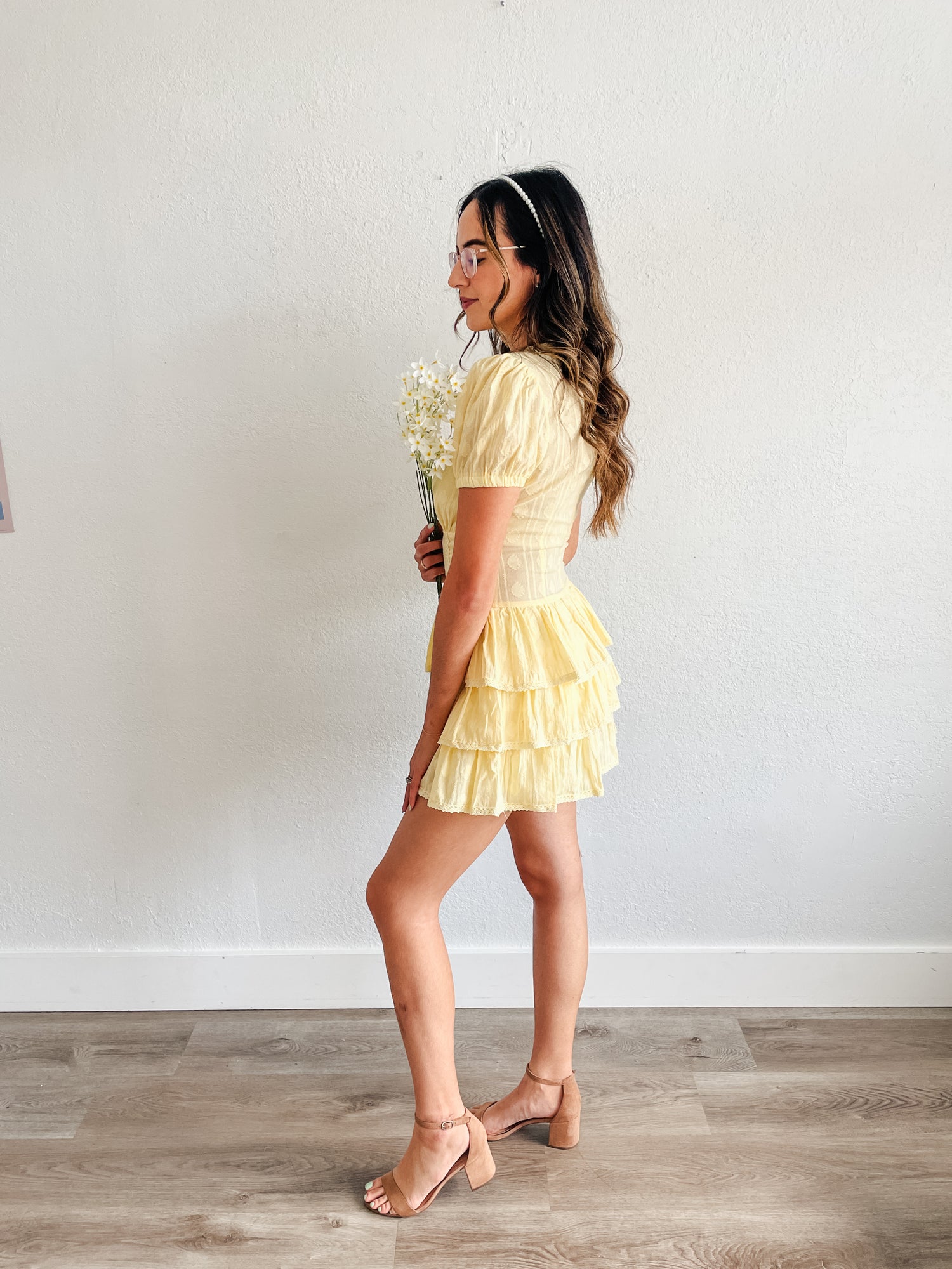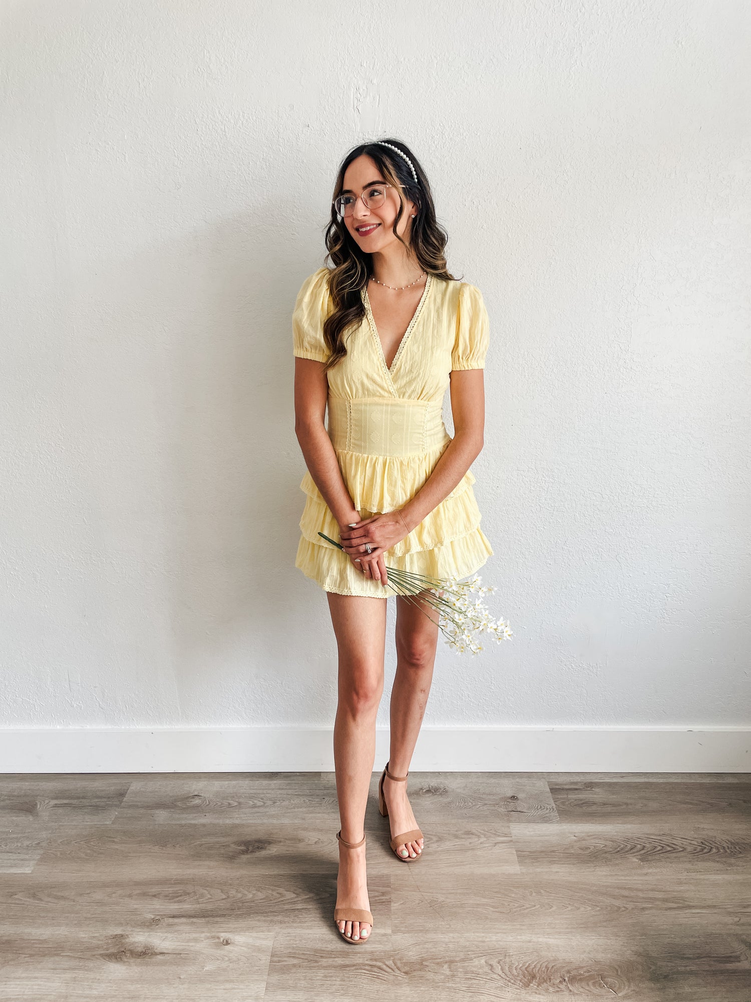 Dress features tiered flounce skirt, puff sleeves, lace neckline, hidden shorts and hidden zipper.