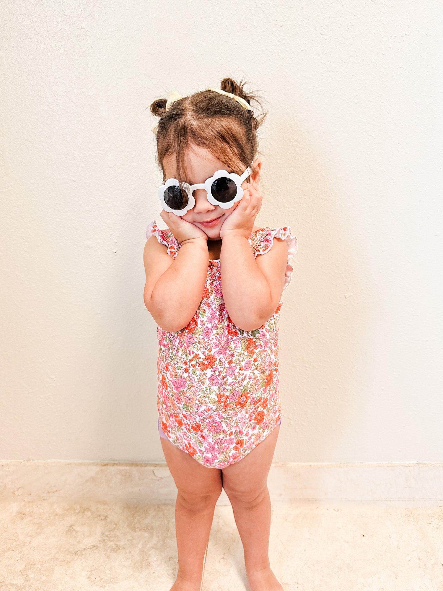 Swimsuit features tank 1 piece with ruffles around the shoulder, scoop back design and UPF 50+.