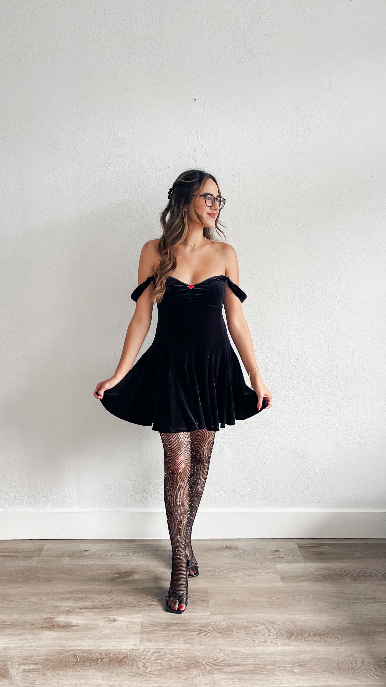 Dress features velvet material, short sleeves with lace detail, corset shape and mini length.