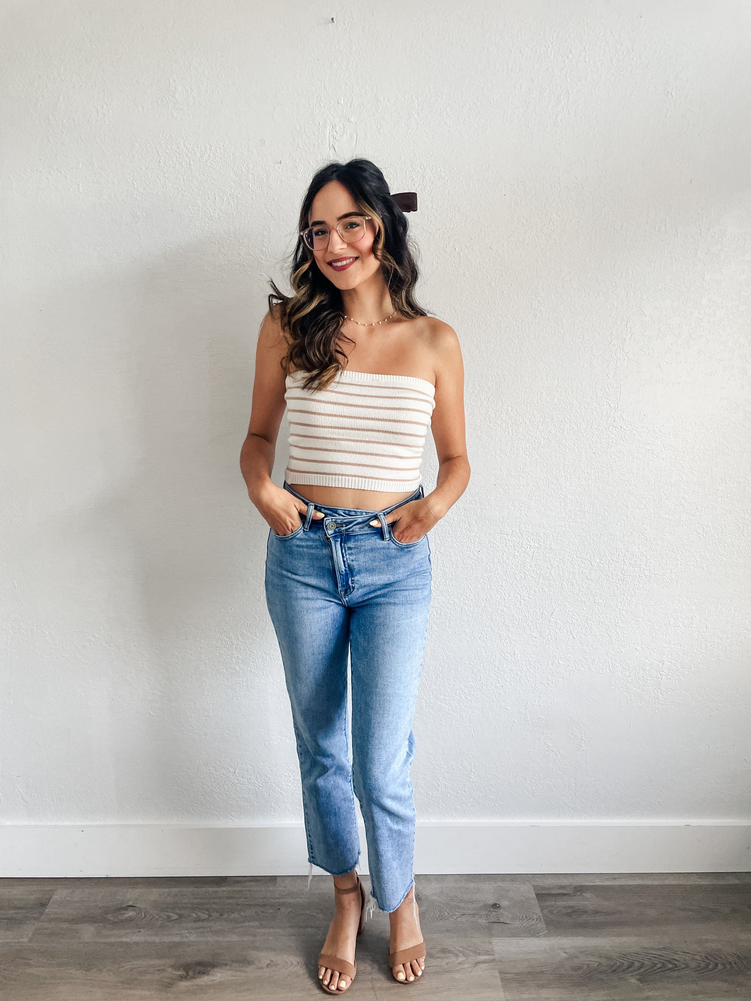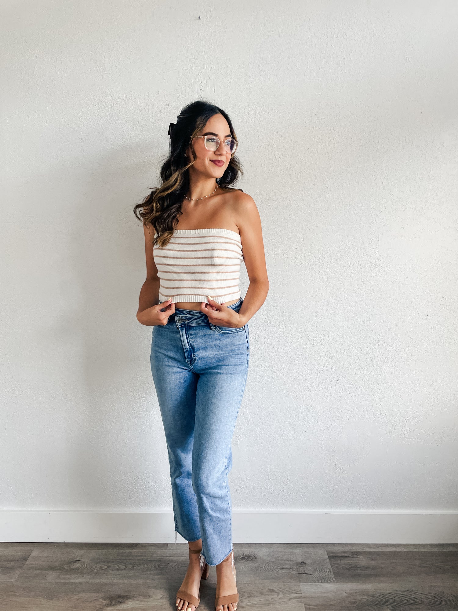 Dress features a knit fabric, stripe design, tube style with lots of stretch.