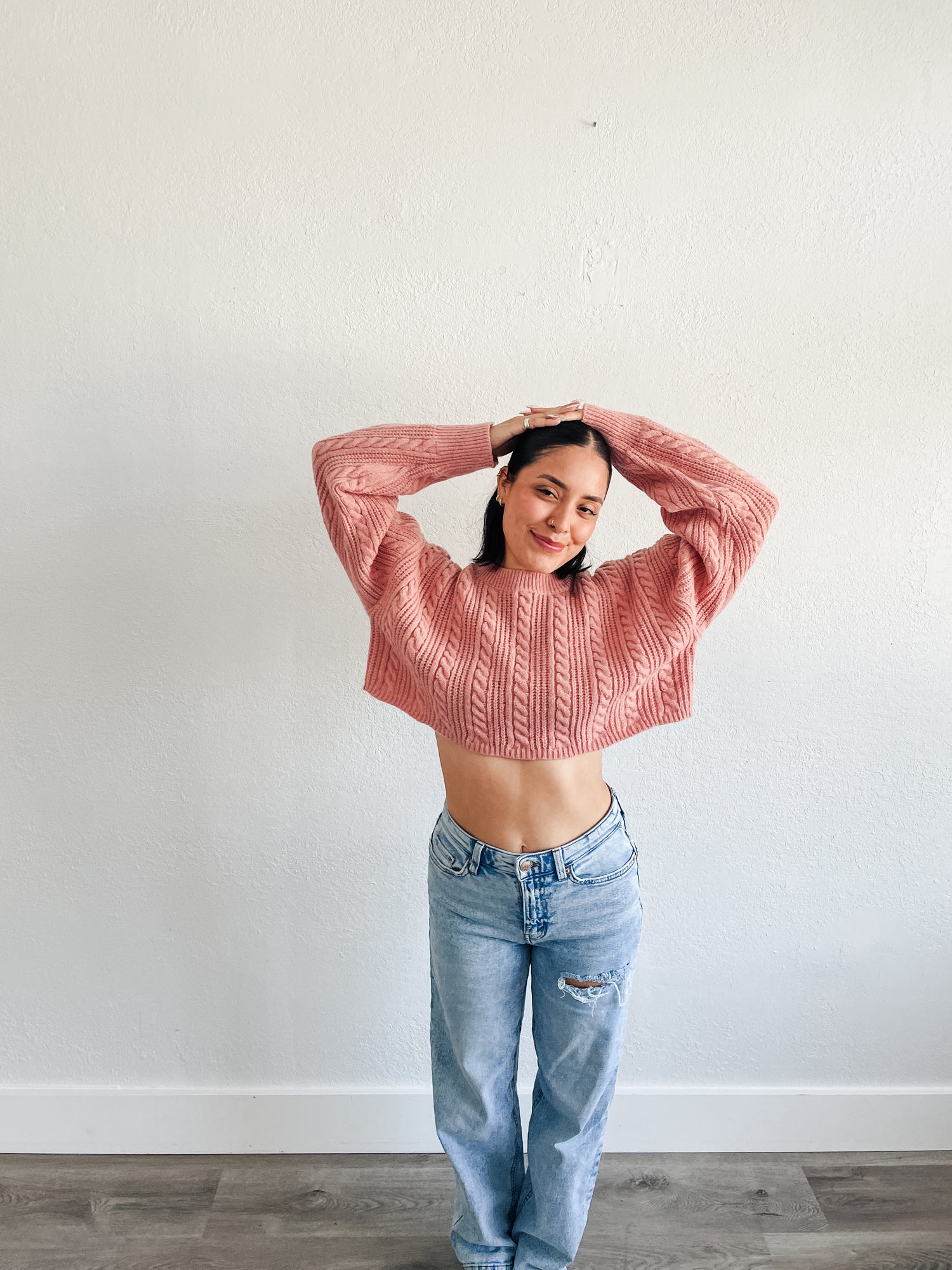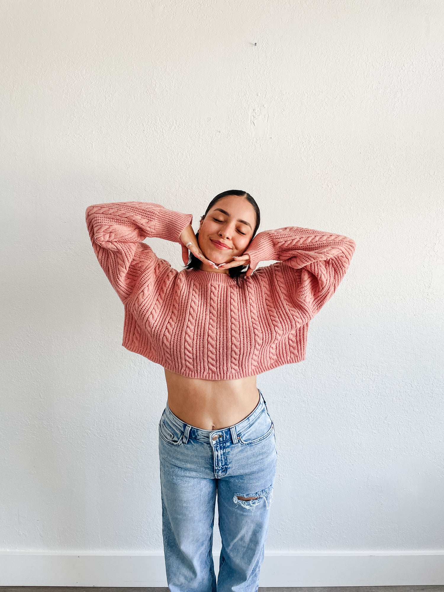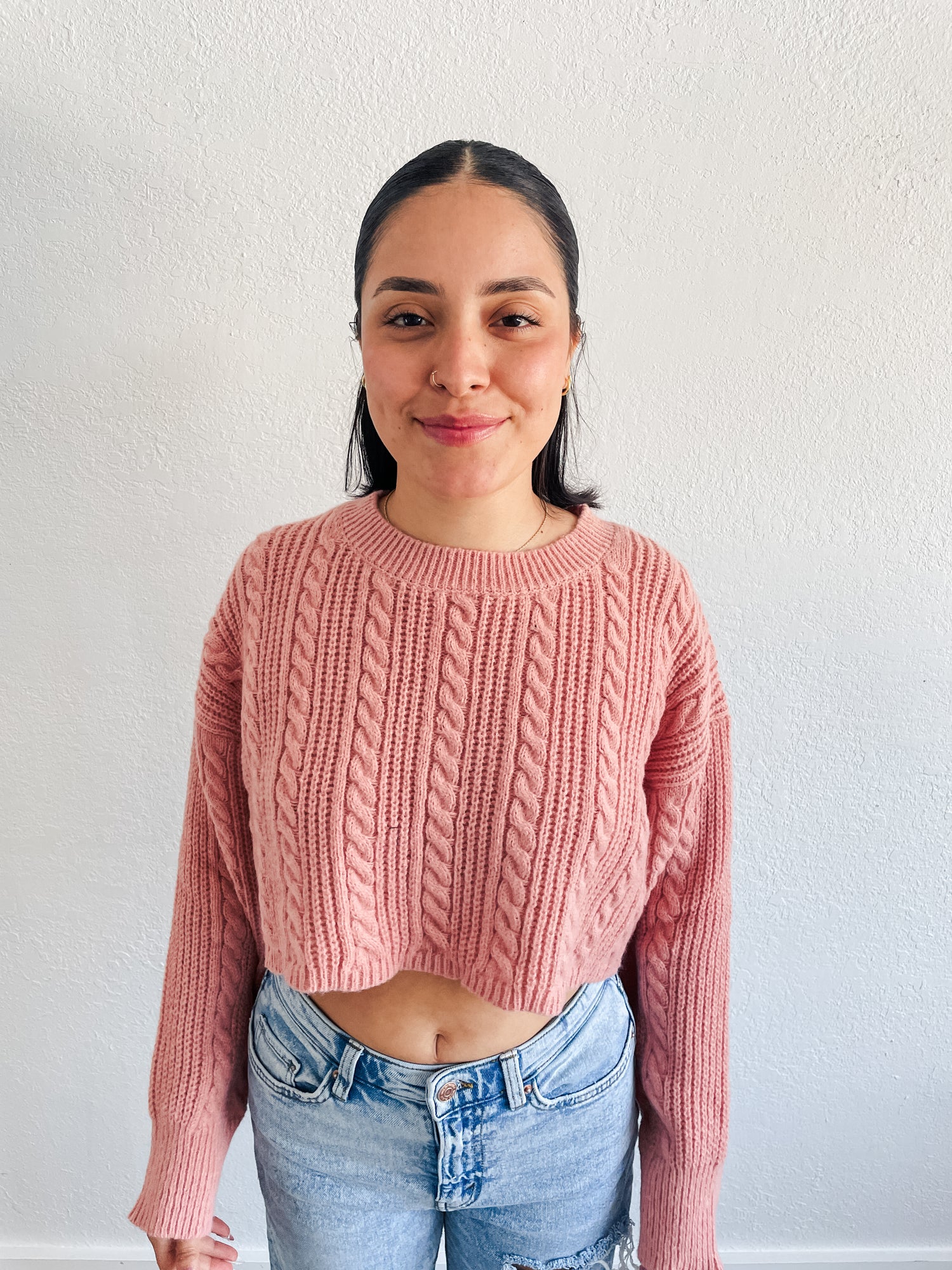 Sweater features a cable knit material, crop length, crew neckline with cozy feel.