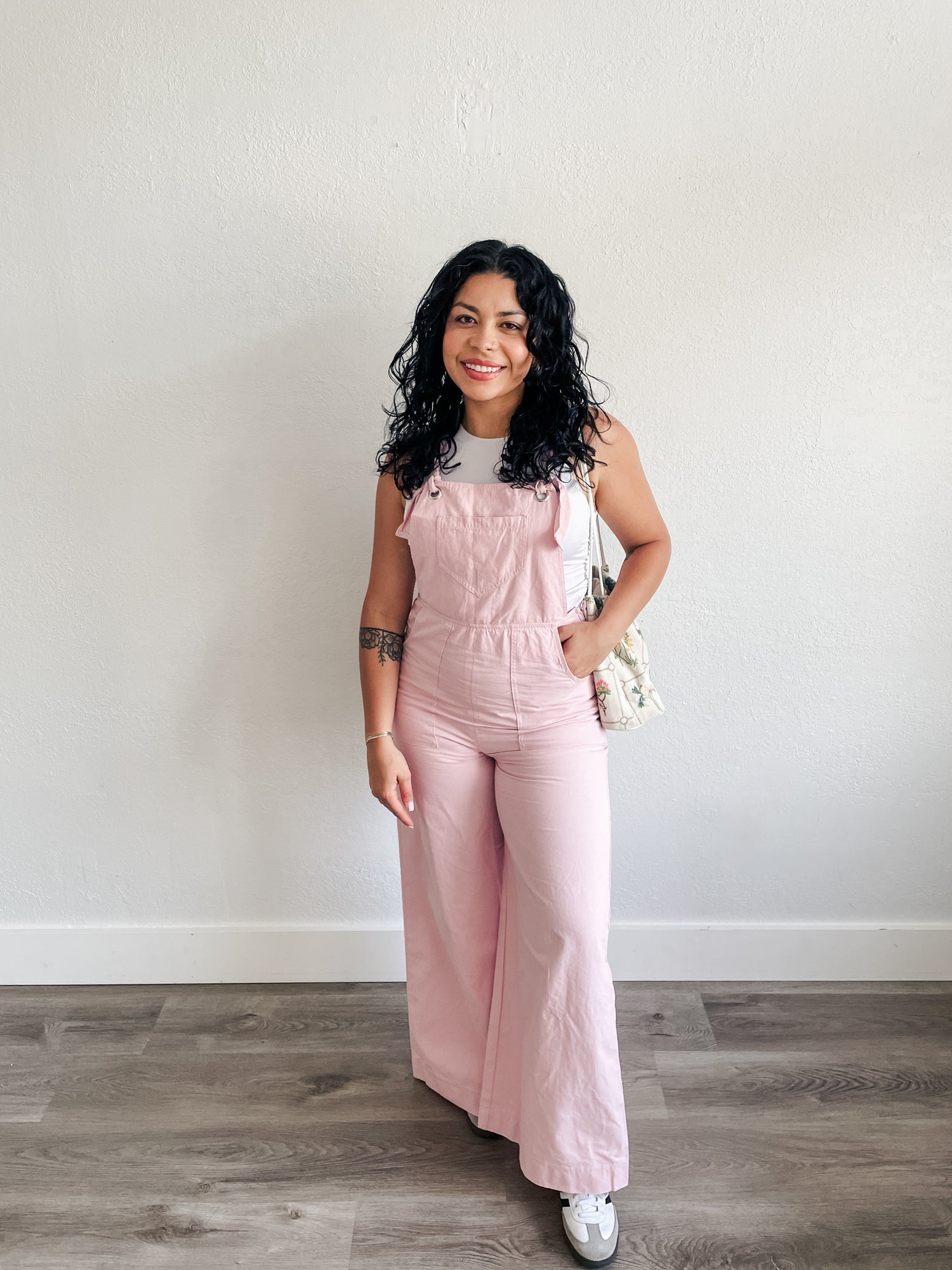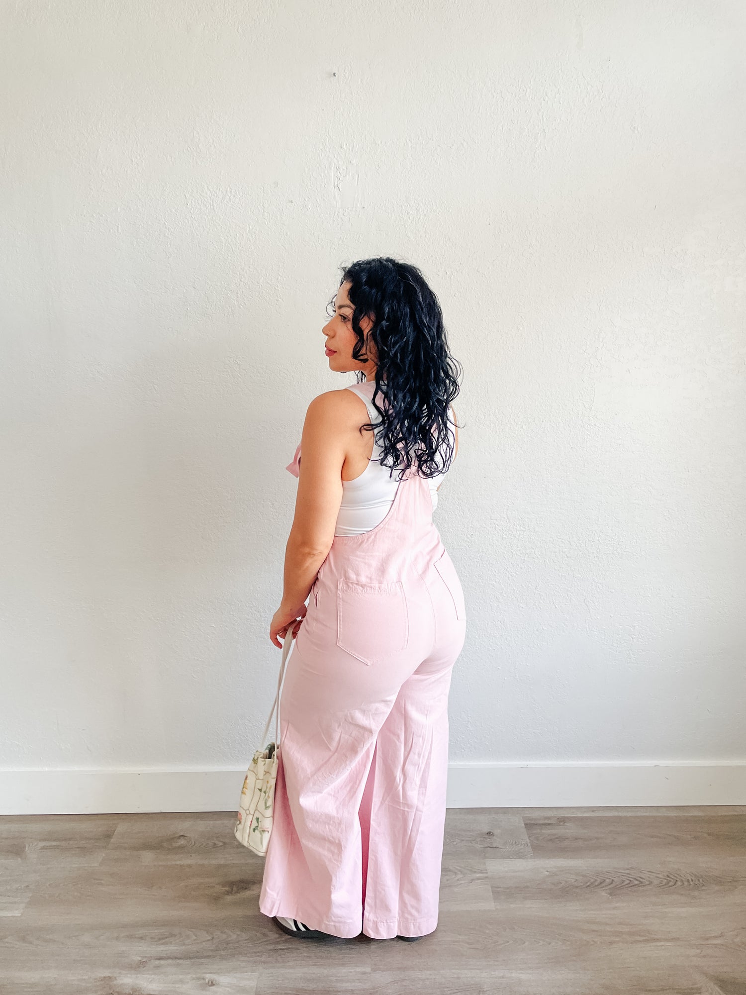 Overalls features wide leg, knotted strap detail, front, side and back pockets.