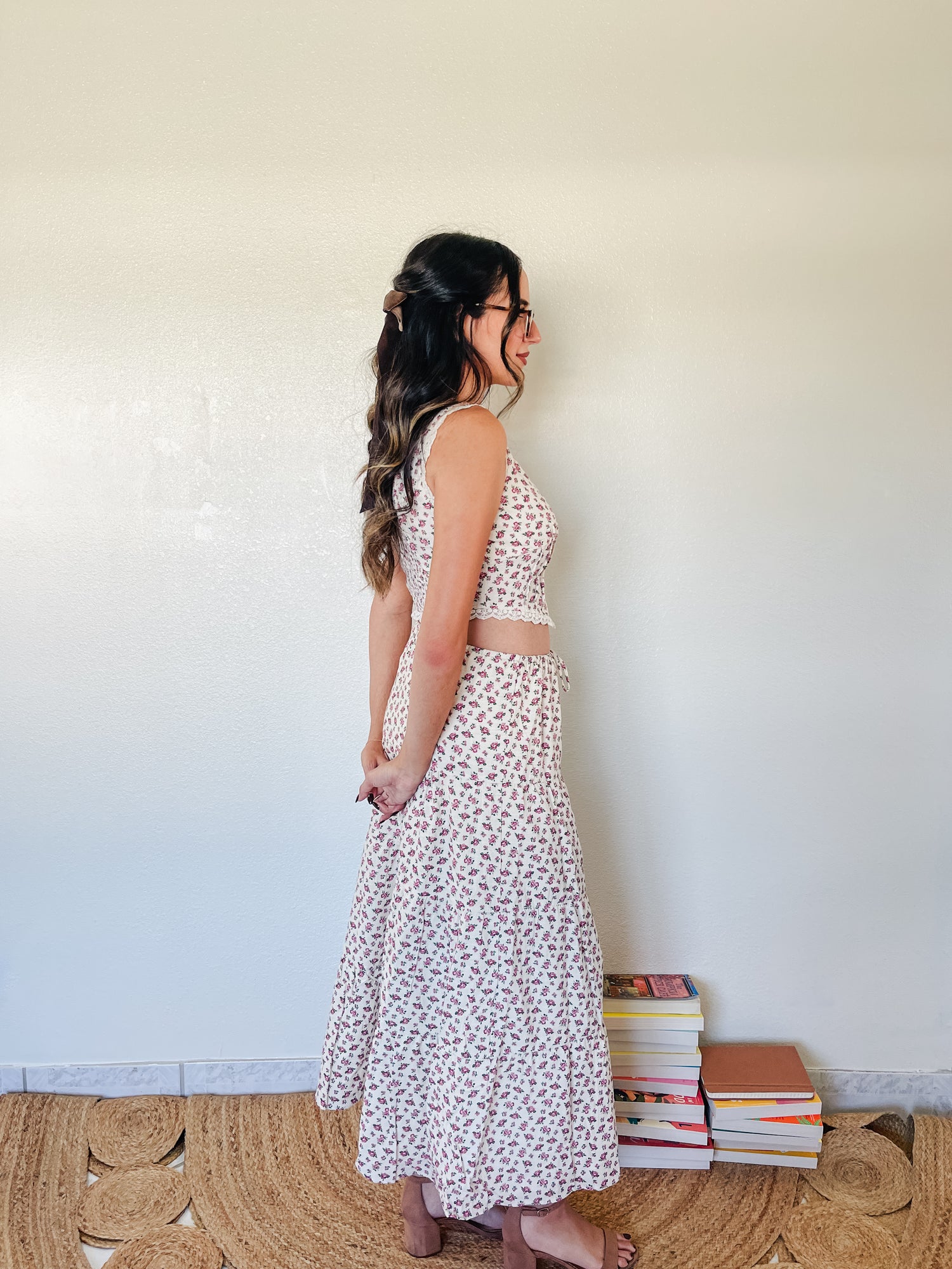 Top features vest style, hook-eye closure, floral print, lace detail on neckline and hem.