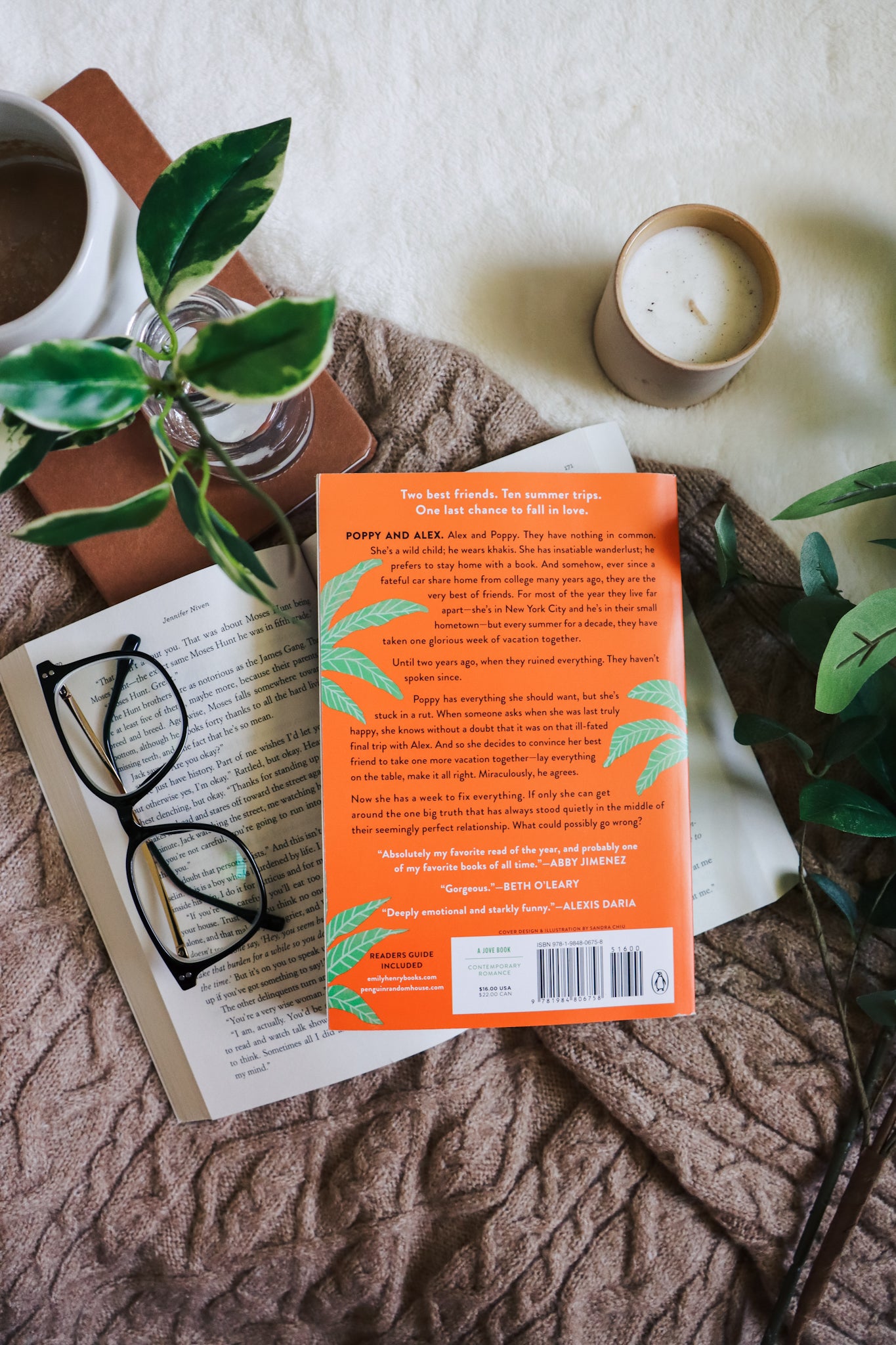 Poppy and Alex. Alex and Poppy. They have nothing in common. She’s a wild child; he wears khakis. She has insatiable wanderlust; he prefers to stay home with a book. And somehow, ever since a fateful car share home from college many years ago, they are the very best of friends. For most of the year they live far apart—she’s in New York City, and he’s in their small hometown—but every summer, for a decade, they have taken one glorious week of vacation together.