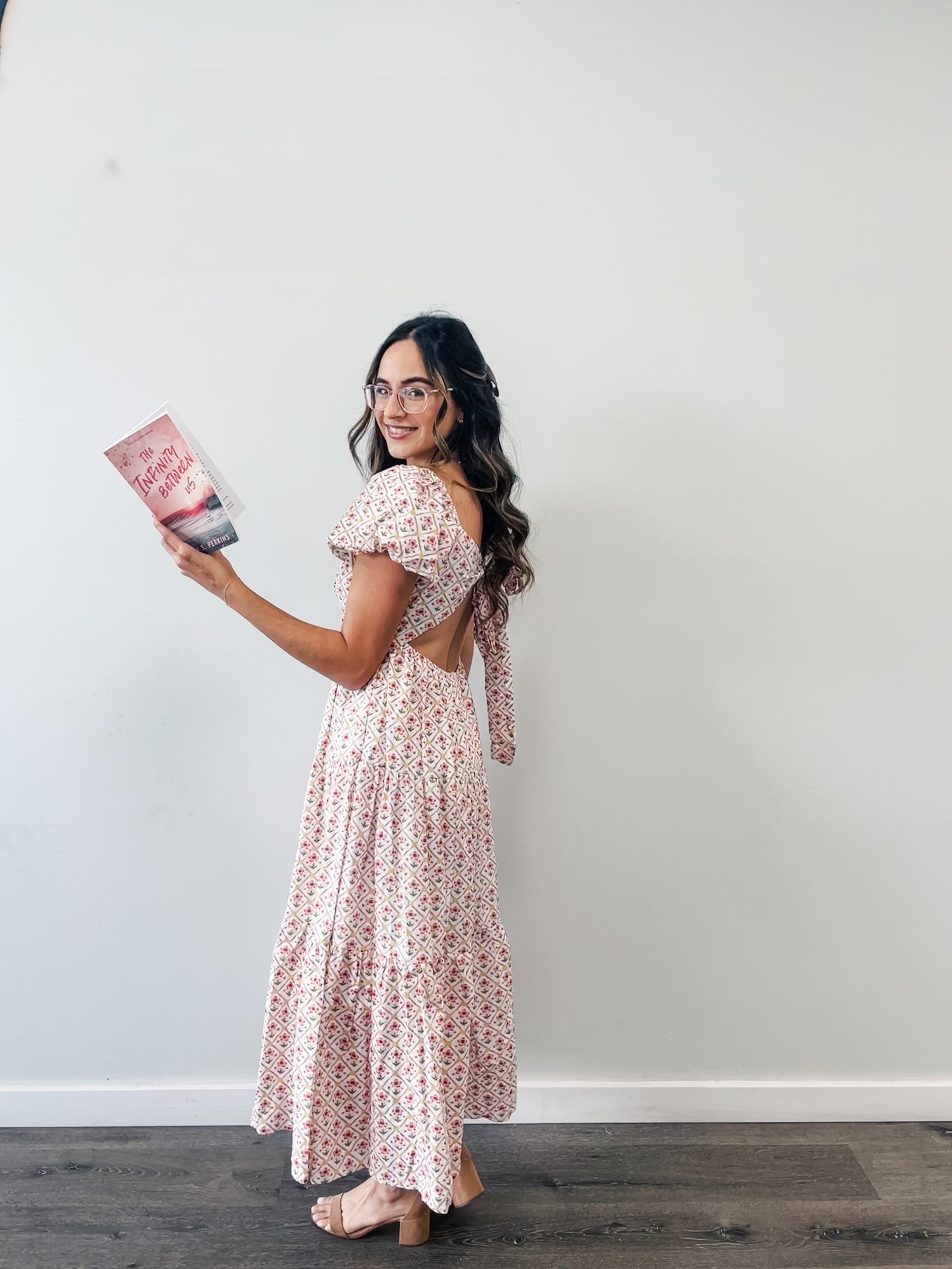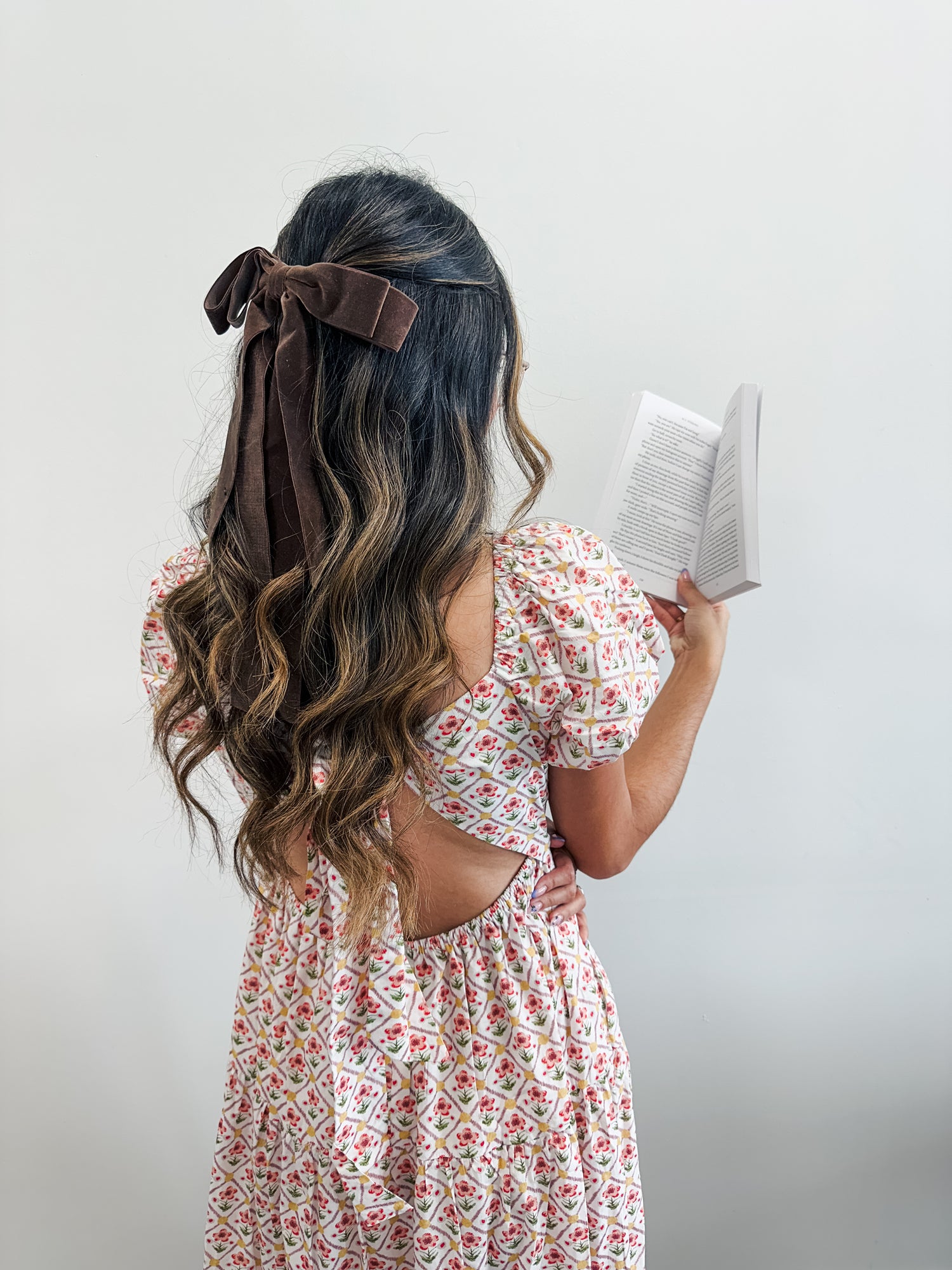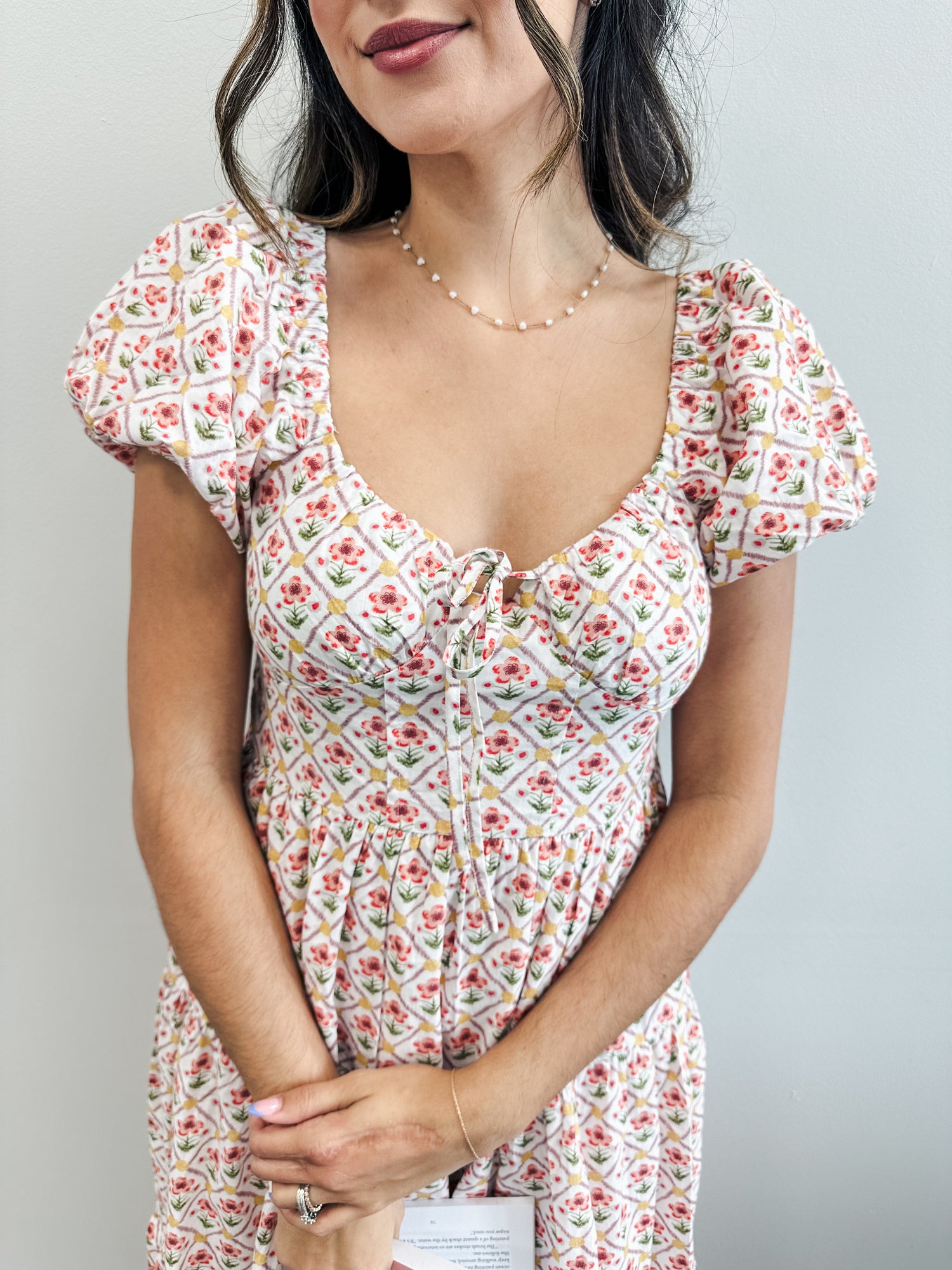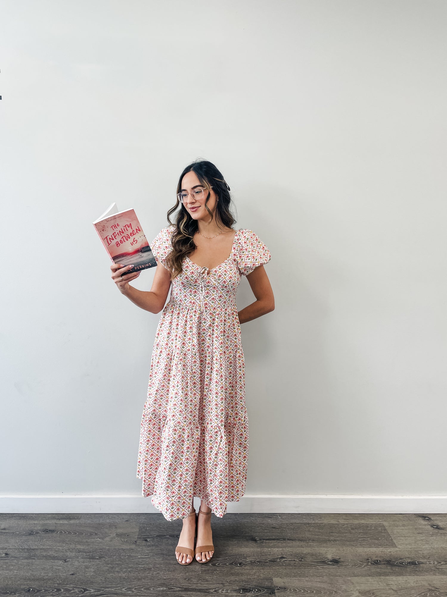 Dress features a floral maxi length, sweetheart neckline, cotton fabrication, side pockets, self tie bow in front, puff sleeves, back elastic waistband, hidden zipper and thick self tie ribbon in back. Lined.