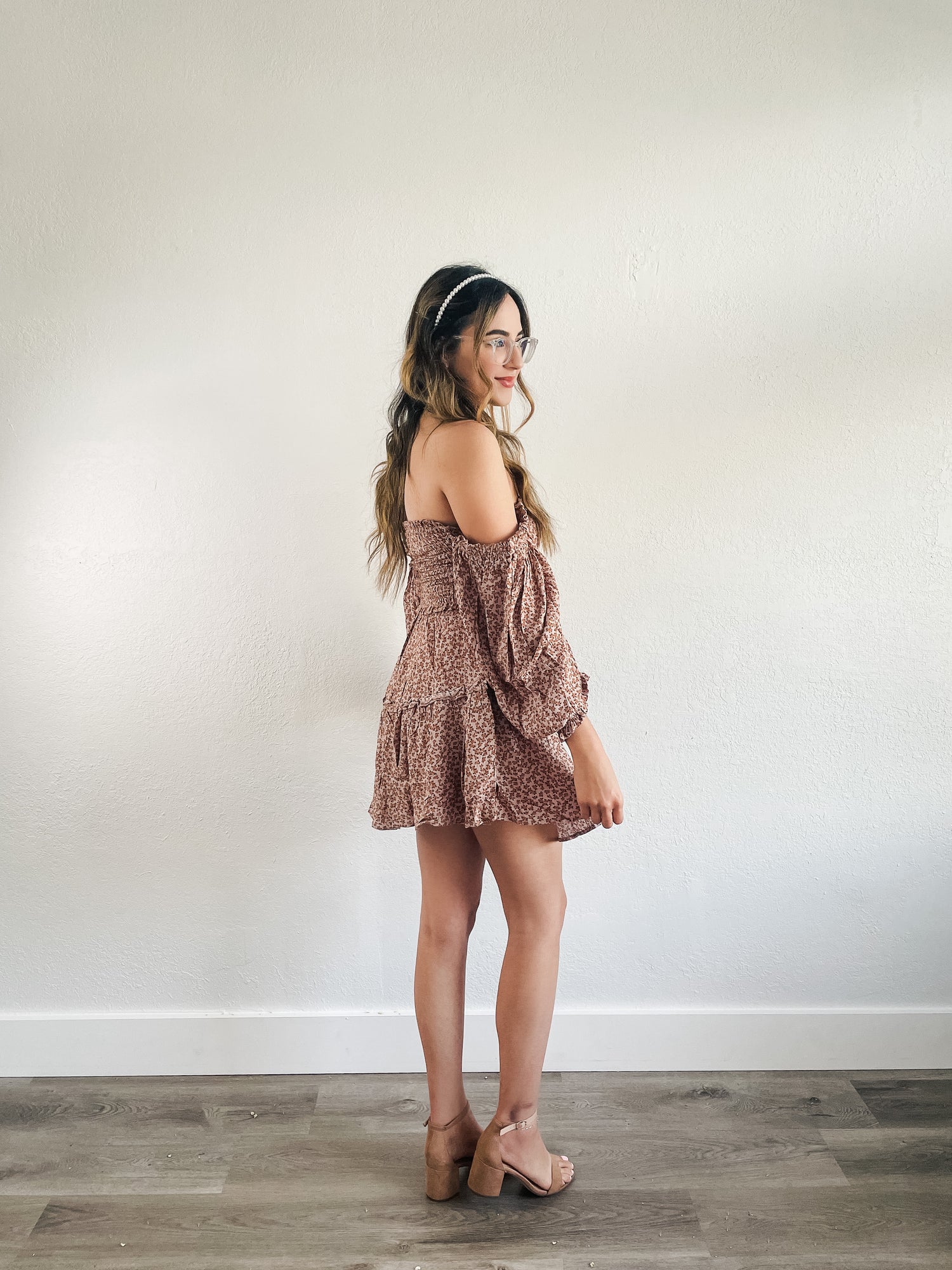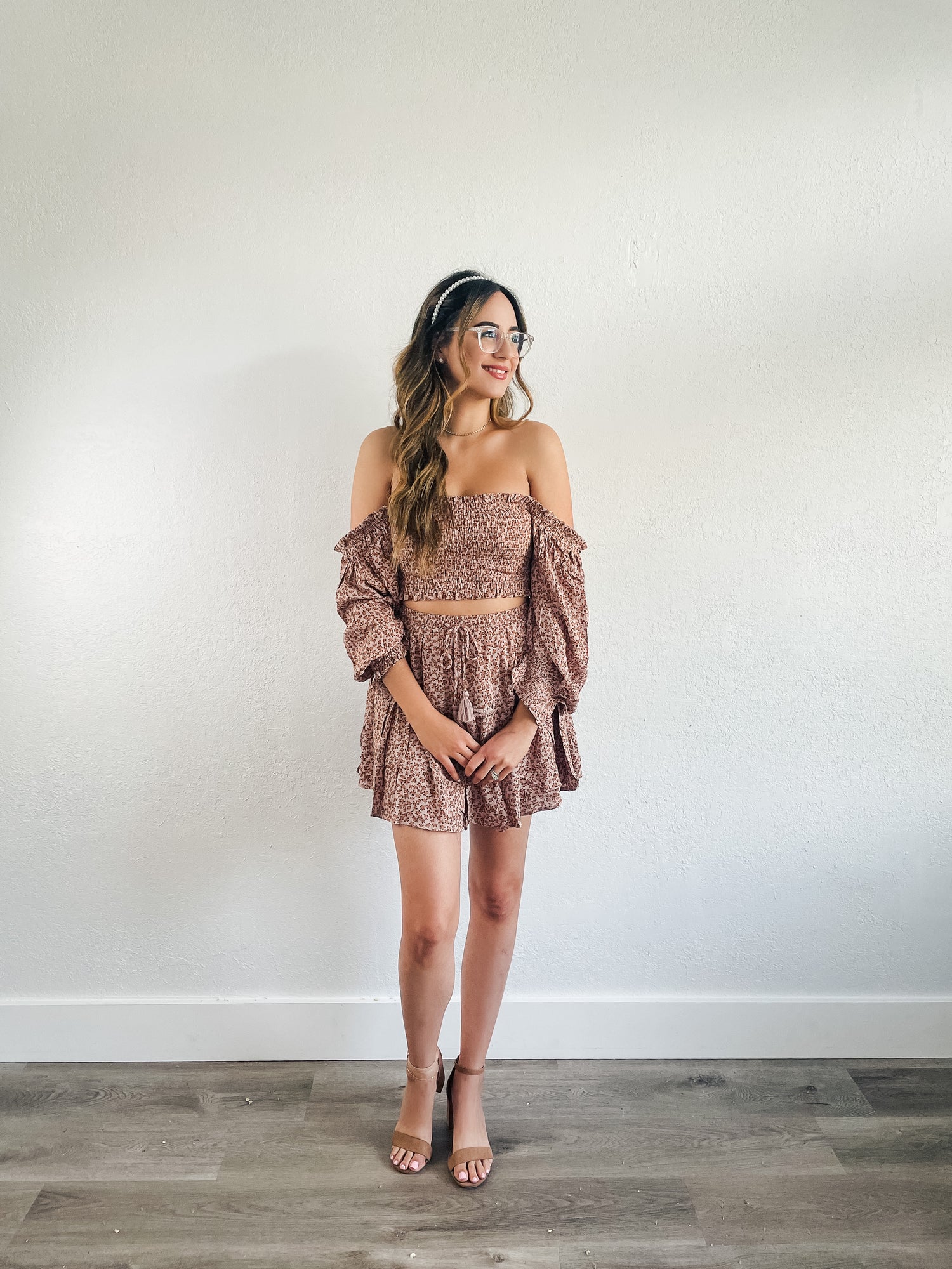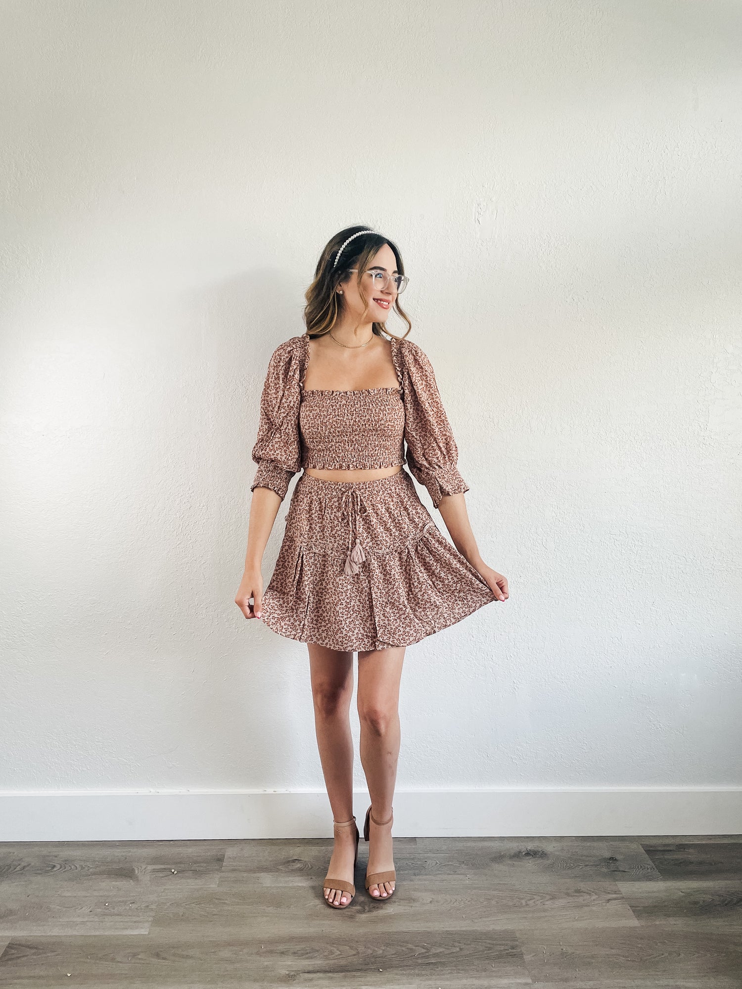 Set features smocked crop top with poppy floral and off the shoulder sleeves with ruffle trim. Miniskirt features a tassle tipped drawstring and ruffle trims.