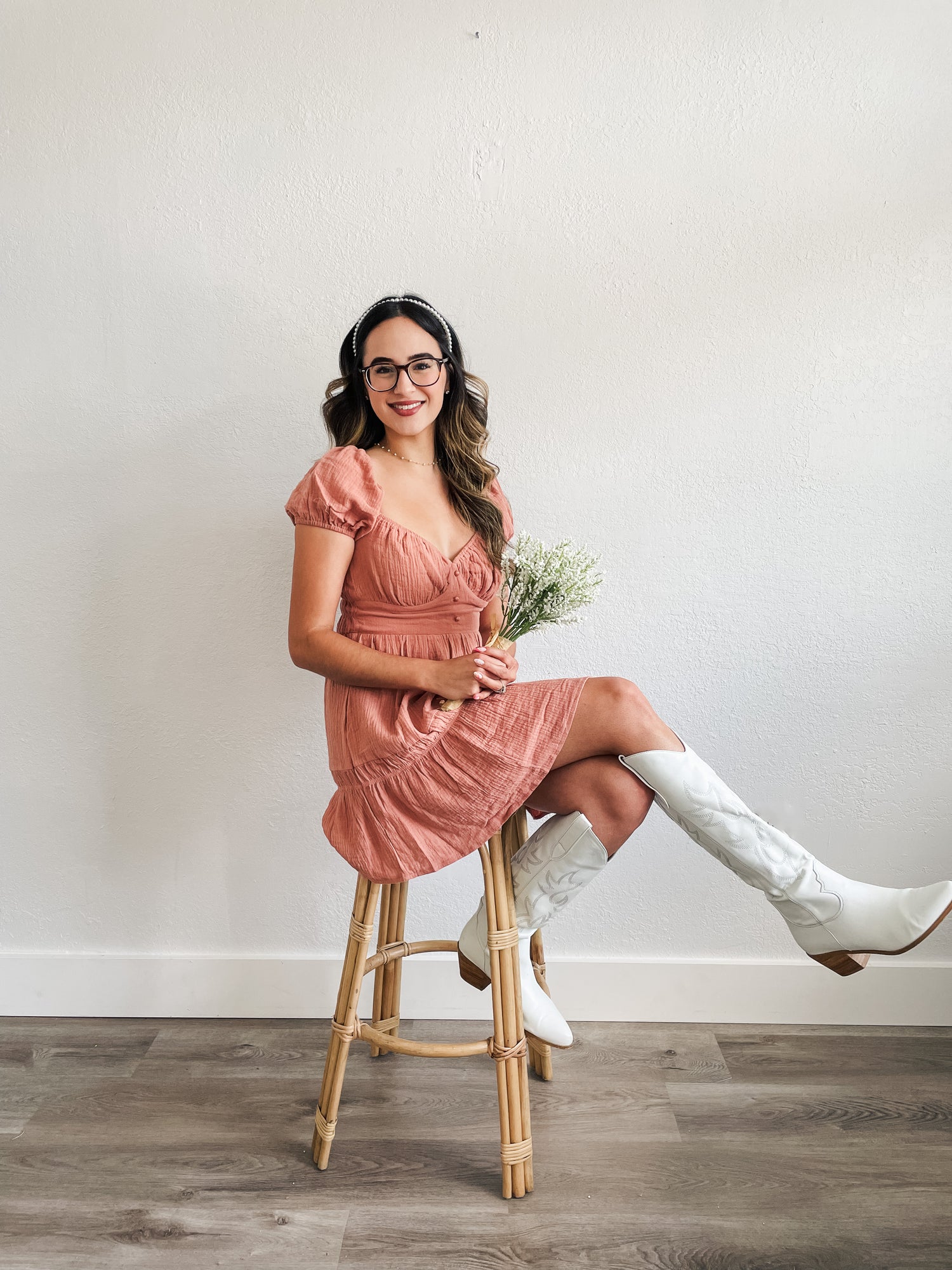 Dress features cotton gauze material, v-neckline, short puff sleeves, ruffled a-line and button detail.