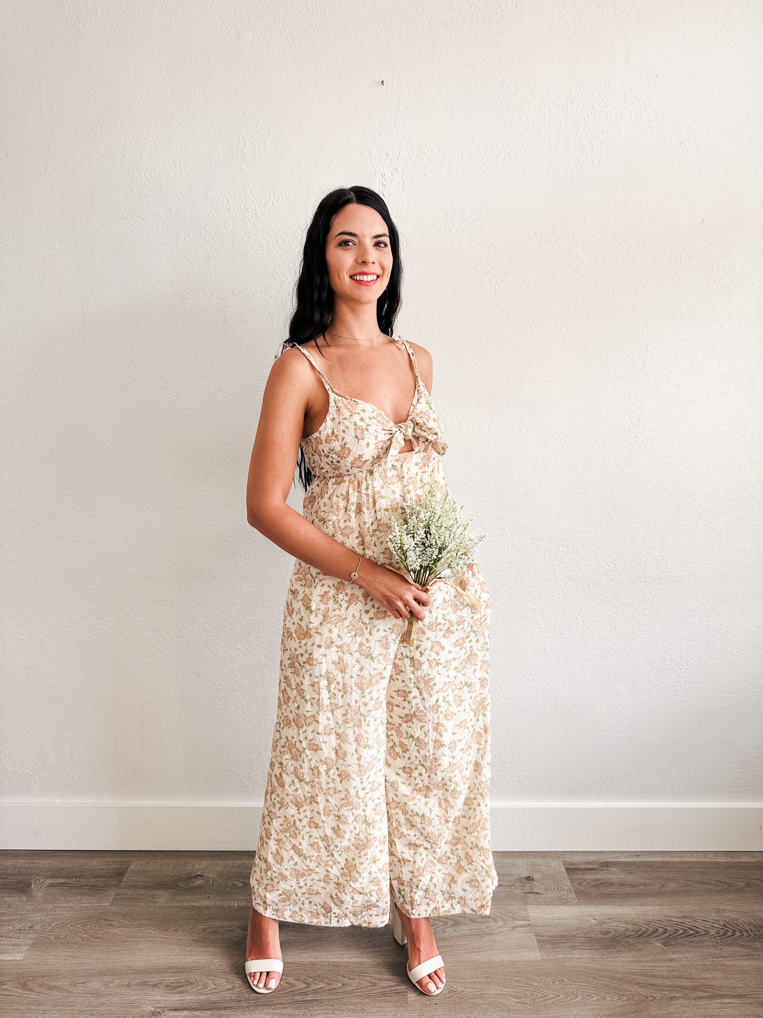 Jumpsuit features sweetheart neckline, wrapped front bow, self tie spaghetti straps, empire waist, side pockets and straight legs.