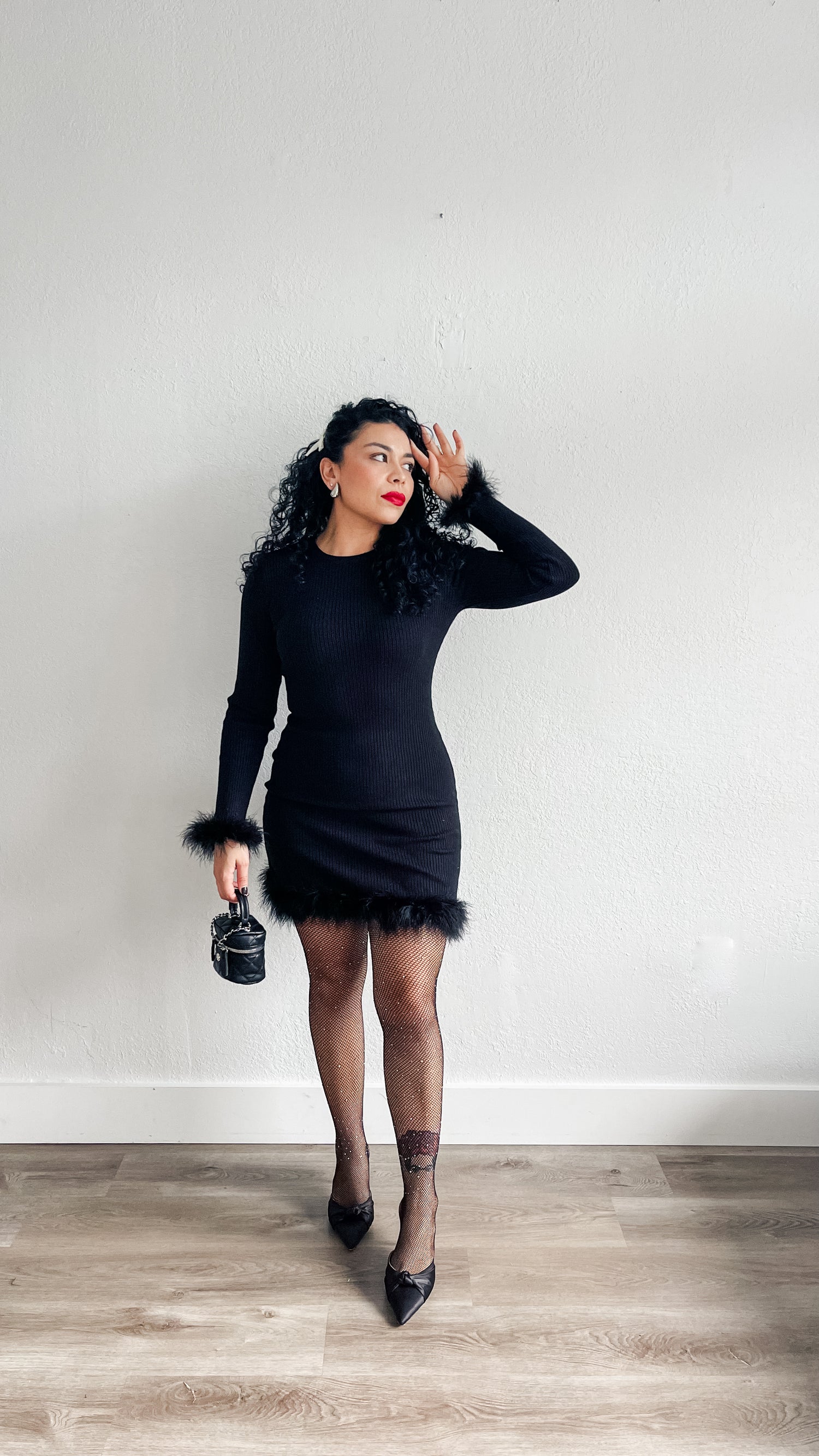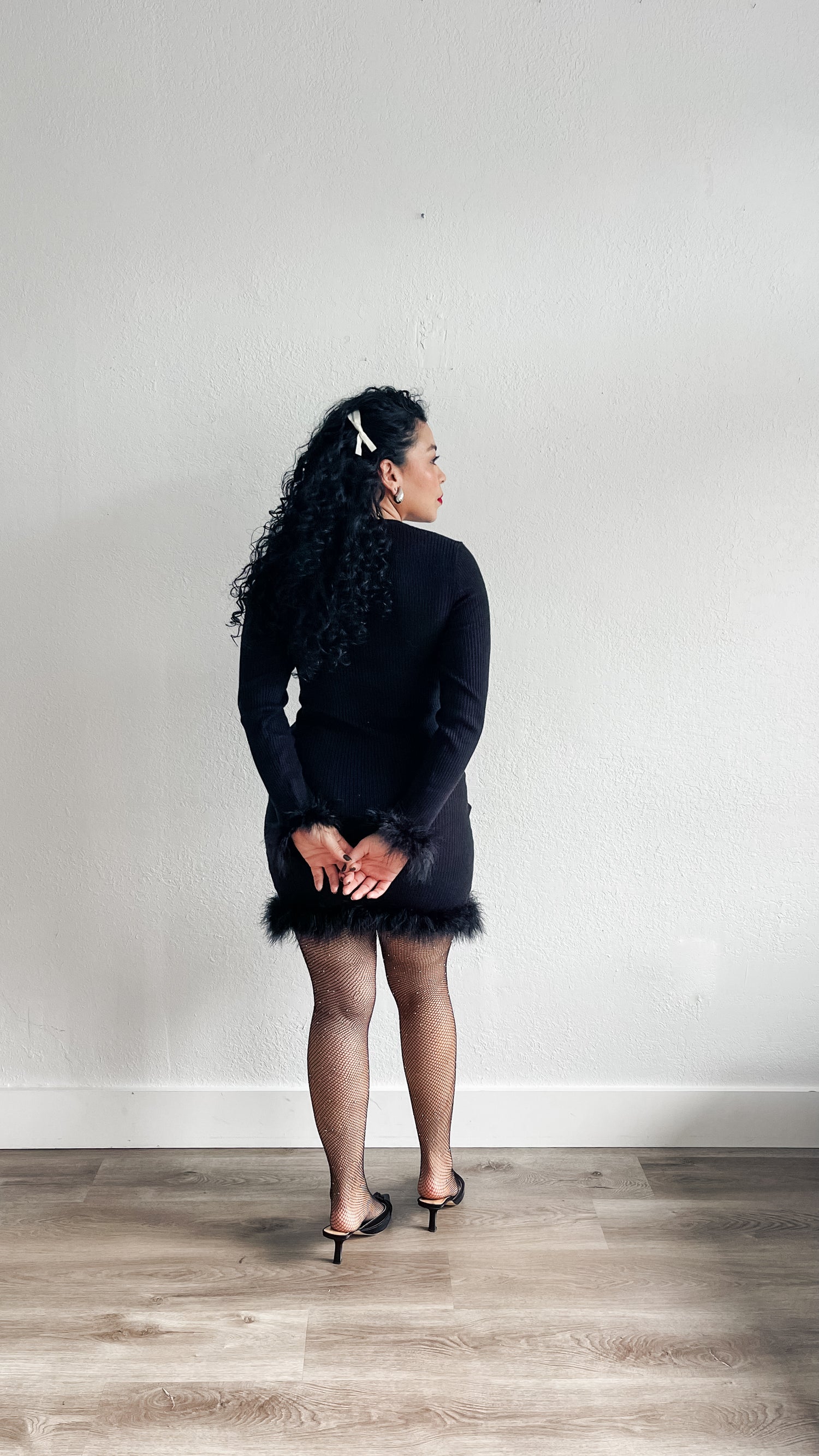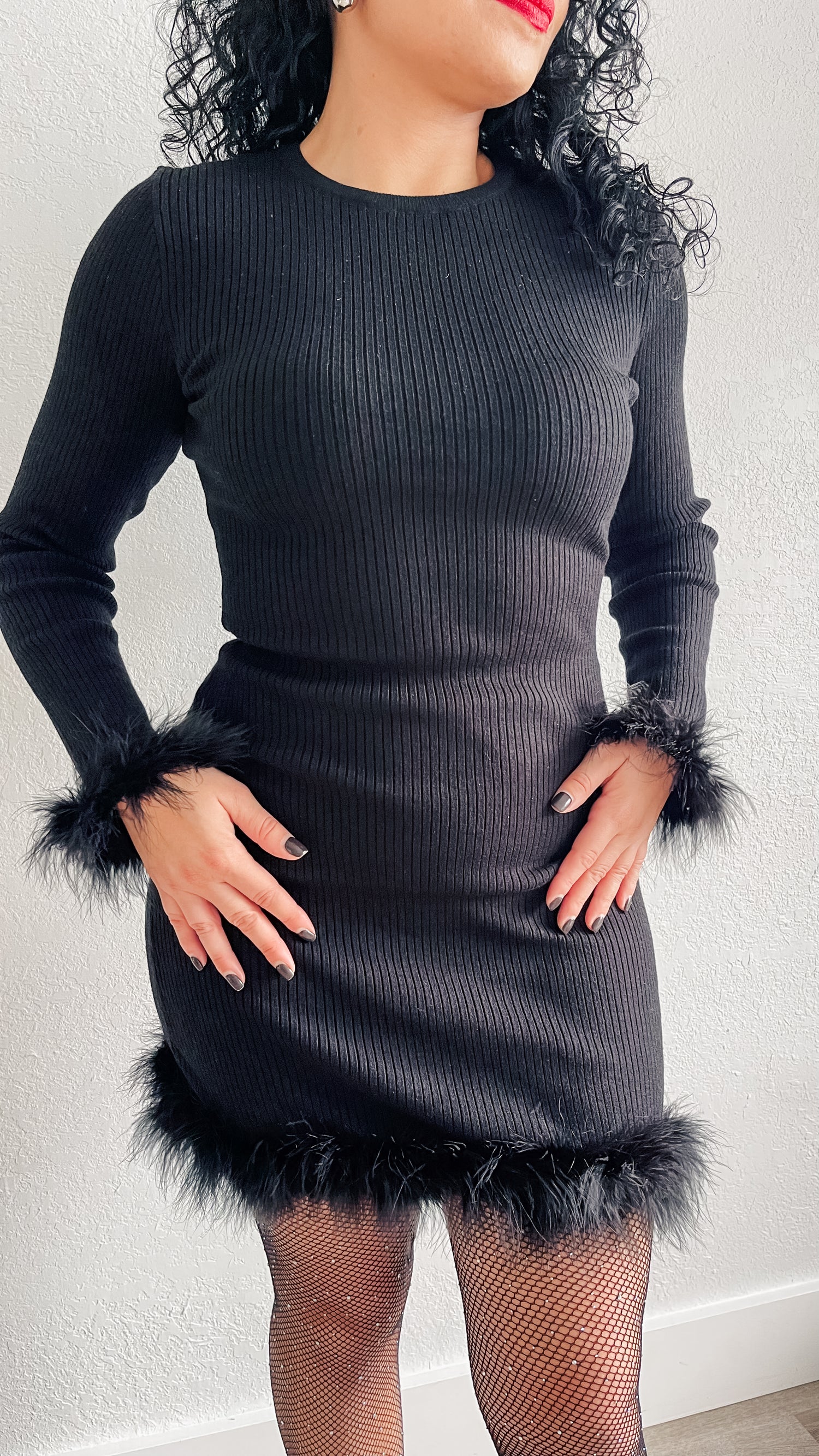 Dress features round neckline, long sleeve, feather cuff and hem, rib knit and mini length.