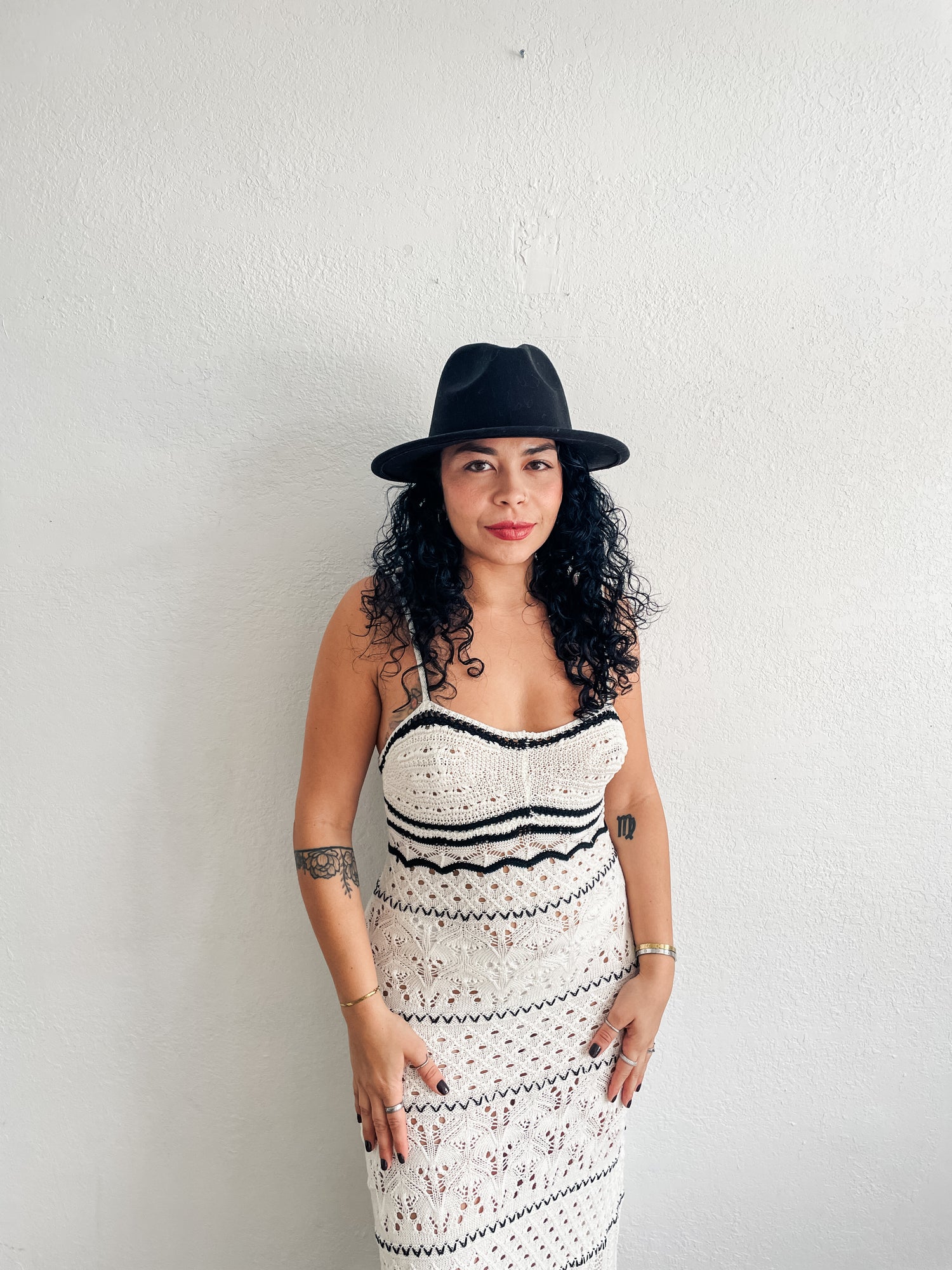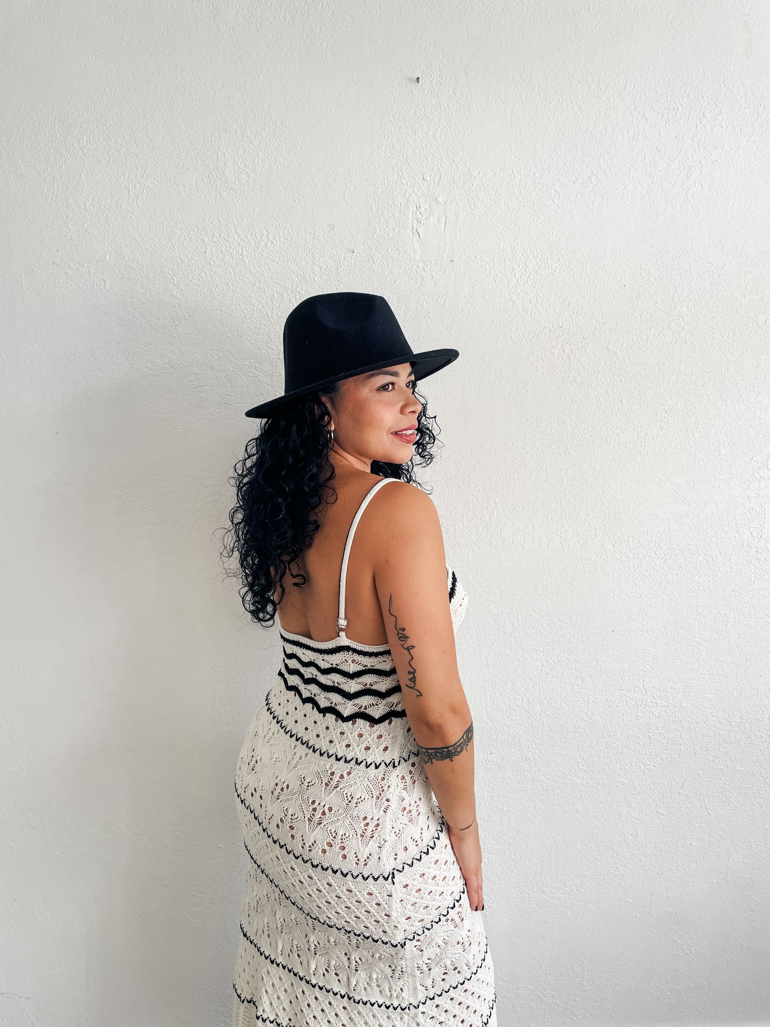 Dress features crochet material, sheer knitted fabric, maxi length and sleeveless. Is not lined. Suggested to wear nude undergarment or slip.