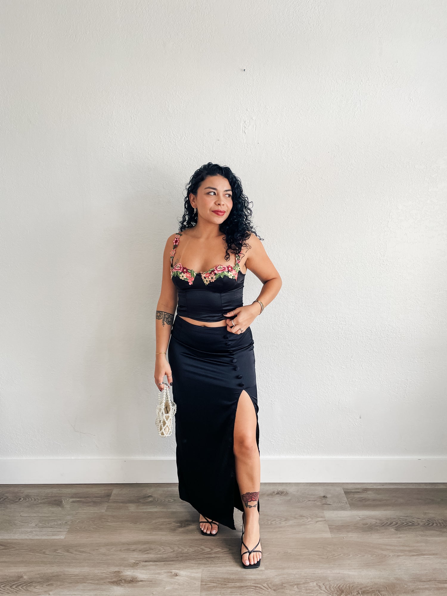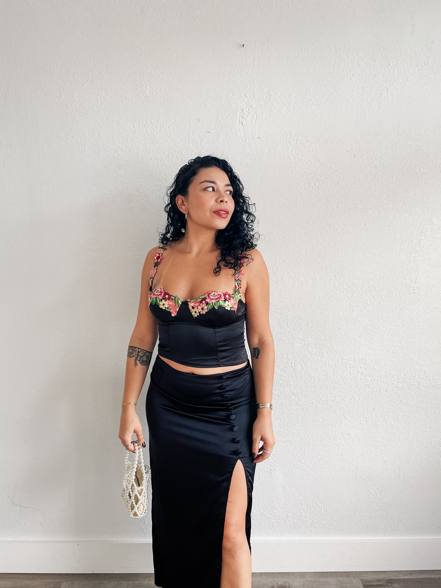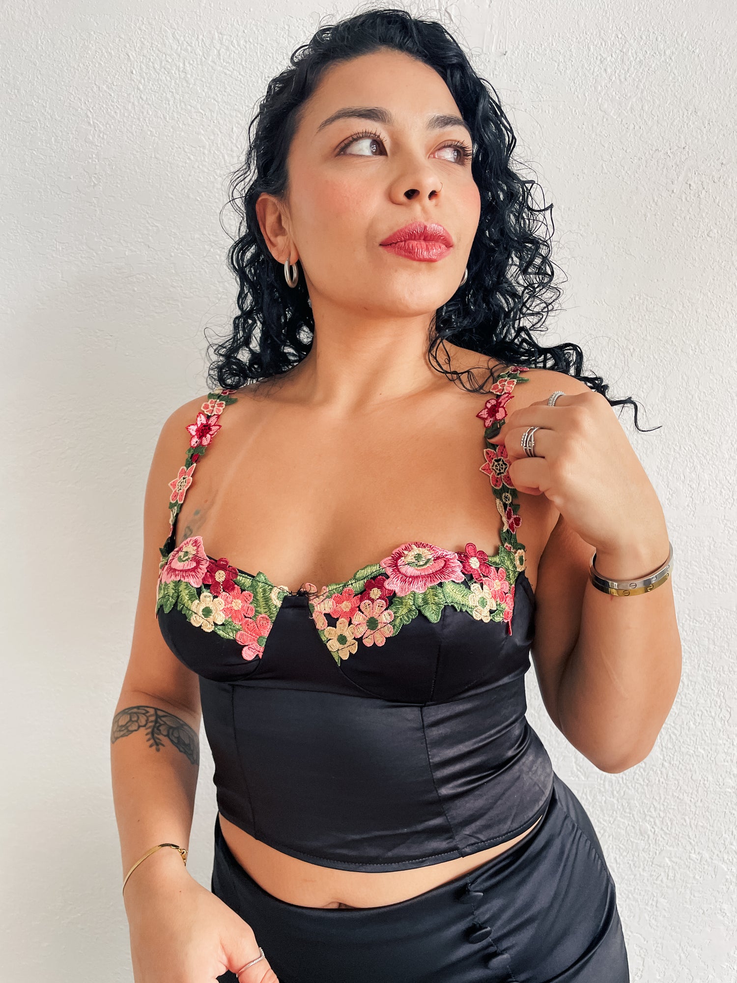 Top features floral embroidered neckline and straps, crop length top and back zipper. Satin Material