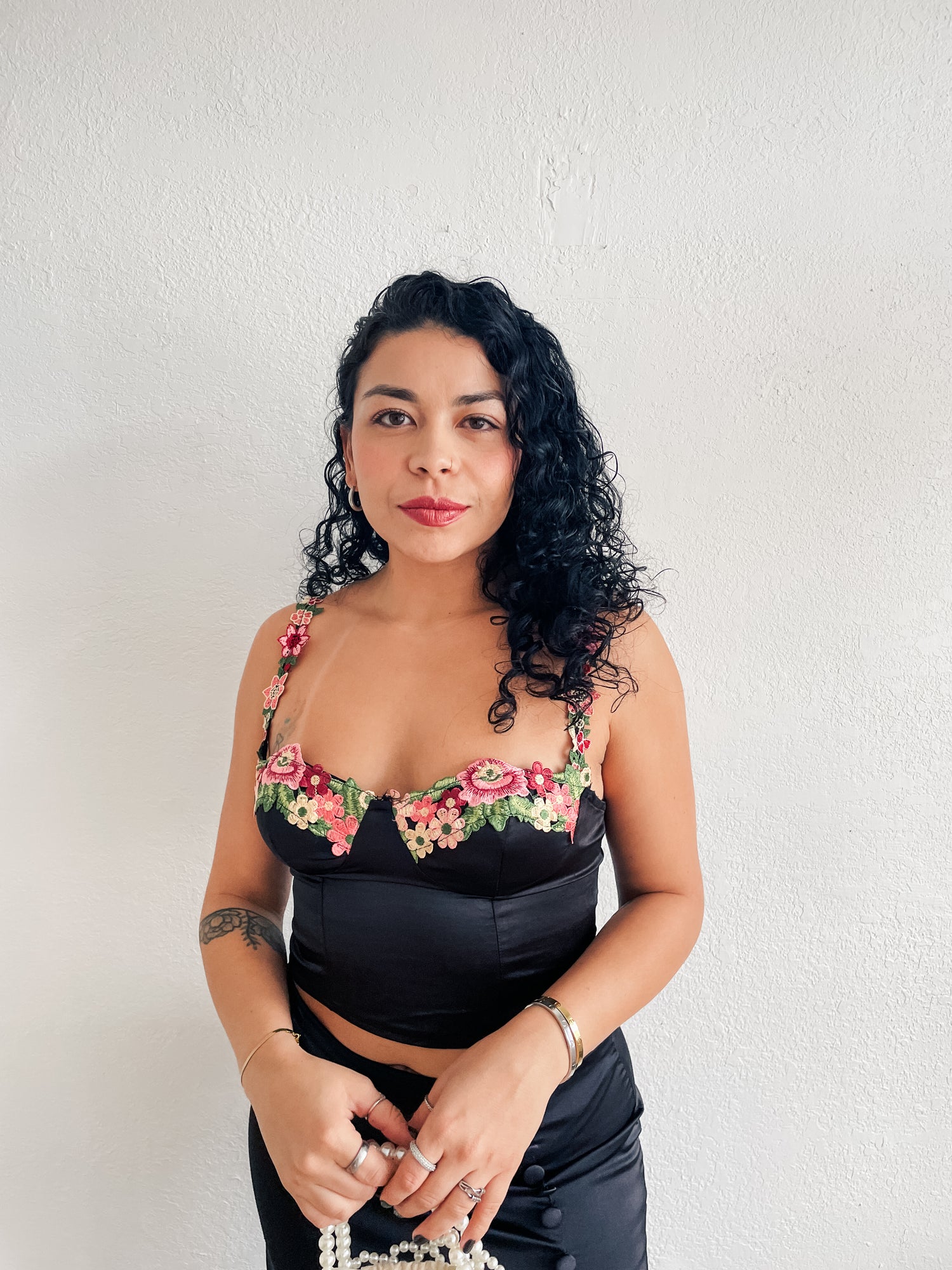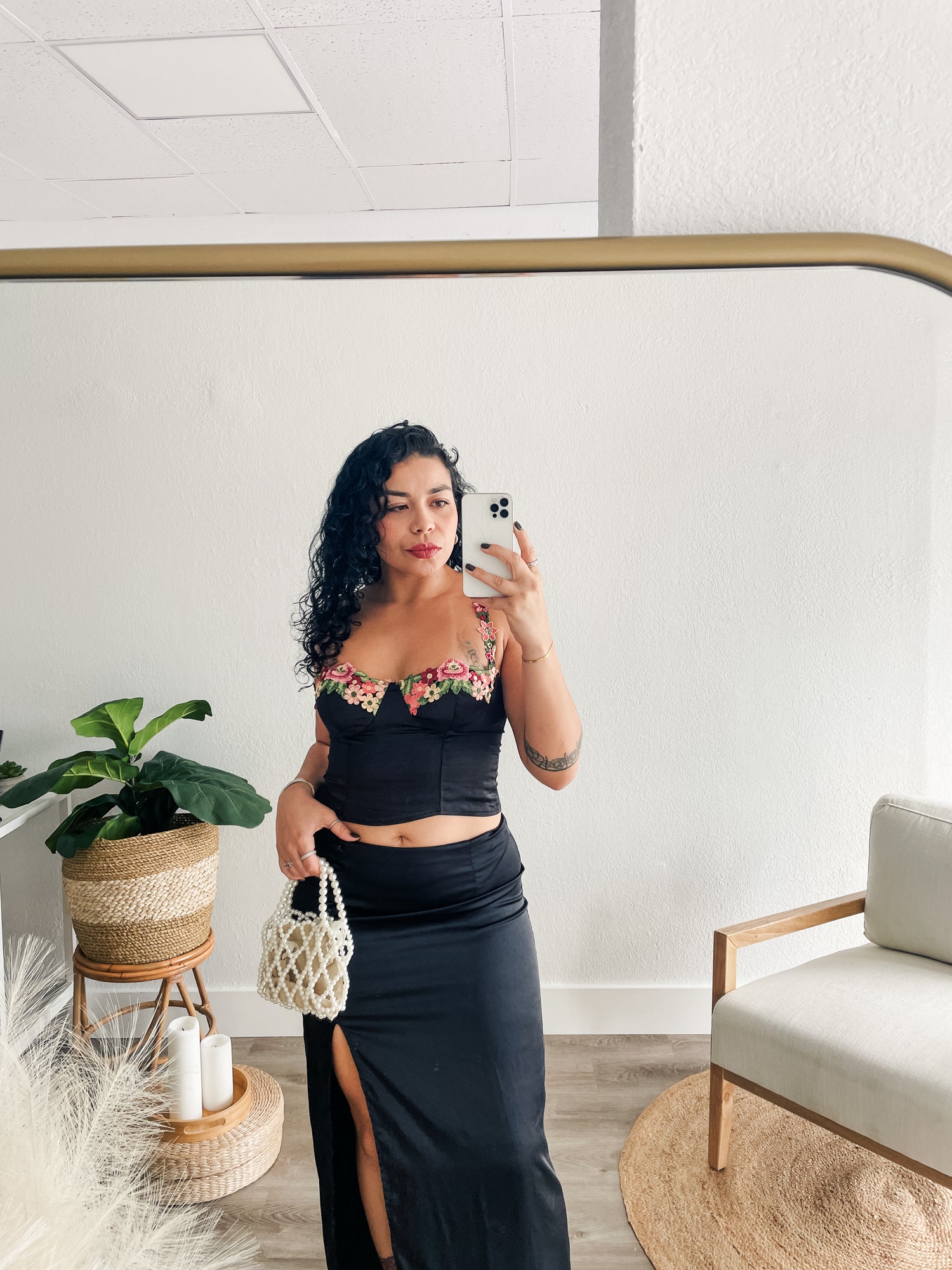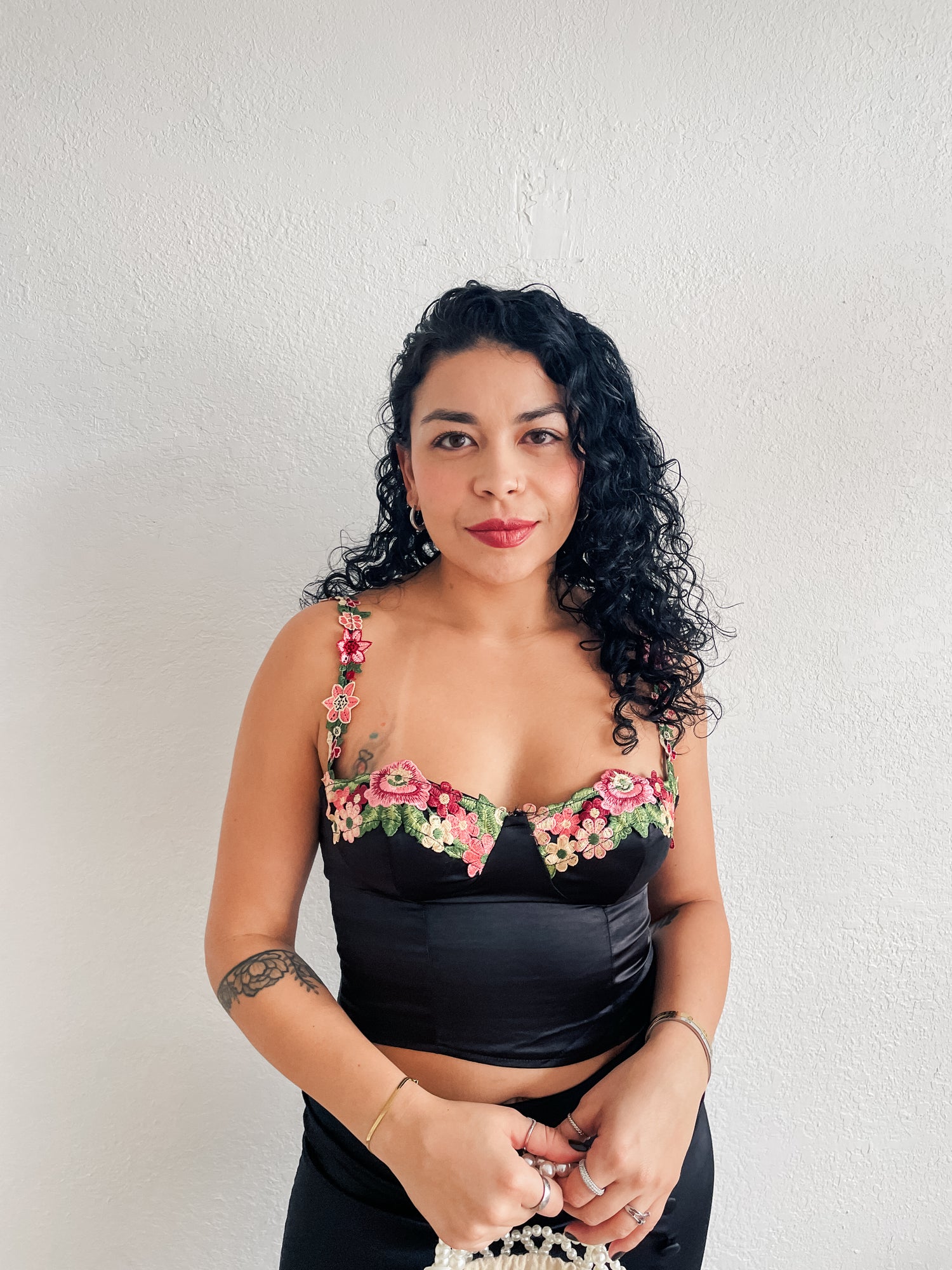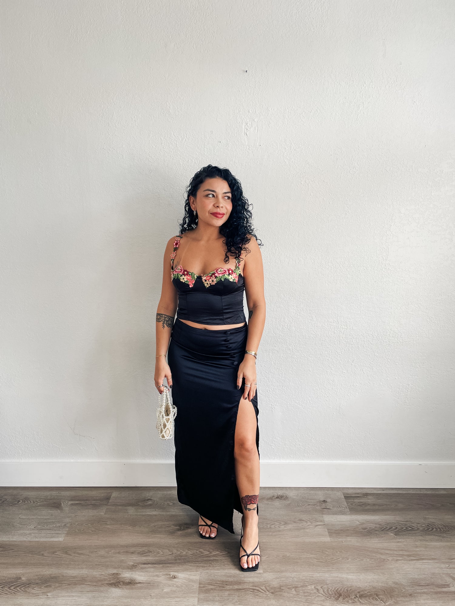 Top features floral embroidered neckline and straps, crop length top and back zipper. Satin Material